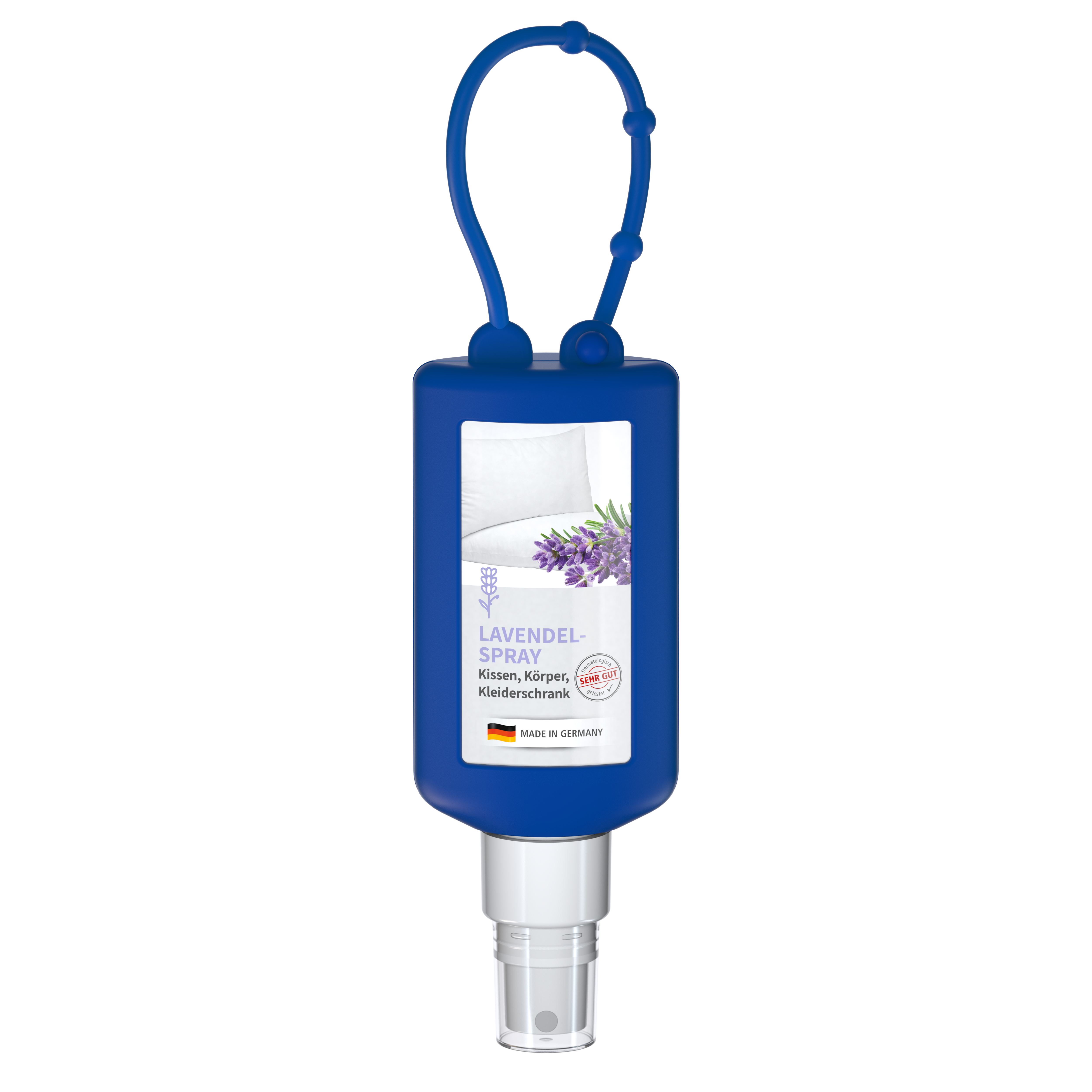 Praktische Kosmetikflasche zum Anhängen! Das Spray mit Silikonhülle ist nicht nur optisch ein echter Hingucker! Raffiniert mit Schlaufe zum an de Strandtasche, den Wander-Rucksack, den Ski-Anorak oder an den Kinderwagen. 50 ml PET Flasche (weiß) mit weißem Pumpaufsatz und transparenter Schutzkappe; Silikonhülle und Schlaufe in Nachfüllbar. Flasche hergestellt aus 100% recyceltem PET, weiß mit leichter R-PET-Färbung. Lavendel-Spray für Kopfkissen, Kleiderschrank und Körper Das Lavendel-Spray mit natürlichem Lavendelöl fördert einen ruhigen und erholsamen Schlaf. Mit der Kraft des ätherischen Öls dürfen Körper und Geist gleichermaßen entspannen. Es beruhigt die Seele, hilft beim Loslassen und Einschlafen. Zur Anwendung auf dem Kopfkissen, als Raumspray oder für den Kleiderschrank. Auch als erfrischendes Körperspray geeignet. • Mit natürlichem Lavendelöl • Vegan • Ohne Konservierungsstoffe • Dermatologisch getestet "Sehr gut hautverträglich" • Hergestellt in Deutschland Dekoration: Body Label: Etikett PE (weiß), Druck 4c CMYK. Wahlweise glänzend oder matt.
