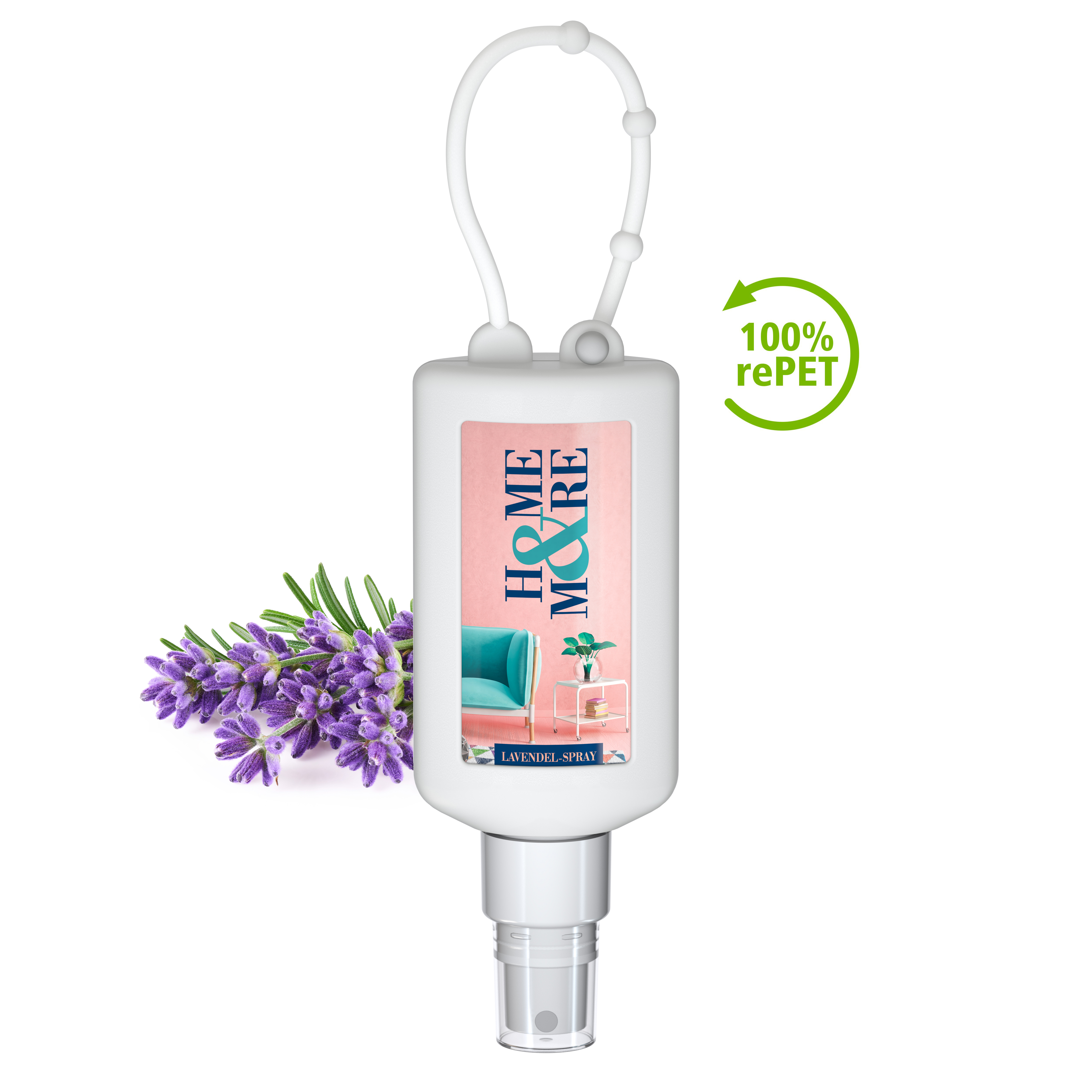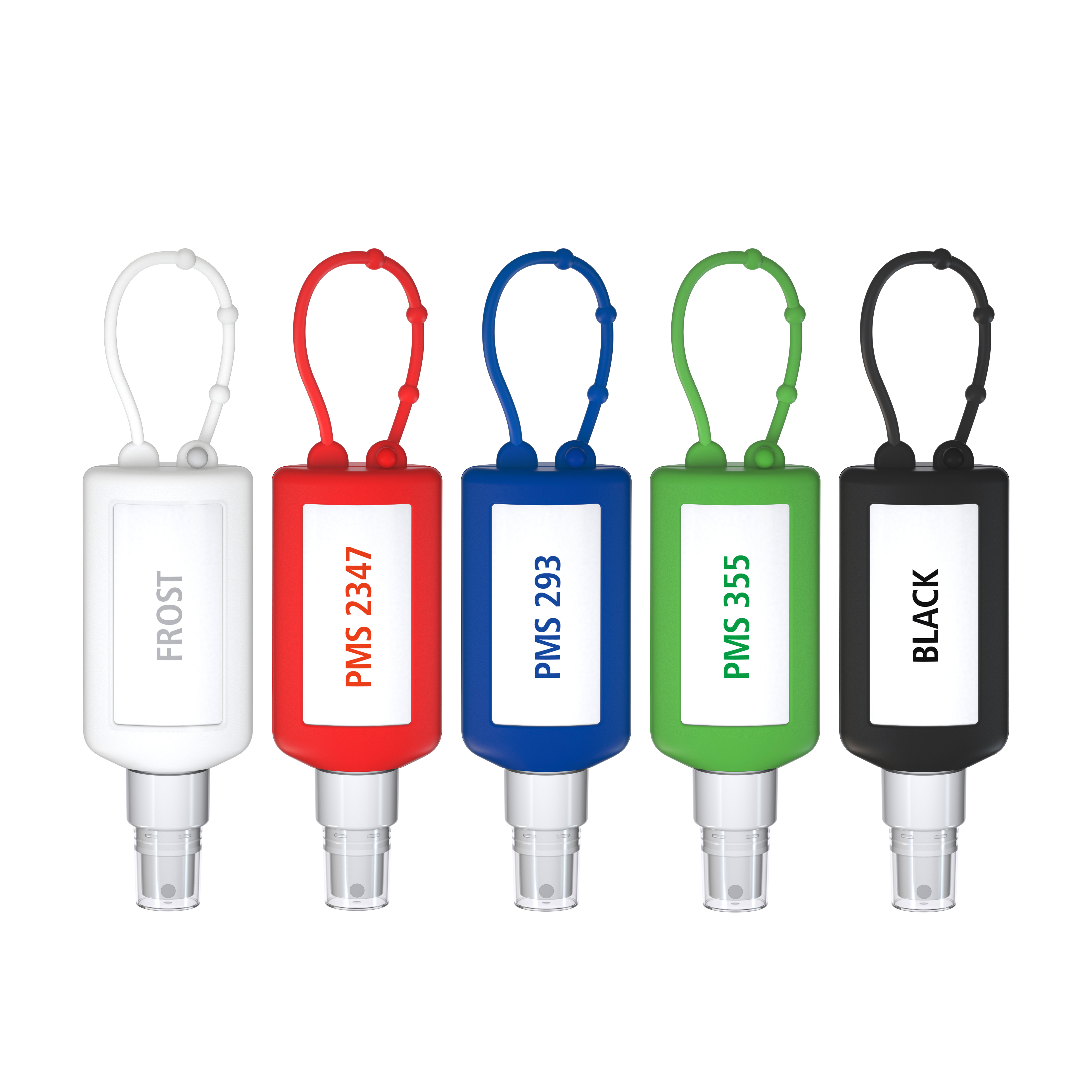 Praktische Kosmetikflasche zum Anhängen! Das Spray mit Silikonhülle ist nicht nur optisch ein echter Hingucker! Raffiniert mit Schlaufe zum Anhängen an de Strandtasche, den Wander-Rucksack, den Ski-Anorak oder an den Kinderwagen. 50 ml PET Flasche (weiß) mit weißem Pumpaufsatz und transparenter Schutzkappe; Silikonhülle und Schlaufe in Nachfüllbar. Flasche hergestellt aus 100% recyceltem PET, weiß mit leichter R-PET-Färbung. Das Reinigungsspray entfernt materialschonend Verschmutzungen von Smartphone und Tablet sowie allen anderen Oberflächen am Arbeitsplatz. Es ist bestens geeignet für die schnelle und unkomplizierte Reinigung von Maus, Tastatur, Telefon, Laptop und Tischplatte. Anwendung ohne Wasser: Aufsprühen, kurz einwirken lassen und mit einem Tuch abwischen. Der Reiniger hinterlässt einen angenehmen, frischen Zitronenduft und einen matten Glanz. • Lösemittelfrei • Native Rohstoffe • Biologisch abbaubar • Vegan • Hergestellt in Deutschland Dekoration: Body Label: Etikett PE (weiß), Druck 4c CMYK. Wahlweise glänzend oder matt.