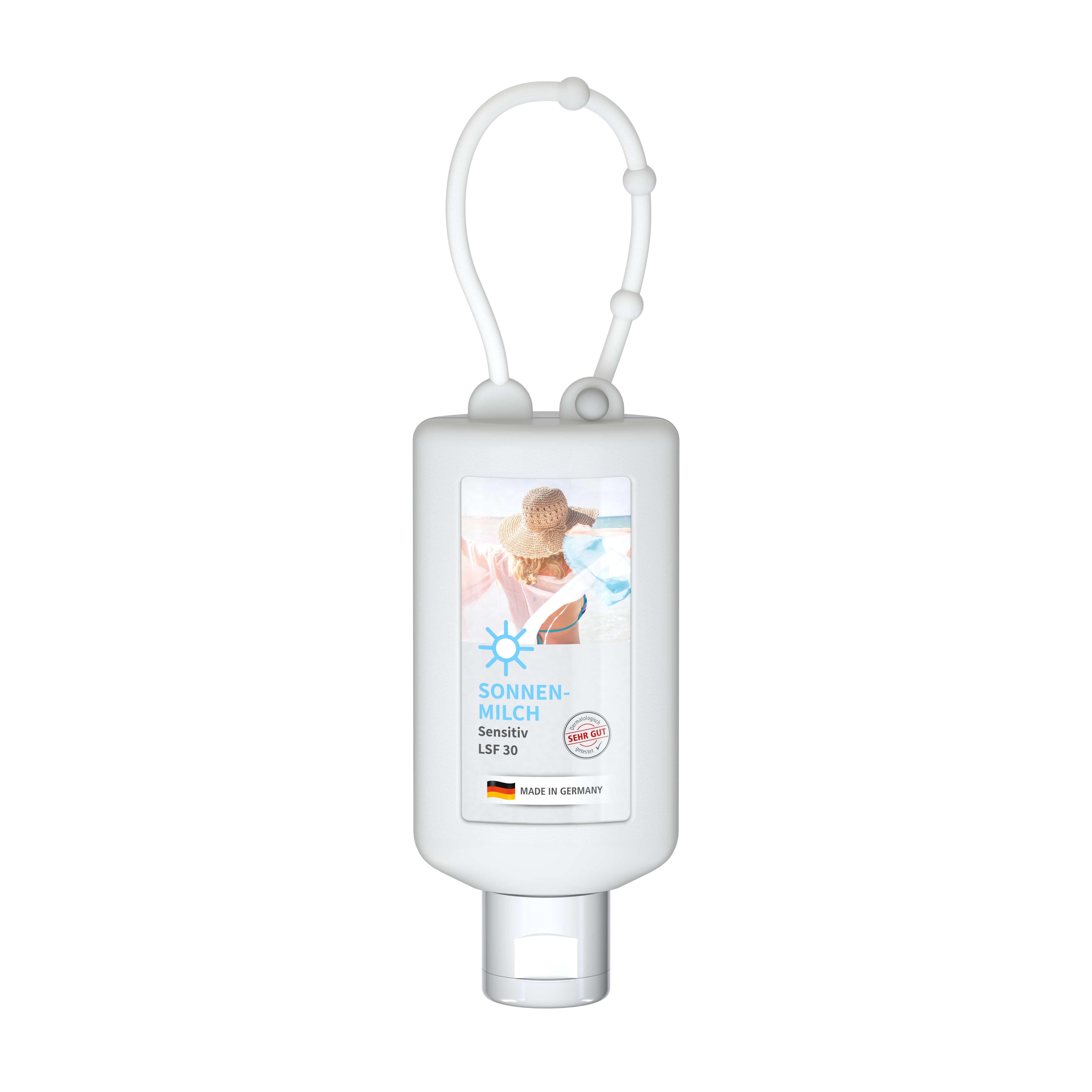 Praktische Kosmetikflasche zum Anhängen! Das Fläschchen mit Silikonhülle ist nicht nur optisch ein echter Hingucker! Raffiniert mit Schlaufe zum die Badetasche, den Rucksack oder den Kinderwagen. 50 ml Flasche und Klappdeckel (zufällig ausgerichtet) weiß; Silikonhülle und Schlaufe in Nachfüllbar. Flasche hergestellt aus 100% recyceltem PET, weiß mit leichter R-PET-Färbung. Sensitive Sonnenmilch - LSF 30, parfümfrei ohne Duftstoffe (Hohes Schutzniveau). Wasserfeste und schnell einziehende Sonnencreme mit Vitamin E und Glycerin für 24-Stunden-Langzeitfeuchtigkeit. Sofortschutz mit ausgewogenem UVA- / UVB-Breitbandfilter. • Ohne Octocrylene • Nanofrei, vegan • Kein Mikroplastik • Keine Parabene, Mineralöle, Silikone • Korallenfreundlich gemäß Hawaii-Riffgesetz • Klinisch und dermatologisch getestet "Sehr gut hautverträglich" • Hergestellt in Deutschland Dekoration: Body Label: Etikett PE (weiß) auf Vorder- und Rückseite, Druck 4c CMYK. Wahlweise glänzend oder matt.