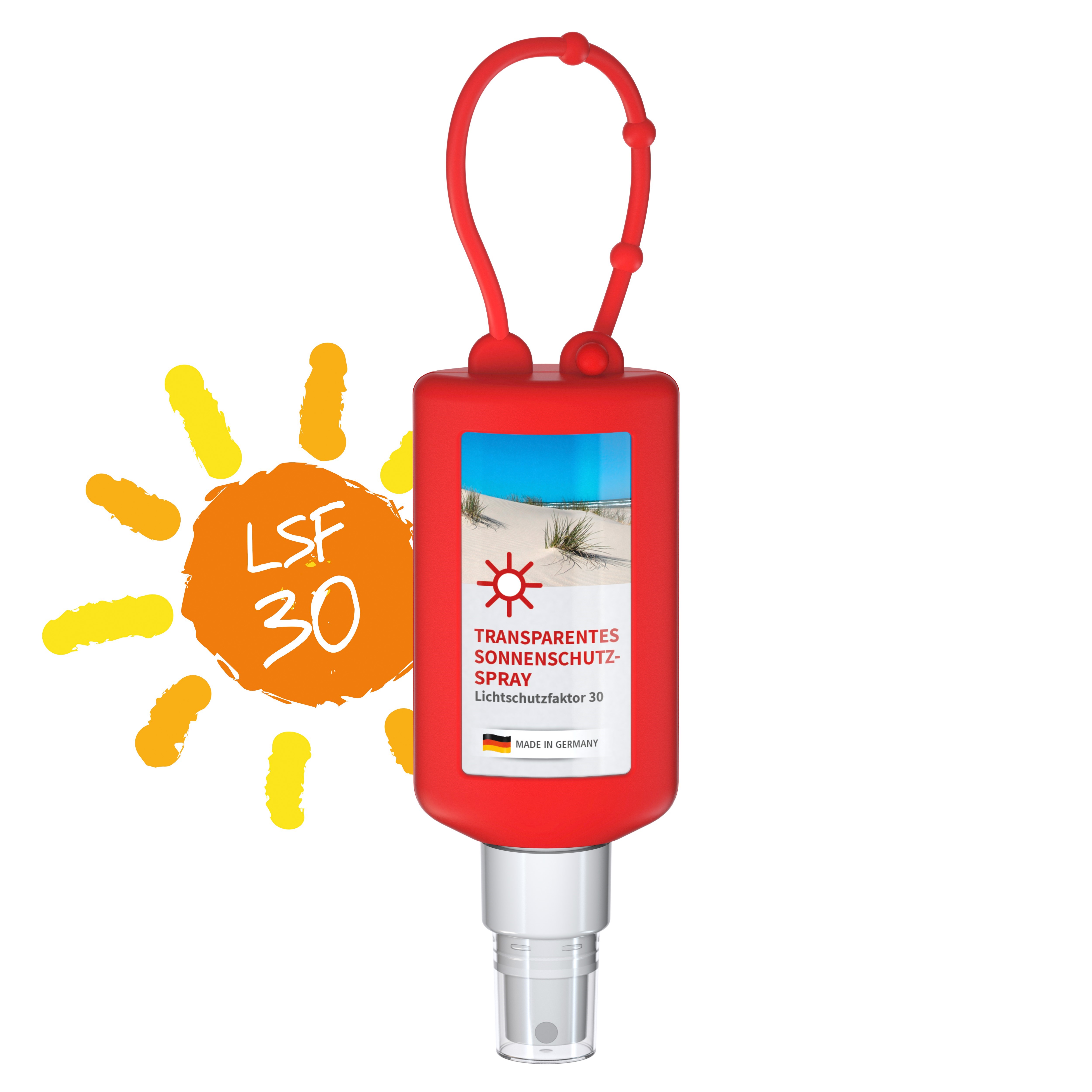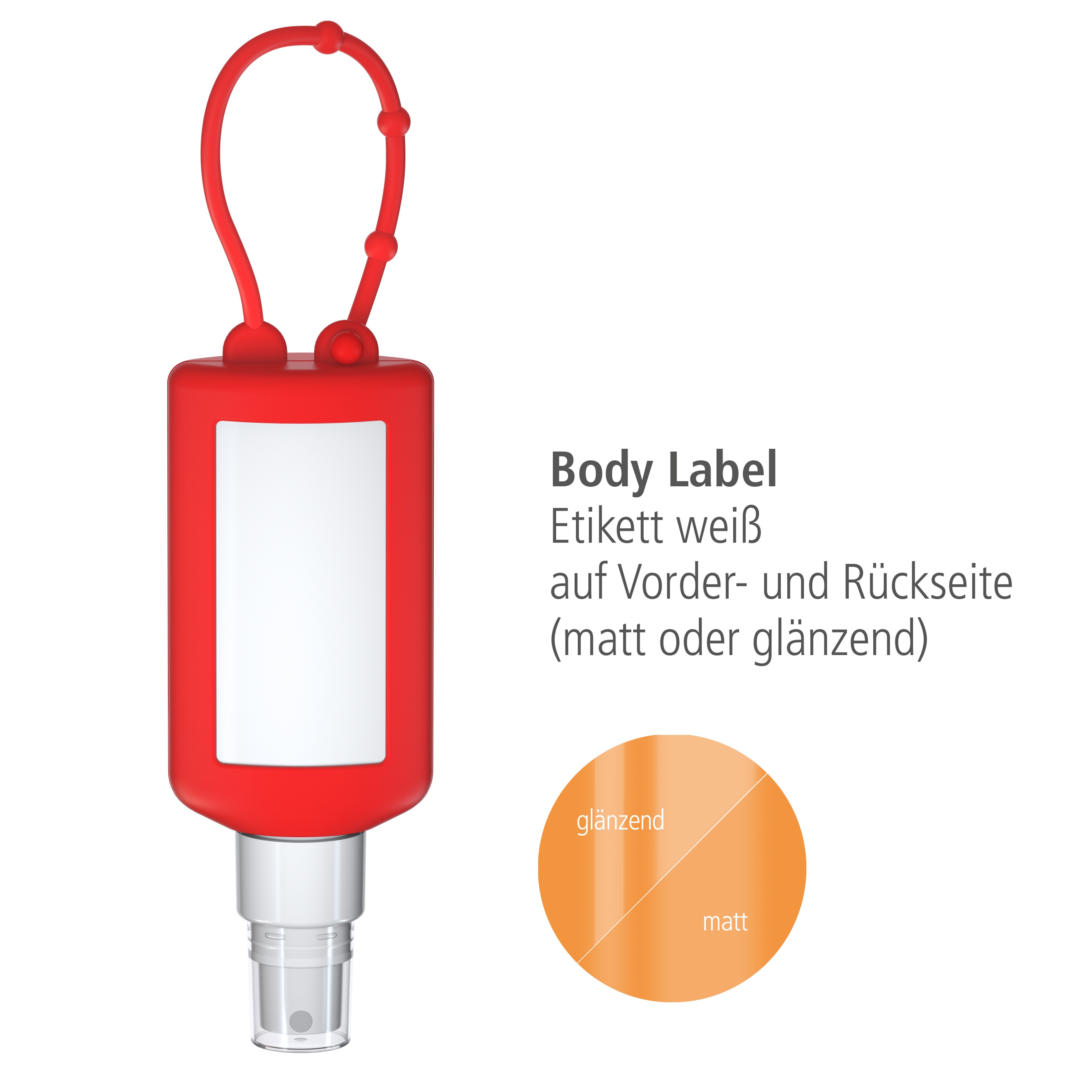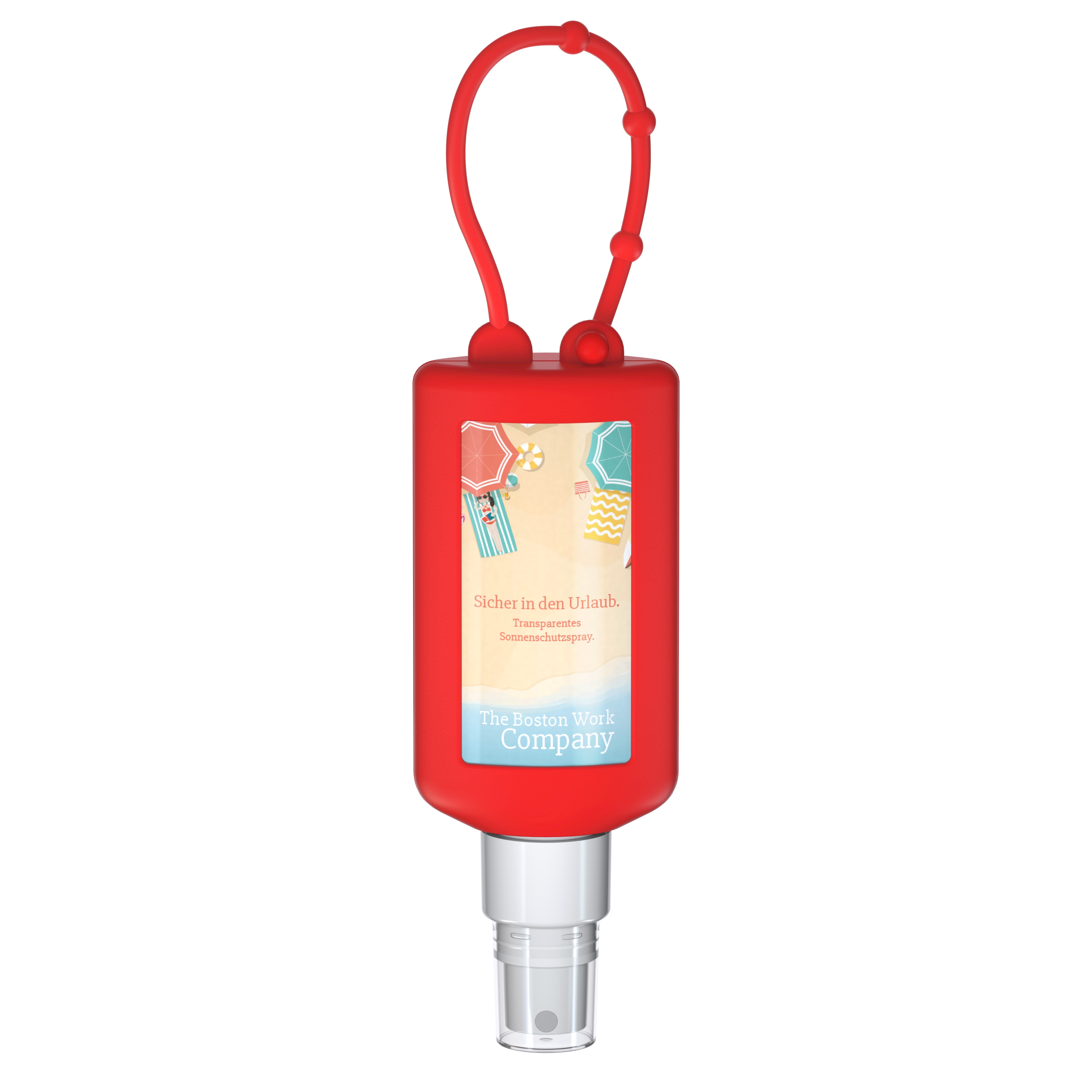 Praktische Kosmetikflasche zum Anhängen! Das Spray mit Silikonhülle ist nicht nur optisch ein echter Hingucker! Raffiniert mit Schlaufe zum an de Strandtasche, den Wander-Rucksack, den Ski-Anorak oder an den Kinderwagen. 50 ml PET Flasche (weiß) mit weißem Pumpaufsatz und transparenter Schutzkappe; Silikonhülle und Schlaufe in Nachfüllbar. Flasche hergestellt aus 100% recyceltem PET, weiß mit leichter R-PET-Färbung. Sonnenschutz-Spray mit LSF 50: Das transparente Sonnenschutz-Spray wirkt sofort, zieht schnell ein, klebt nicht und hinterlässt keine sichtbaren Rückstände auf der Haut. Die wasserfeste Formulierung mit feuchtigkeitsspendendem Glycerin und einer ausgewogenen UVA / UVB Filterkombination schützt die Haut zuverlässig vor Sonnenbrand und Austrocknen. Das Spray wird ohne Octocrylen hergestellt, ist vegan, enthält keine Parabene, Mineralöle, oder Silikone. Ebenso ist es frei von Nanopartikeln und Mikroplastik und gemäß dem Hawaii-Riffgesetz korallenfreundlich. • Nanofrei, octocrylenfrei • Mit Sofortschutz • Wasserfest • Dermatologisch getestet "Sehr gut hautverträglich" • Hergestellt in Deutschland Dekoration: Body Label: Etikett PE (weiß), Druck 4c CMYK. Wahlweise glänzend oder matt.