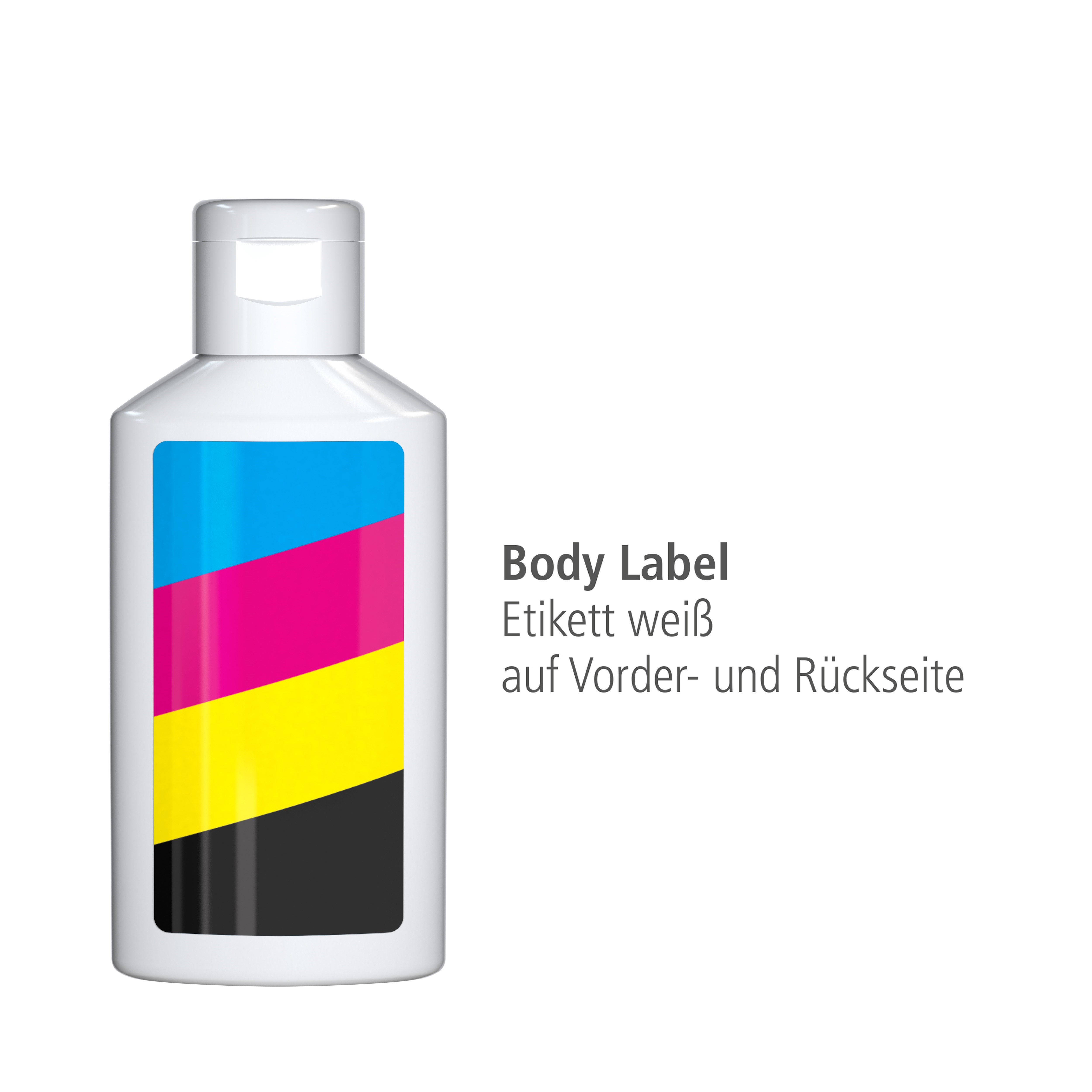 50 ml Flasche mit Klappdeckel Flasche hergestellt aus 100% recyceltem PET, weiß mit leichter R-PET-Färbung. Klappdeckel "weiß", zufällig ausgerichtet. Nachfüllbar. Sonnenmilch mit klassischem Sonnenschutz-Duft - LSF 30 (Hohes Schutzniveau). Wasserfeste und schnell einziehende Sonnencreme mit Vitamin E und Glycerin für 24-Stunden-Langzeitfeuchtigkeit. Sofortschutz mit ausgewogenem UVA- / UVB-Breitbandfilter. • Ohne Octocrylene • Nanofrei, vegan • Kein Mikroplastik • Keine Parabene, Mineralöle, Silikone • Korallenfreundlich gemäß Hawaii-Riffgesetz • Dermatologisch getestet "Sehr gut hautverträglich" • Hergestellt in Deutschland Dekoration: Body Label: Etikett PE (weiß) auf Vorder- und Rückseite, Druck 4c CMYK.