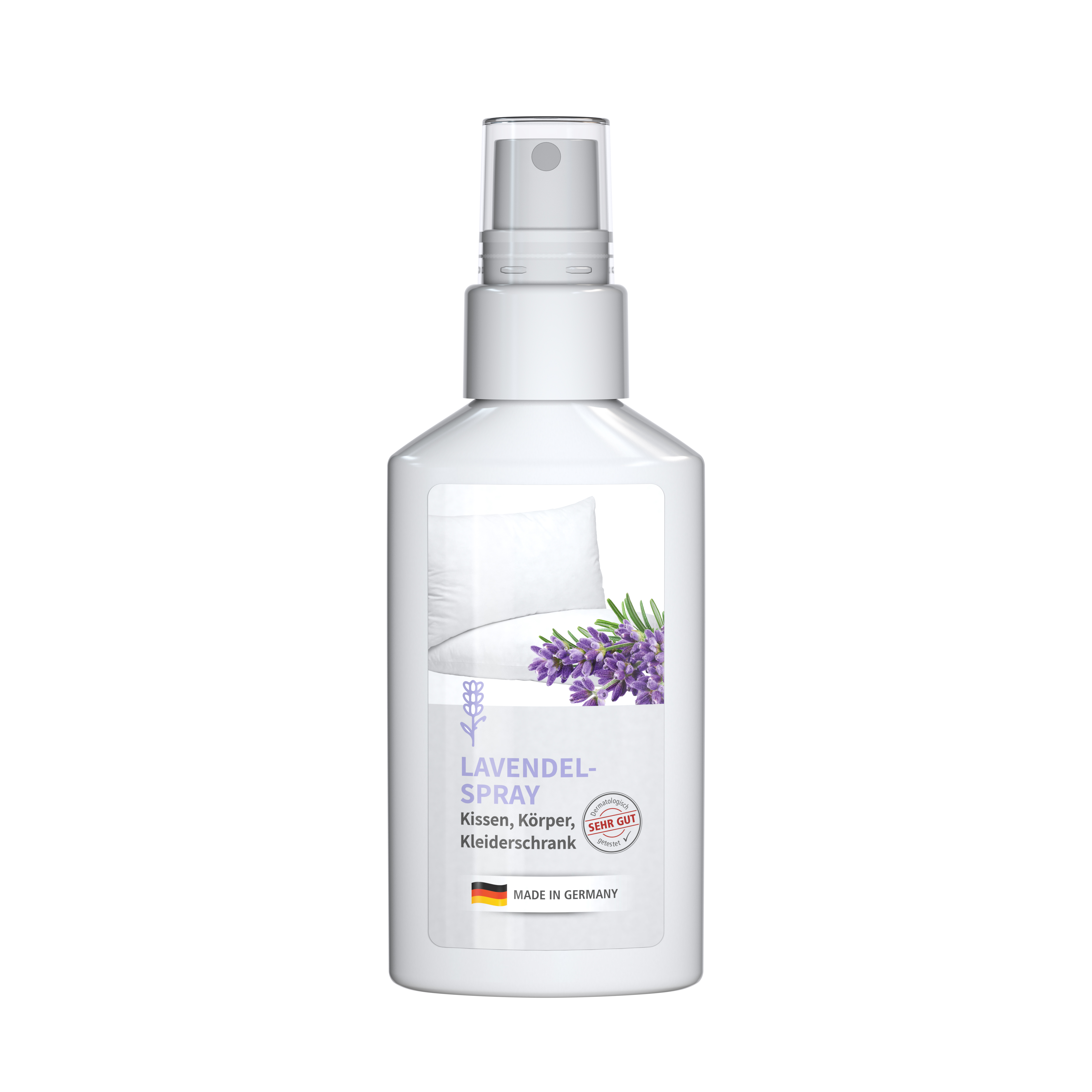 50 ml Flasche mit Pumpaufsatz Flasche hergestellt aus 100% recyceltem PET, weiß mit leichter R-PET-Färbung. Pumpaufsatz "weiß", zufällig ausgerichtet. Nachfüllbar. Lavendel-Spray für Kopfkissen, Kleiderschrank und Körper Das Lavendel-Spray mit natürlichem Lavendelöl fördert einen ruhigen und erholsamen Schlaf. Mit der Kraft des ätherischen Öls dürfen Körper und Geist gleichermaßen entspannen. Es beruhigt die Seele, hilft beim Loslassen und Einschlafen. Zur Anwendung auf dem Kopfkissen, als Raumspray oder für den Kleiderschrank. Auch als erfrischendes Körperspray geeignet. • Mit natürlichem Lavendelöl • Vegan • Ohne Konservierungsstoffe • Dermatologisch getestet "Sehr gut hautverträglich" • Hergestellt in Deutschland Dekoration: Body Label: Etikett PE (weiß), Druck 4c CMYK.