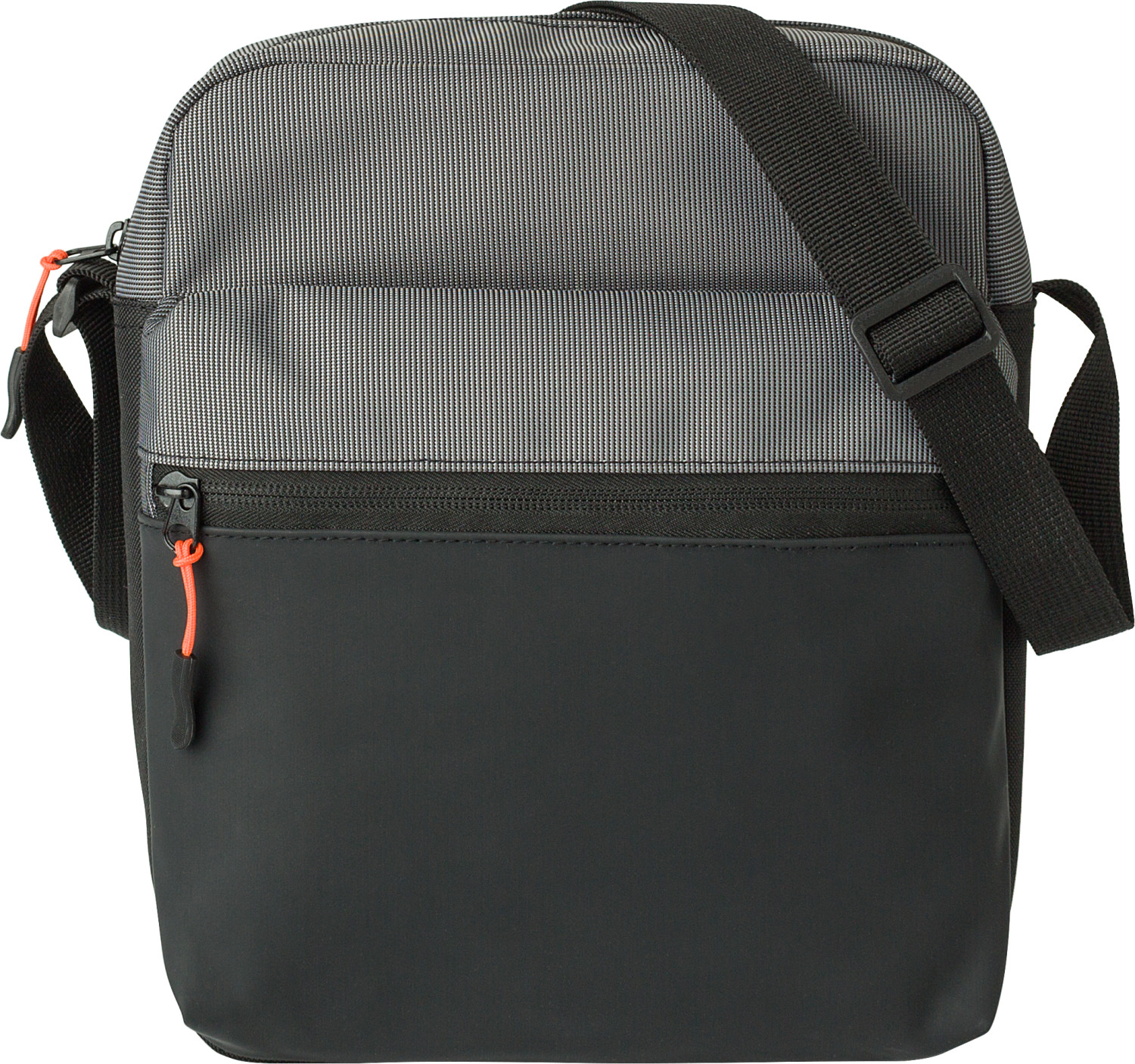 500D zweifarbige Umhängetasche. Verstellbarer Schultergurt mit farbigen Akzenten. Kleine Reißverschlusstasche vorne. Großes Reißverschlussfach oben mit einer kleinen Innentasche mit Reißverschluss auf der Rückseite.