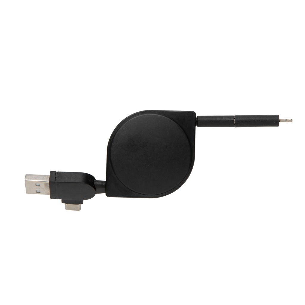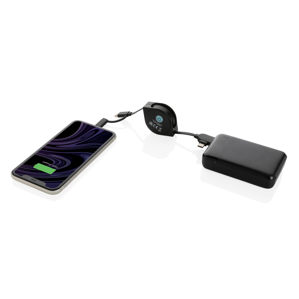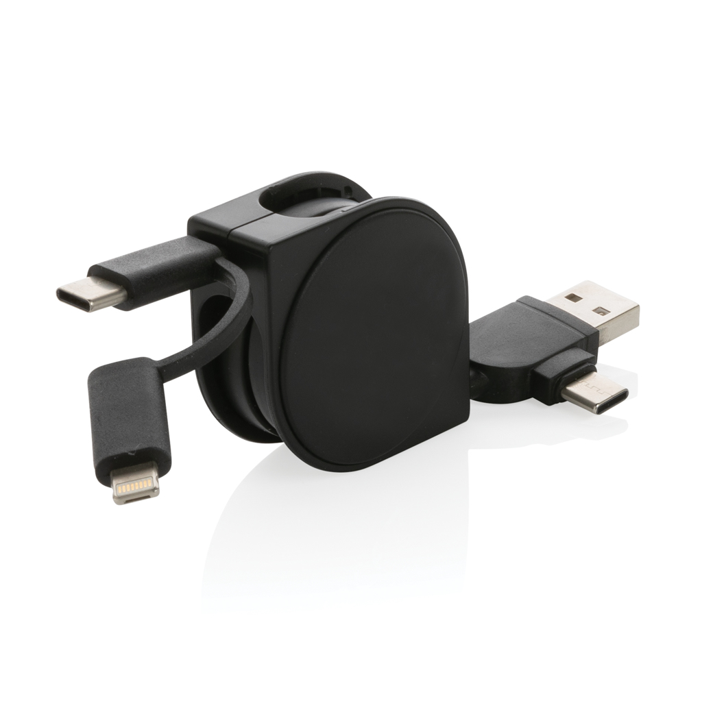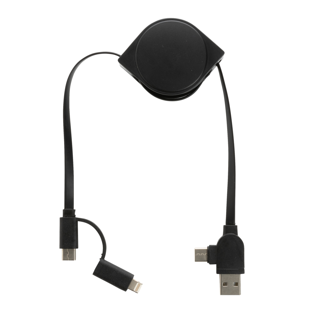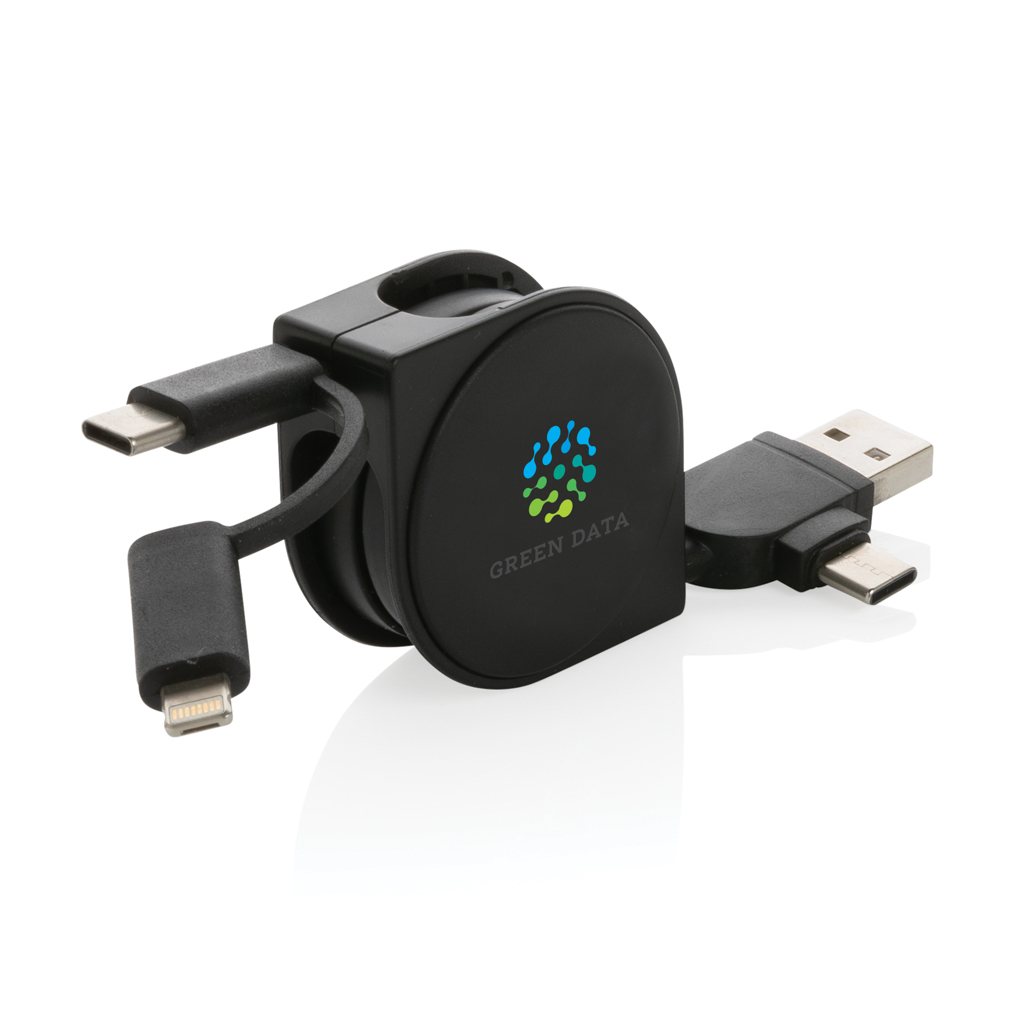 Dieses 6-in-1 ausziehbares Kabel, hat ein Gehäuse aus RCS-zertifiziertem recyceltem ABS-Kunststoff und ein Kabel, das aus recyceltem TPE besteht. RCS (Recycled Claim Standard) ist ein Standard zur Überprüfung des Recyclinganteils eines Produkts in der gesamten Lieferkette. Dieser RCS Standard wird verwendet, wenn ein Teil eines Produktes aus recycelten Materialien hergestellt wurde. Mit 5 verschiedenen Anschlüssen: USB-C in, USB-A in, Type-C out, iOS out und Micro USB out. Dadurch können Sie das Kabel auch mit Type-C-Ausgabegeräten verwenden, die in der neueren Generation von Telefonen und Macbook-Computern verbaut sind. Das Kabel verfügt auch über eine USB-A-Output-Option, sodass jedes Gerät von jeder Ausgangsquelle aufgeladen werden kann. Artikel ist komplett PVC-frei.