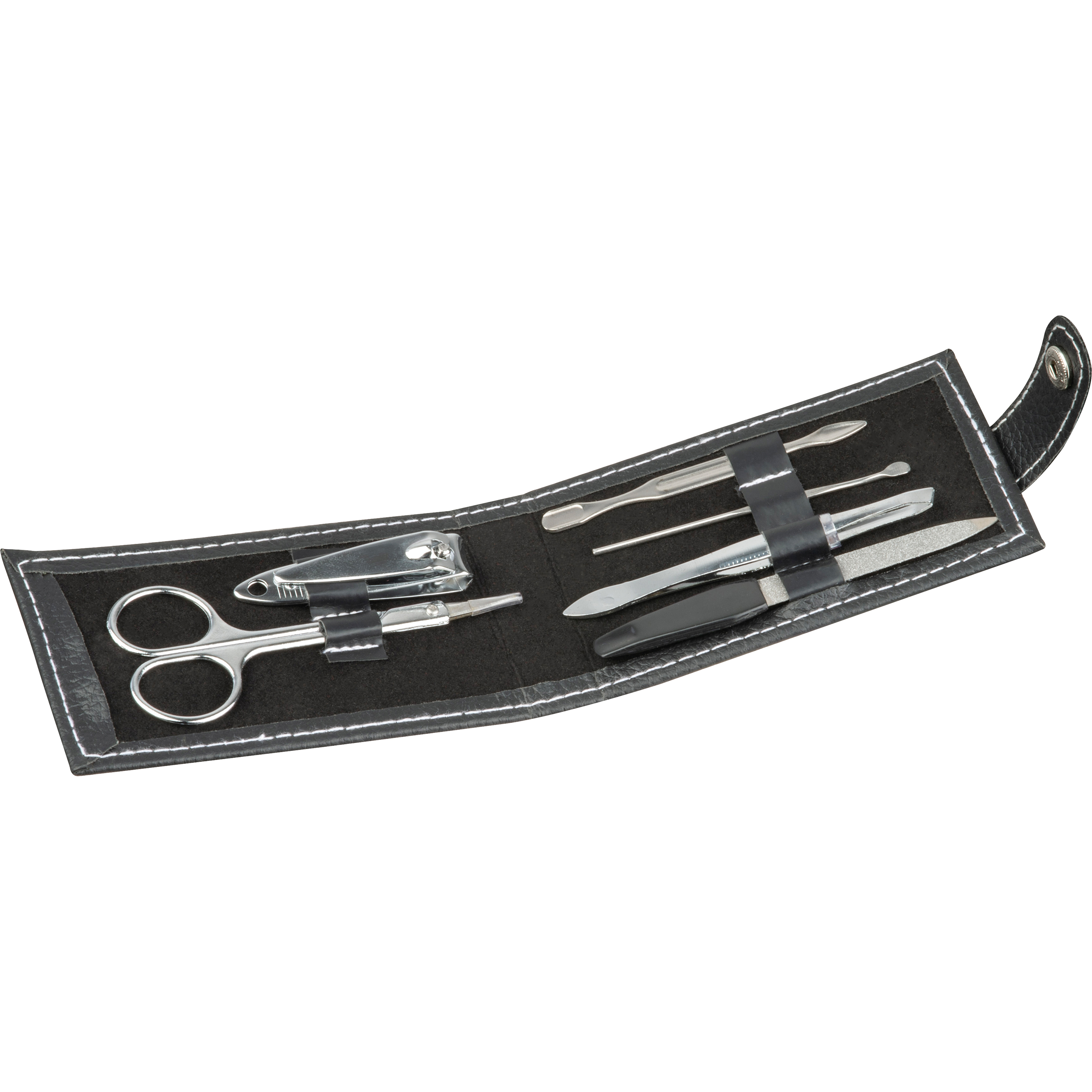 Hochwertiges Maniküretui aus recyceltem Leder mit Edelstahlbestecken und Diamantnagelfeile, 7 teilig. Ihre Werbung wird auf die Vorderseite gedruckt.