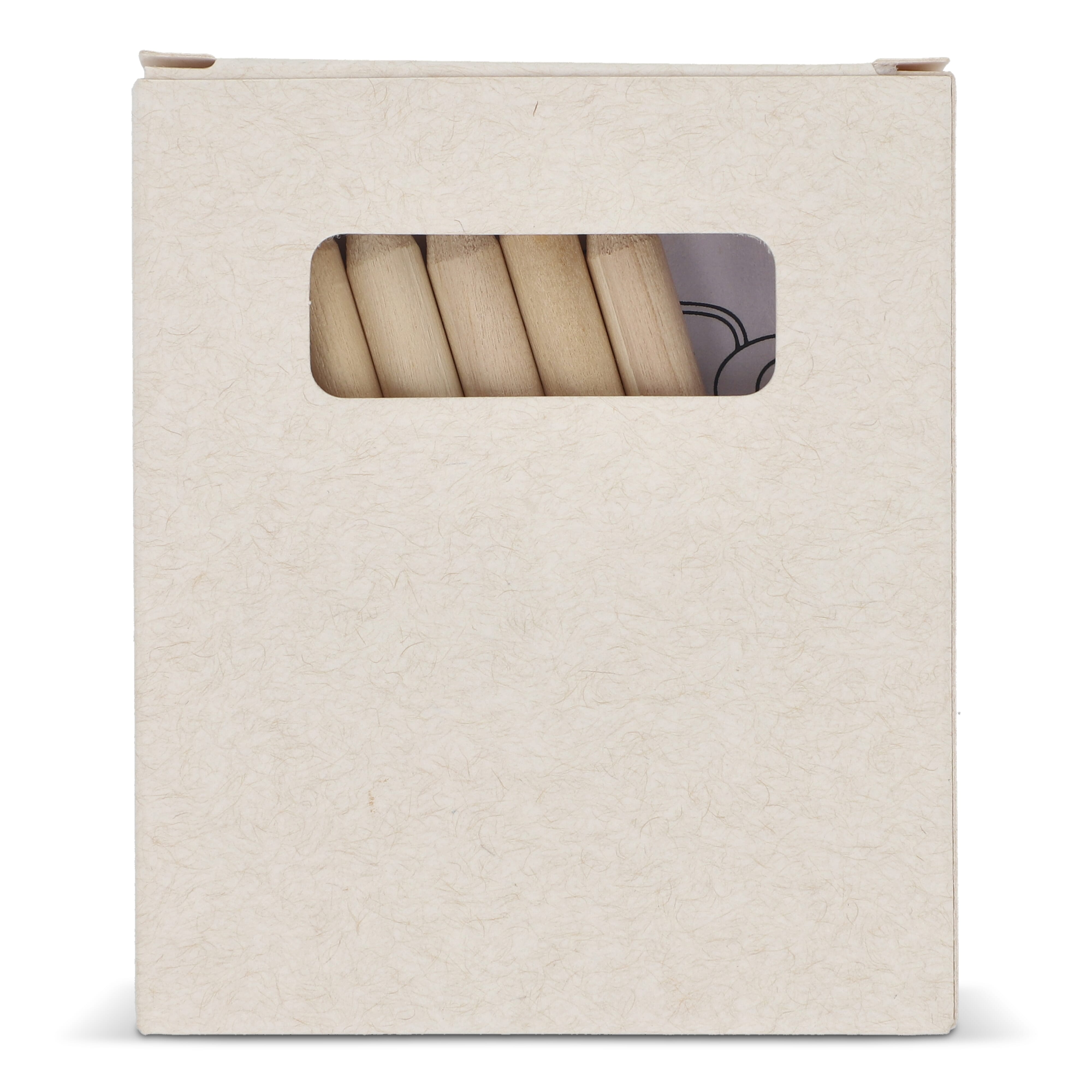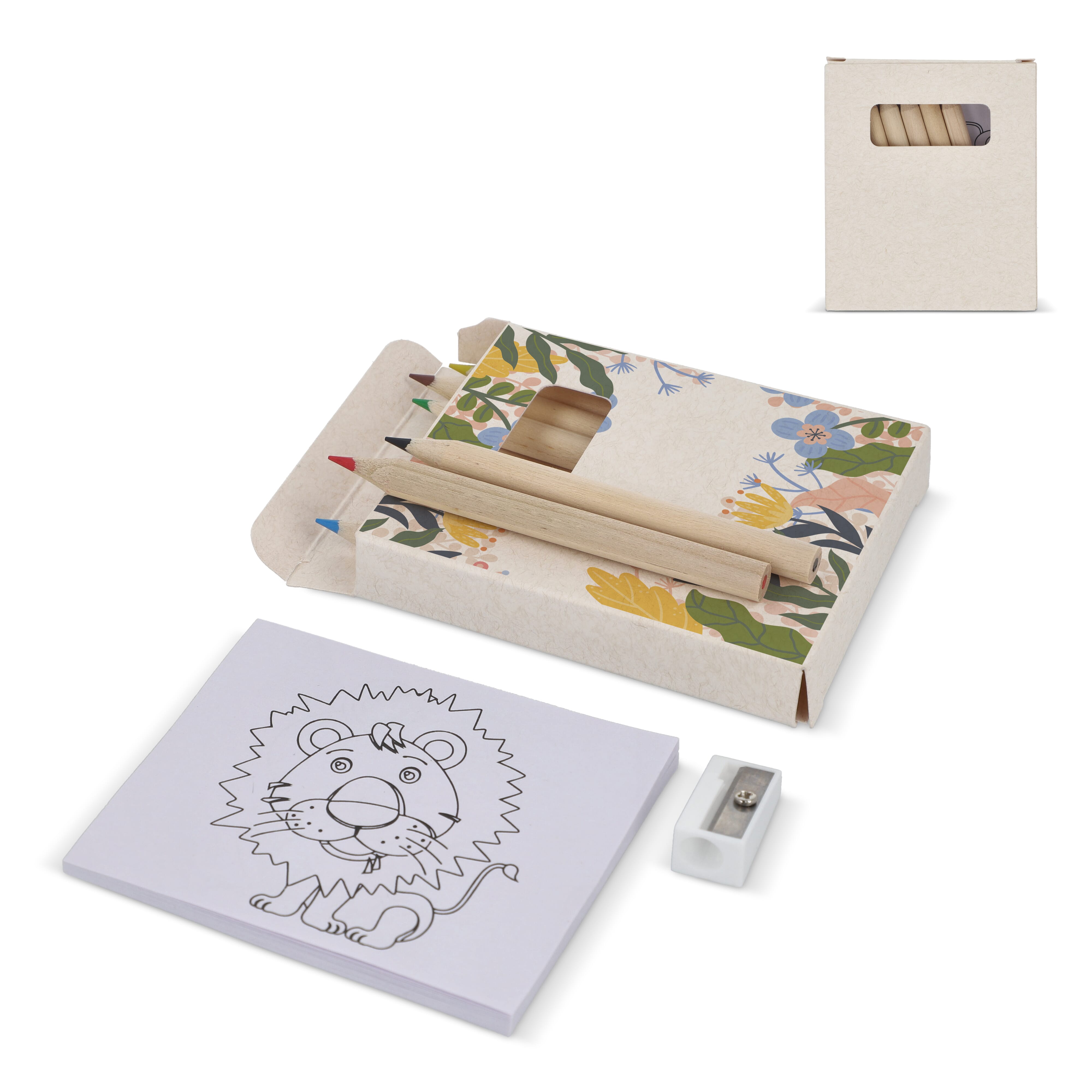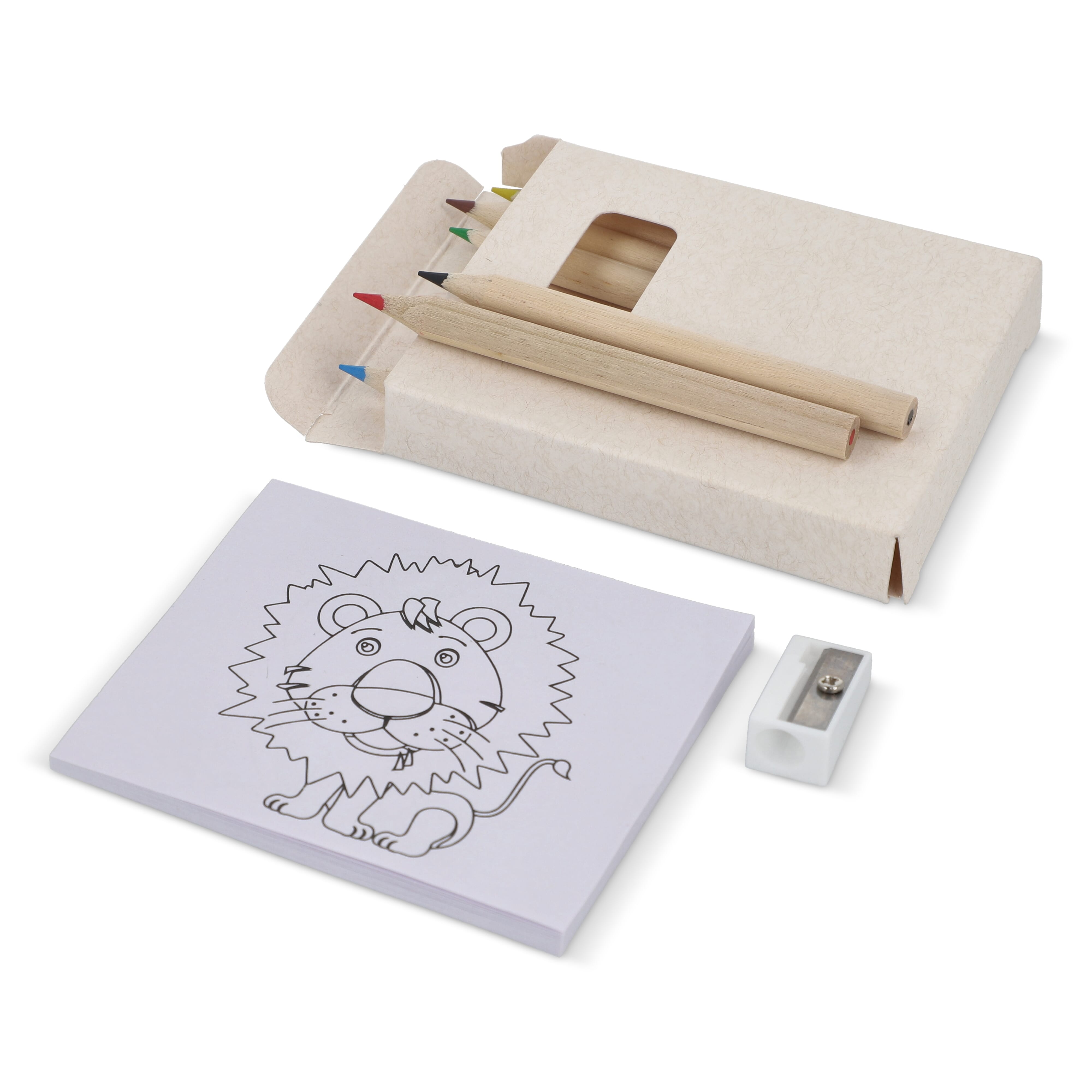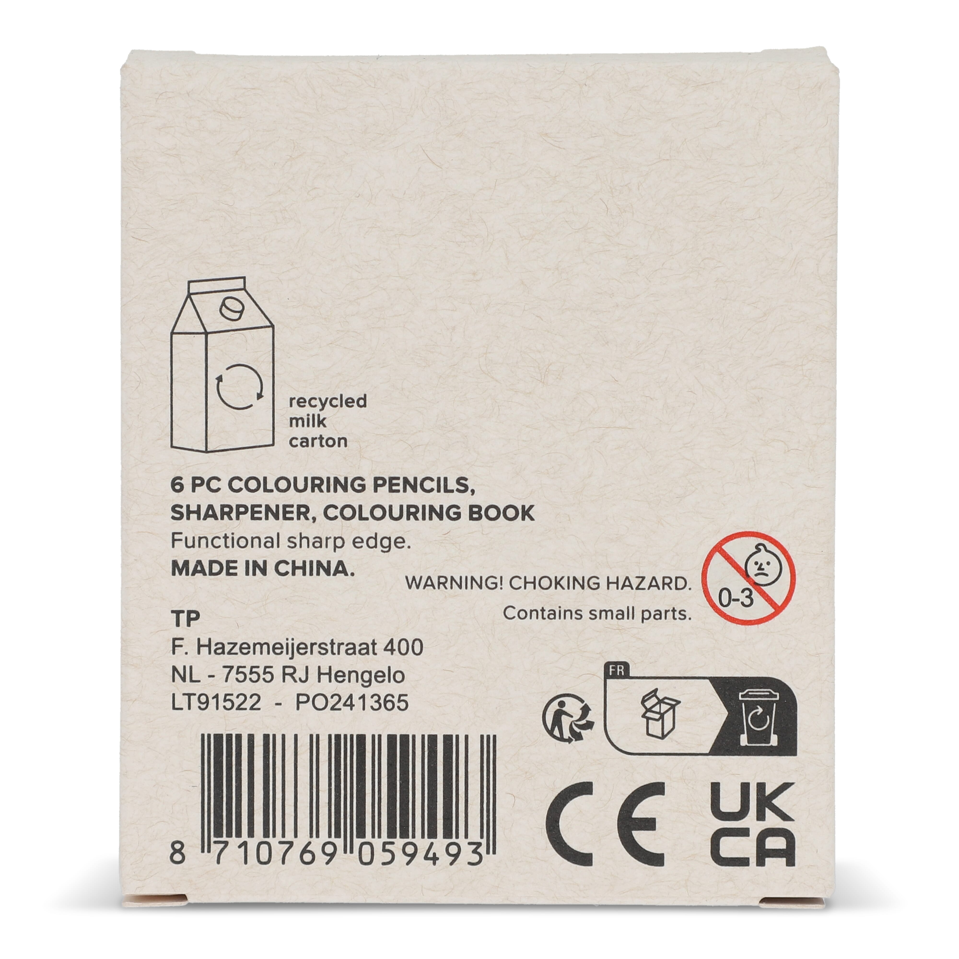 Ein komplettes Kreativitätsset für unterwegs, bestehend aus 6 Malstiften, einem Anspitzer und einem Malbuch, alles ordentlich verpackt in einem Karton aus recyceltem Milchkarton. Perfekt für unterwegs, bietet es stundenlange Unterhaltung in einem kompakten Paket. Zusammen mit dem umweltfreundlichen Digitaldruck ist es ein ideales Geschenk für angehende Künstler.
