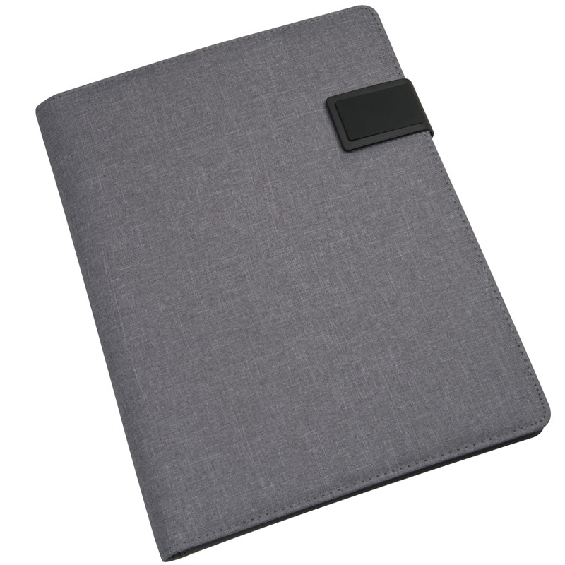 A4 Schreibmappe aus strapazierfähigem Stoff mit diversen Einsteckfächern und Gummischlaufen, einem Handyfach, einem Schreibblock (40 Seiten) und einem Magnetverschluss. Ihre Werbung drucken wir vorne, außen auf die Mappe.