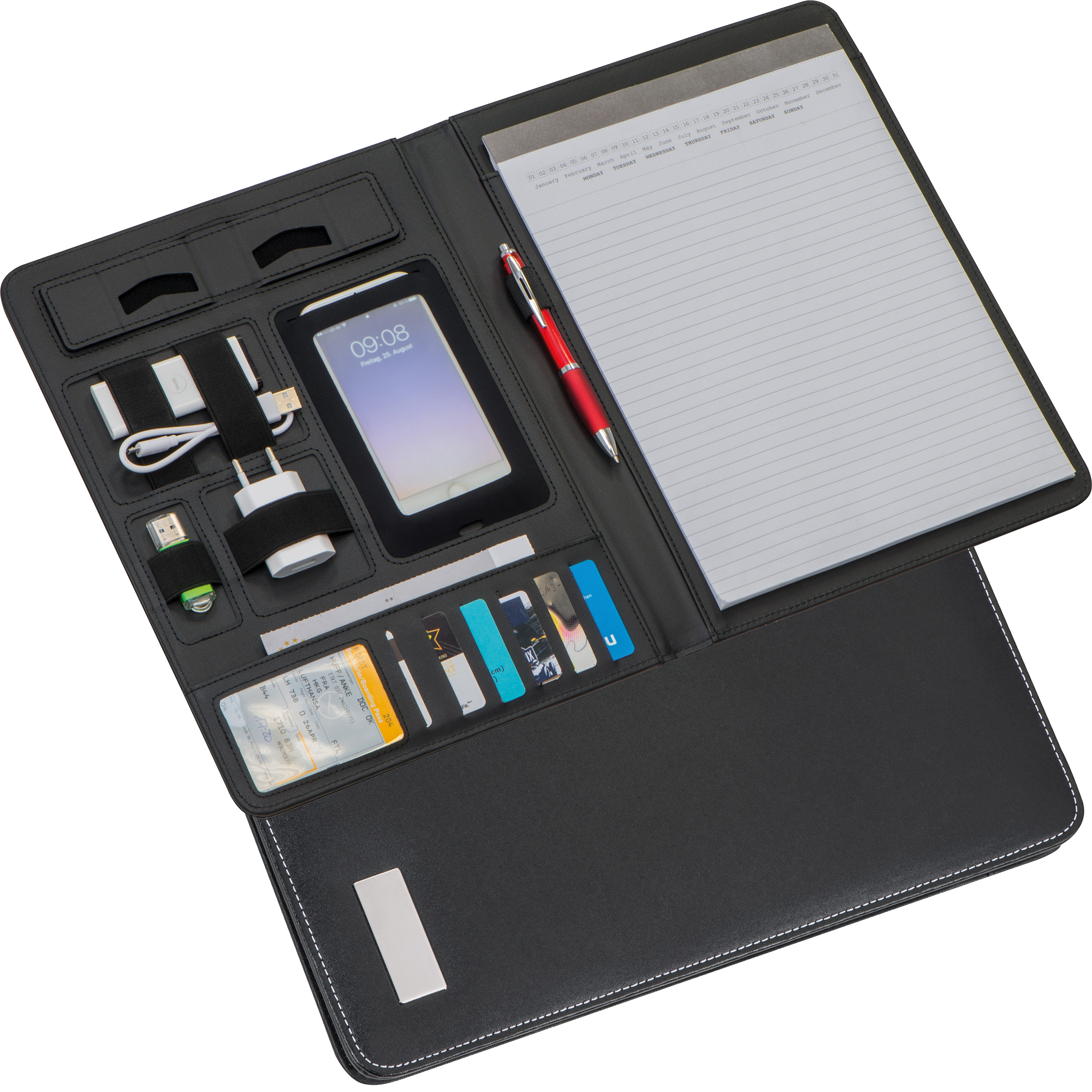 Schreibmappe A4 aus hochwertigem Kunstelder mit Steckfächern, Visitenkartenfächern, Kugelschreiberschlaufe, Smartphonehalterung, Ständer und liniertem Block mit Kalendereindruck. Ihre Werbung wird auf das äußere Metallplättchen gelasert.