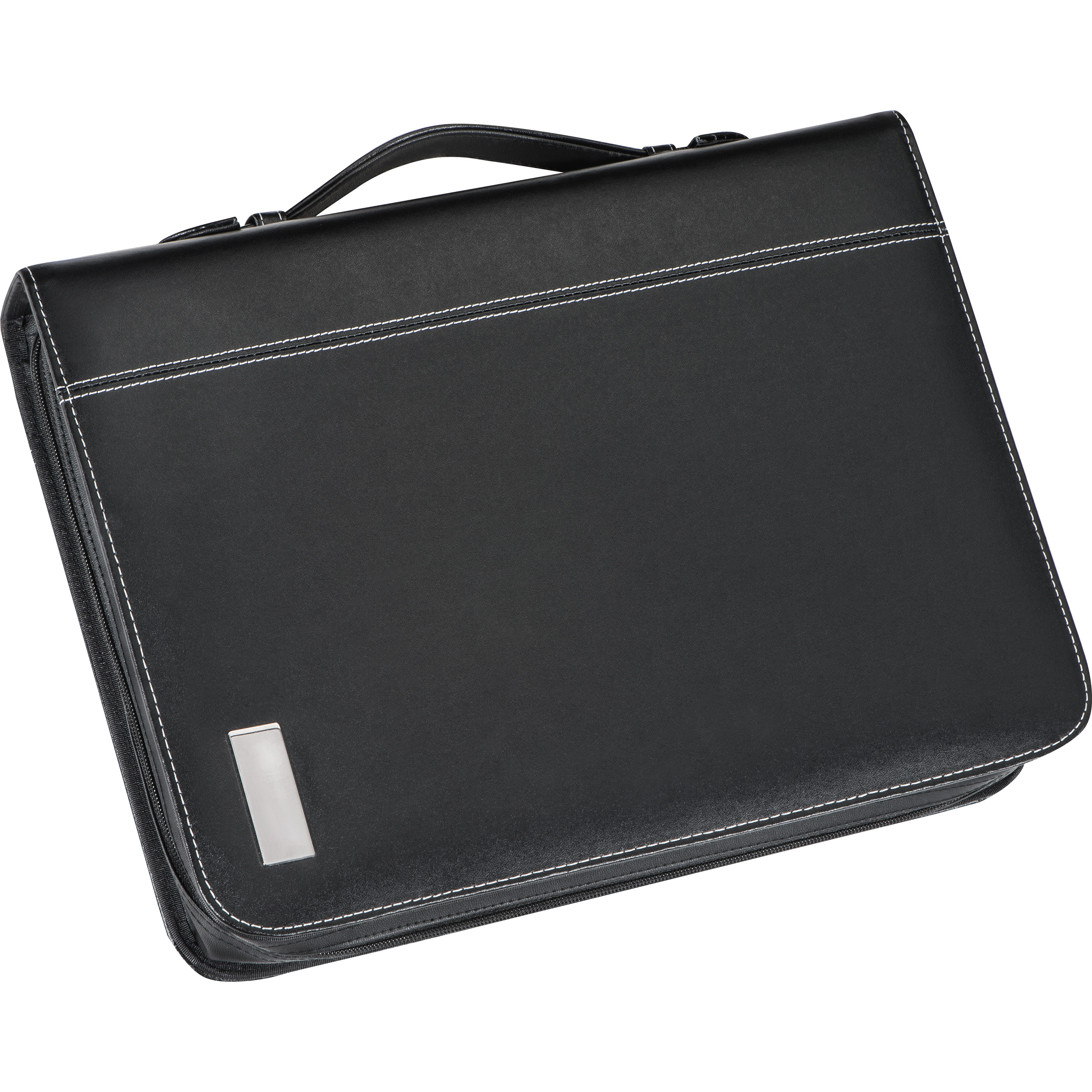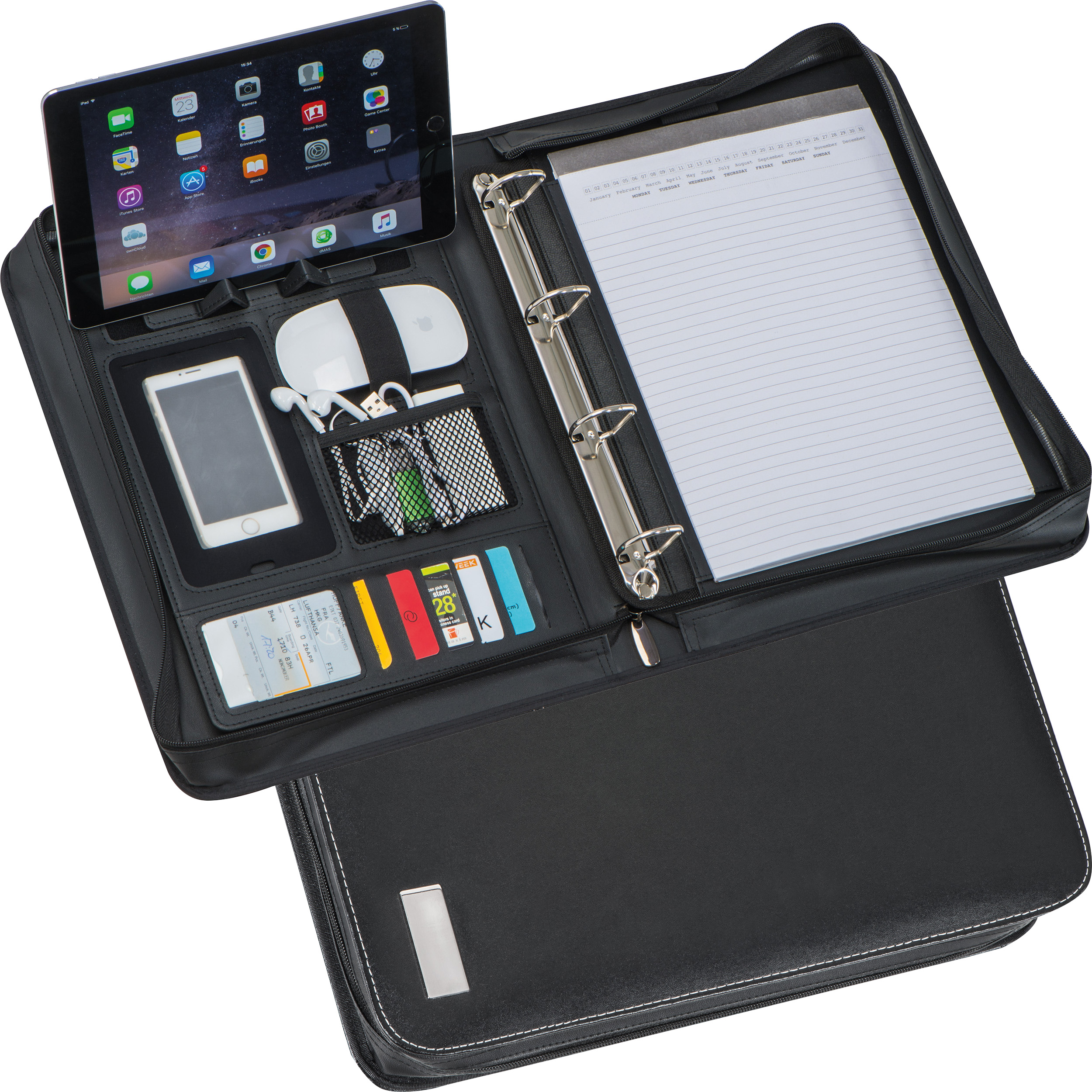 Aktenmappe A4 aus Kunstleder mit Steckfächern, Visitenkartenfächern, Smartphonehalterung, Aufbewahrungsfach für Tablet oder Notebook, Ringbuchmechanik und liniertem Block mit Kalendereindruck. Ihre Werbung wird außen auf das Metallplättchen gelasert.
