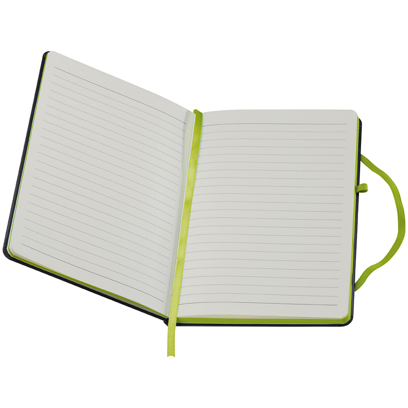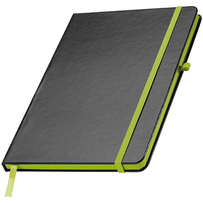 A5 Notizbuch im PU-Einband, Kugelschreiberschlaufe, Gummiverschlussband, Lesezeichen und 160 linierten Seiten. Der Werbeaufdruck erfolgt mittig auf der Vorderseite.