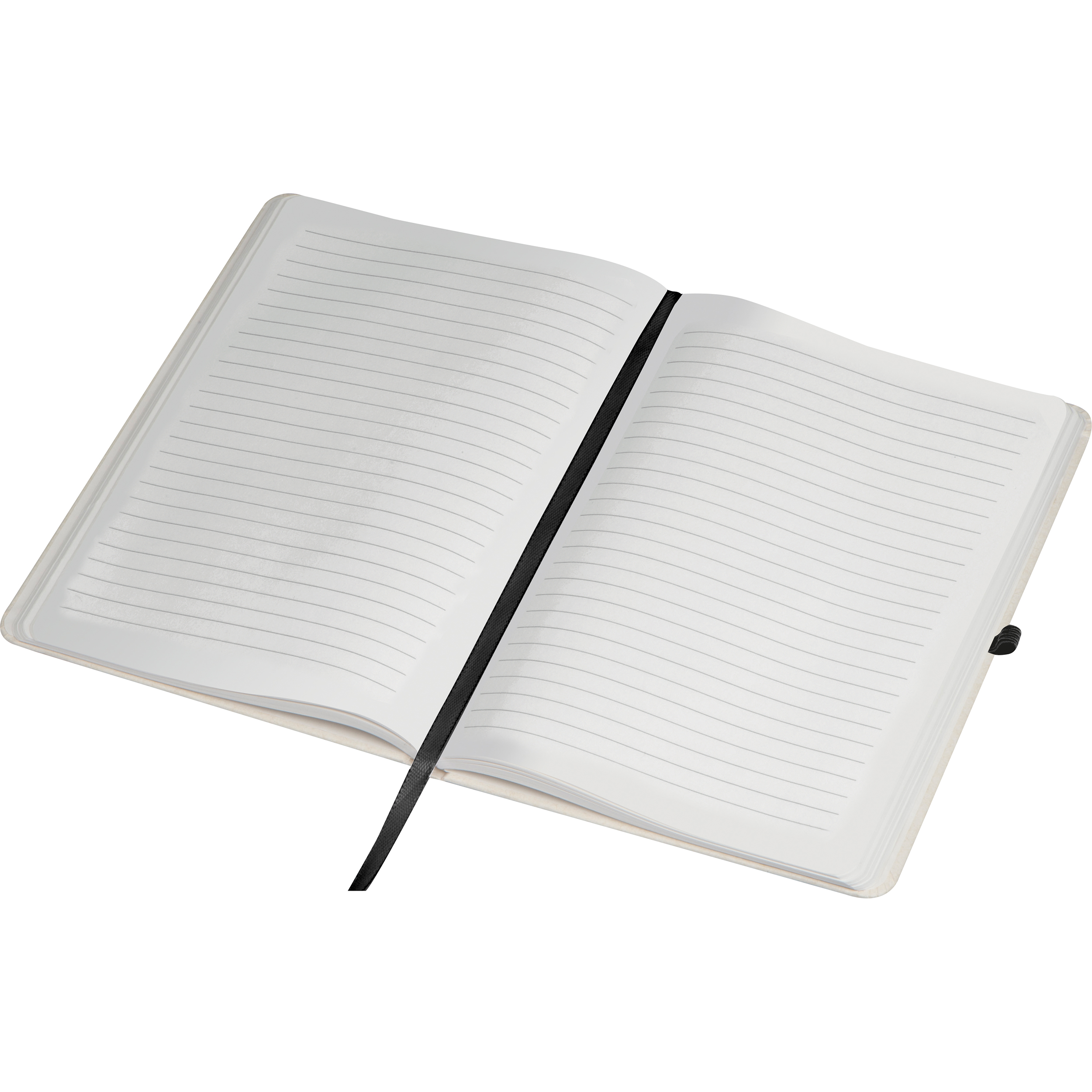 A5 Notizbuch aus recyceltem Milchkarton mit 160 linierten Seiten, Lesezeichen, Gummiverschlussband und Kugelschreiberschlaufe. Ihre Werbung drucken wir auf das Notizbuch.