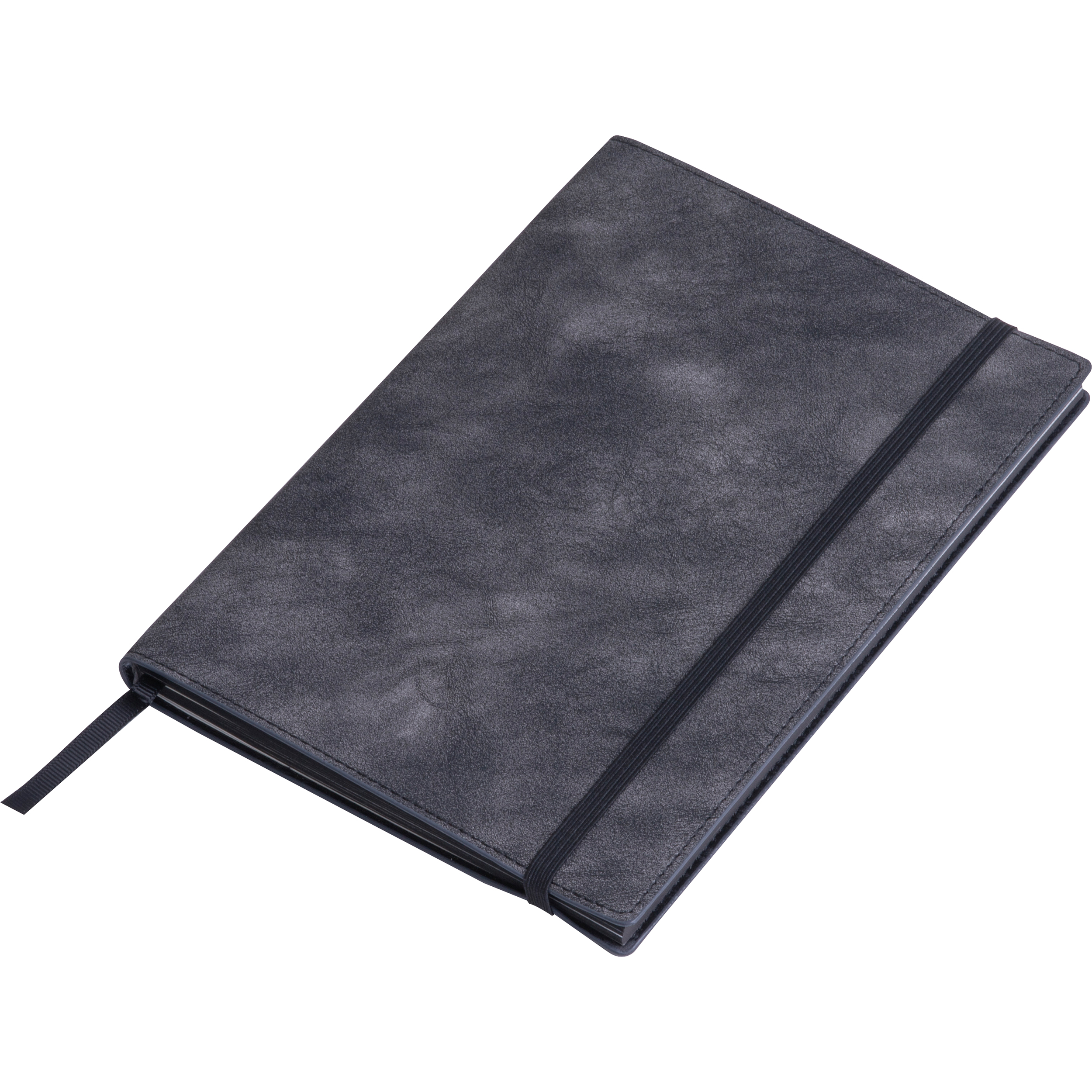 A5 Notizbuch mit Softcover aus PU, 160 linierten Seiten aus Recyclingpapier, Lesebändchen und Gummibandverschluss. Ihre Werbung drucken wir auf das Cover.