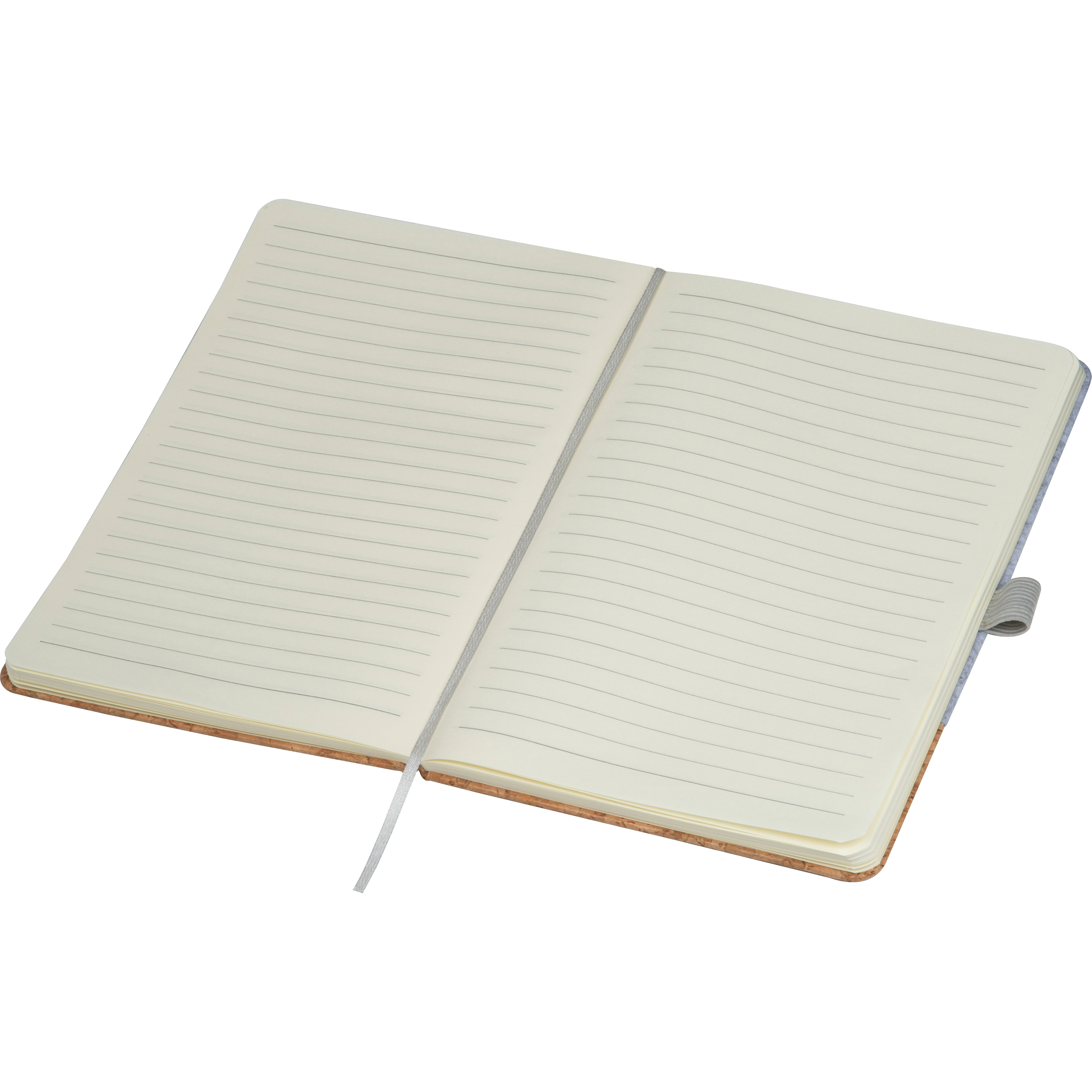A5 Notizbuch mit Cover aus RPET Filz und Kork mit 160 linierten Seiten aus recyceltem Papier, Gummischließband und Kugelschreiberschlaufe. Ihre Werbeanbringung drucken wir auf die Filzfläche.
