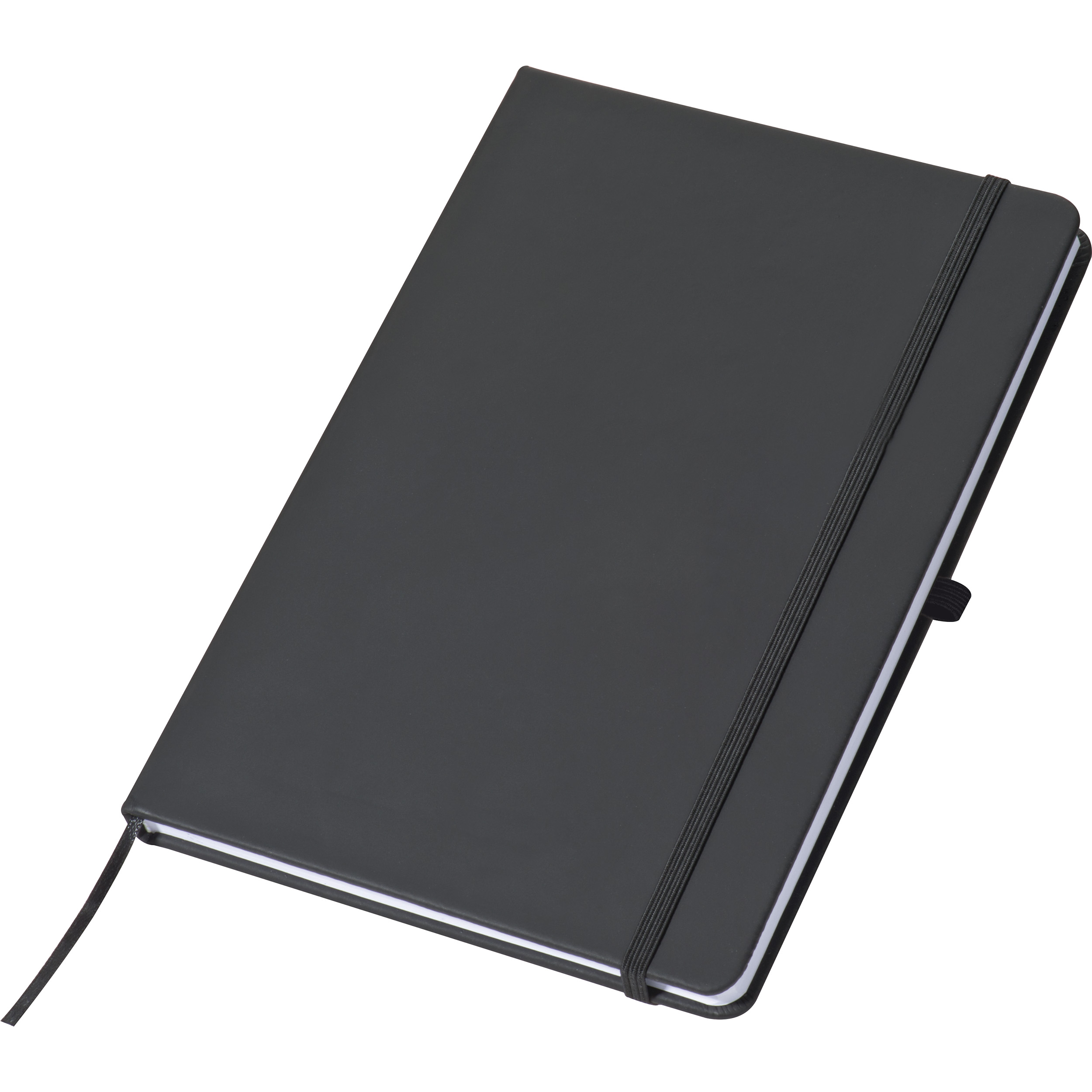 A5 Notizbuch mit 160 linierten Seiten und PU Hardcoverumschlag für Ihre Aufzeichnungen. Das Buch ist mit Lesebändchen und Gummischlaufe ausgestattet. Ihre Werbung drucken wir außen auf die Vorderseite des Notizbuchs.