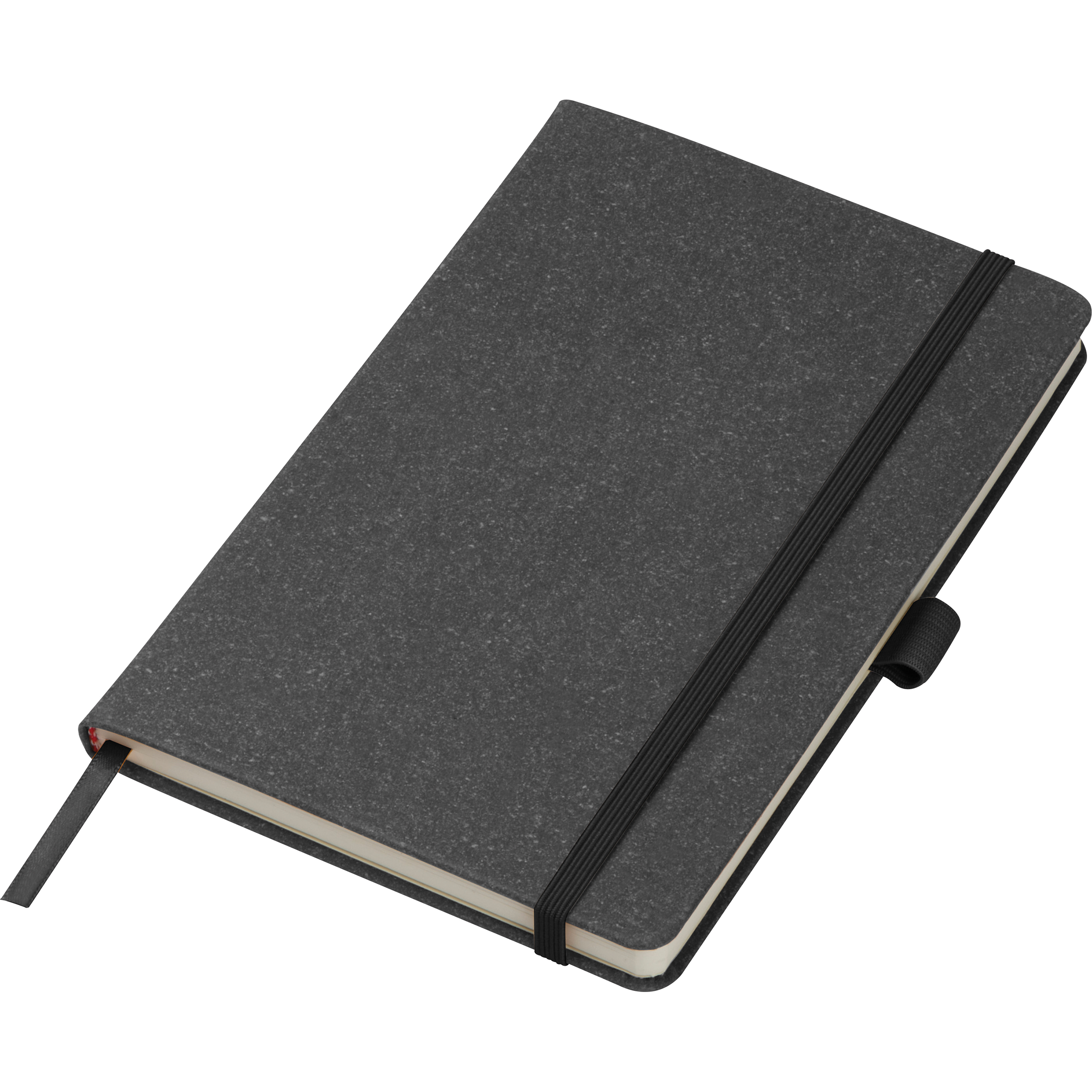 A5 Notizbuch aus recyceltem Leder mit elastischem Band zum Verschließen, Lesemarkierung und 160 linierten Seiten. Ihre Werbung bringen wir auf dem Notizbuch an.