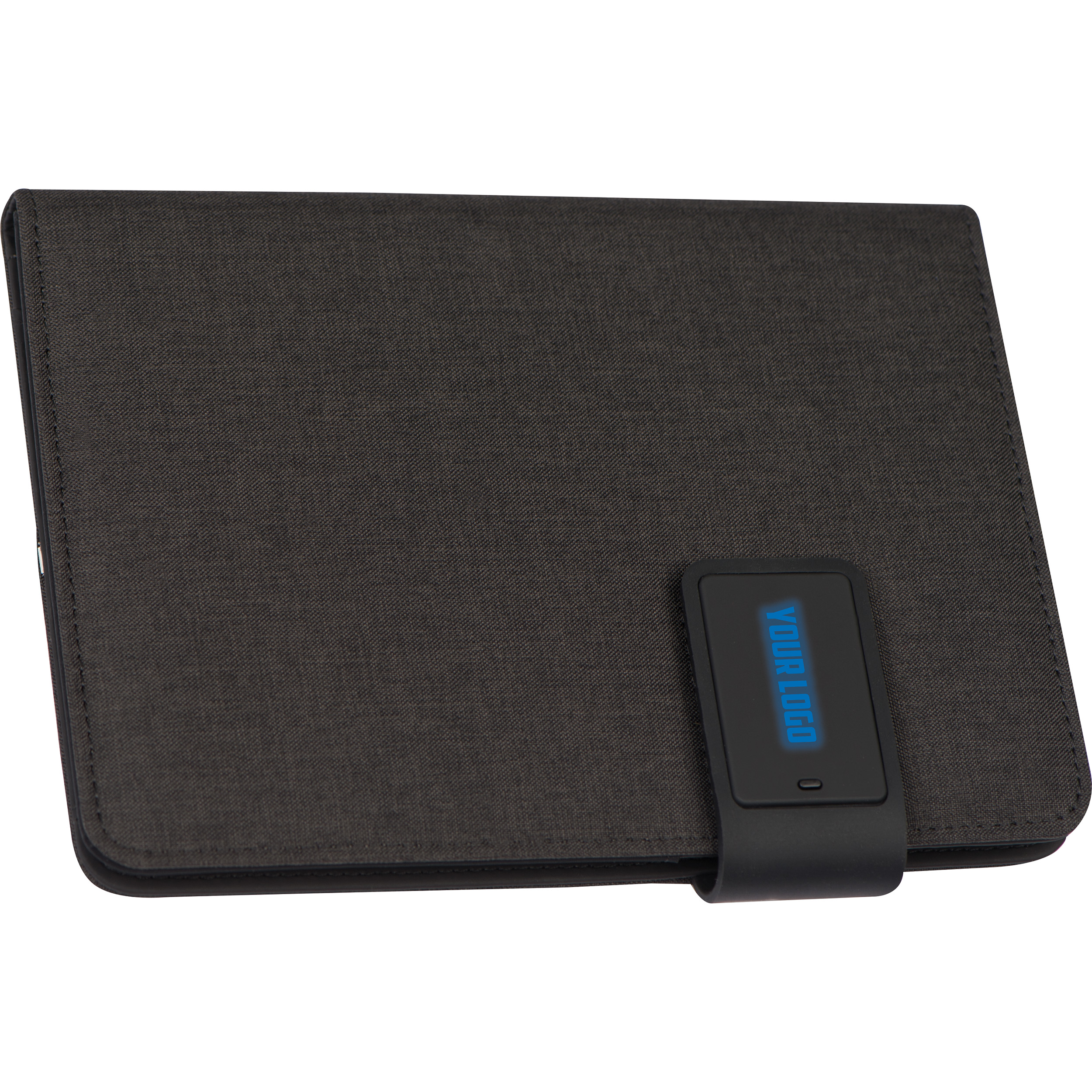 A5 Schreibmappe mit integrierter Powerbank 4.000 mAh, diversen Einsteckfächern, Kugelschreiberschlaufe, Handyhalterung und USB-Ladekabel. Der Clou - der gummierte Magnetverschluss ist mit einem LED Licht hinterlegt, somit kommt ihre Werbung in der jeweiligen Farbe des Lichtes zum Vorschein.