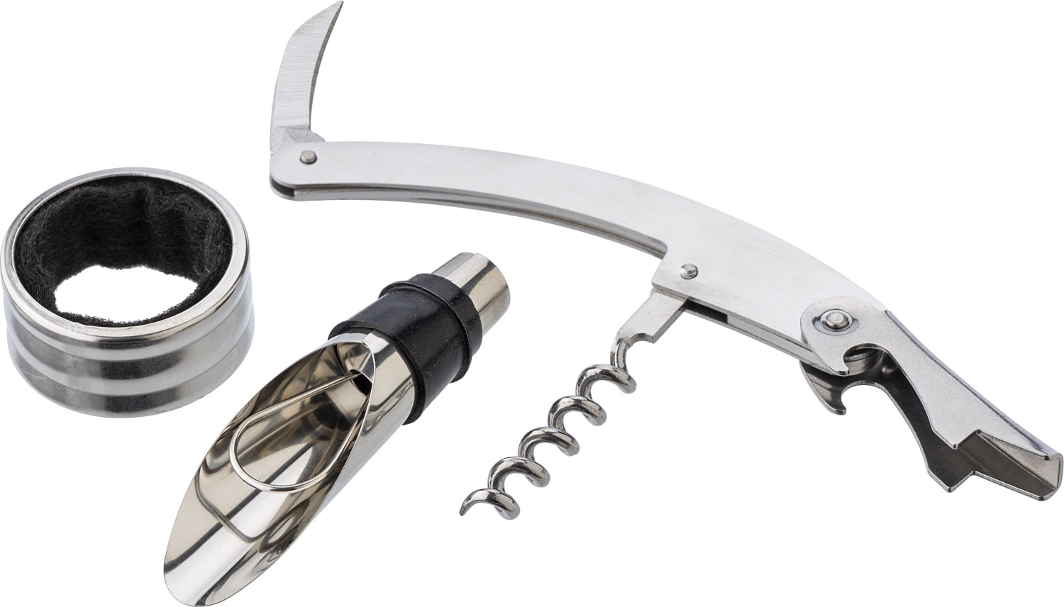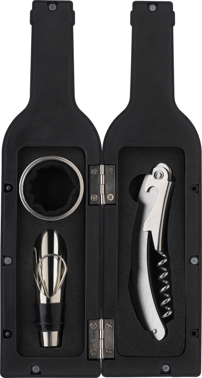 Weinset aus ABS, mit Kellnermesser, Flaschenverschluss mit Ausgießer und Tropfenfänger. Geformt wie eine Weinflasche.