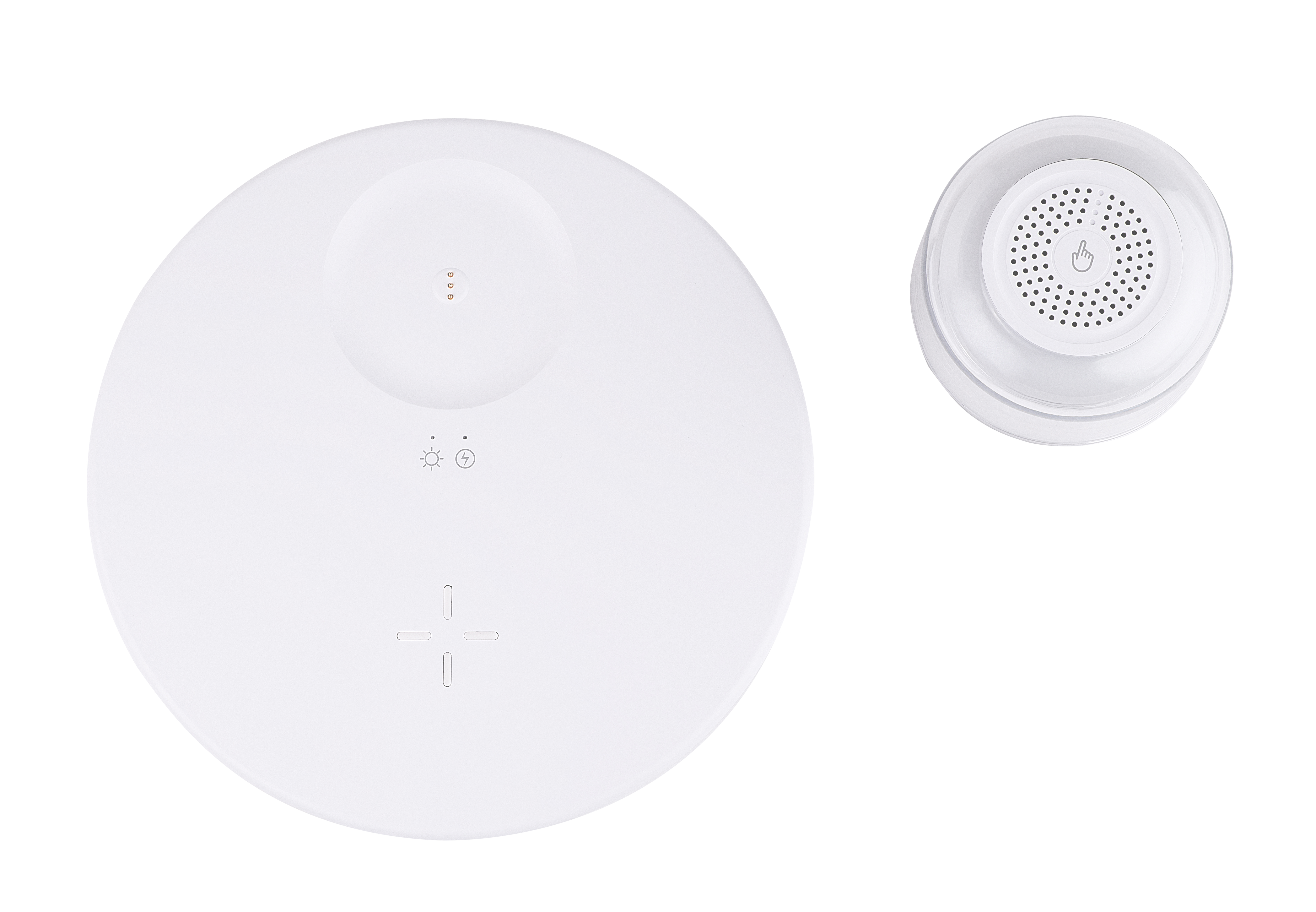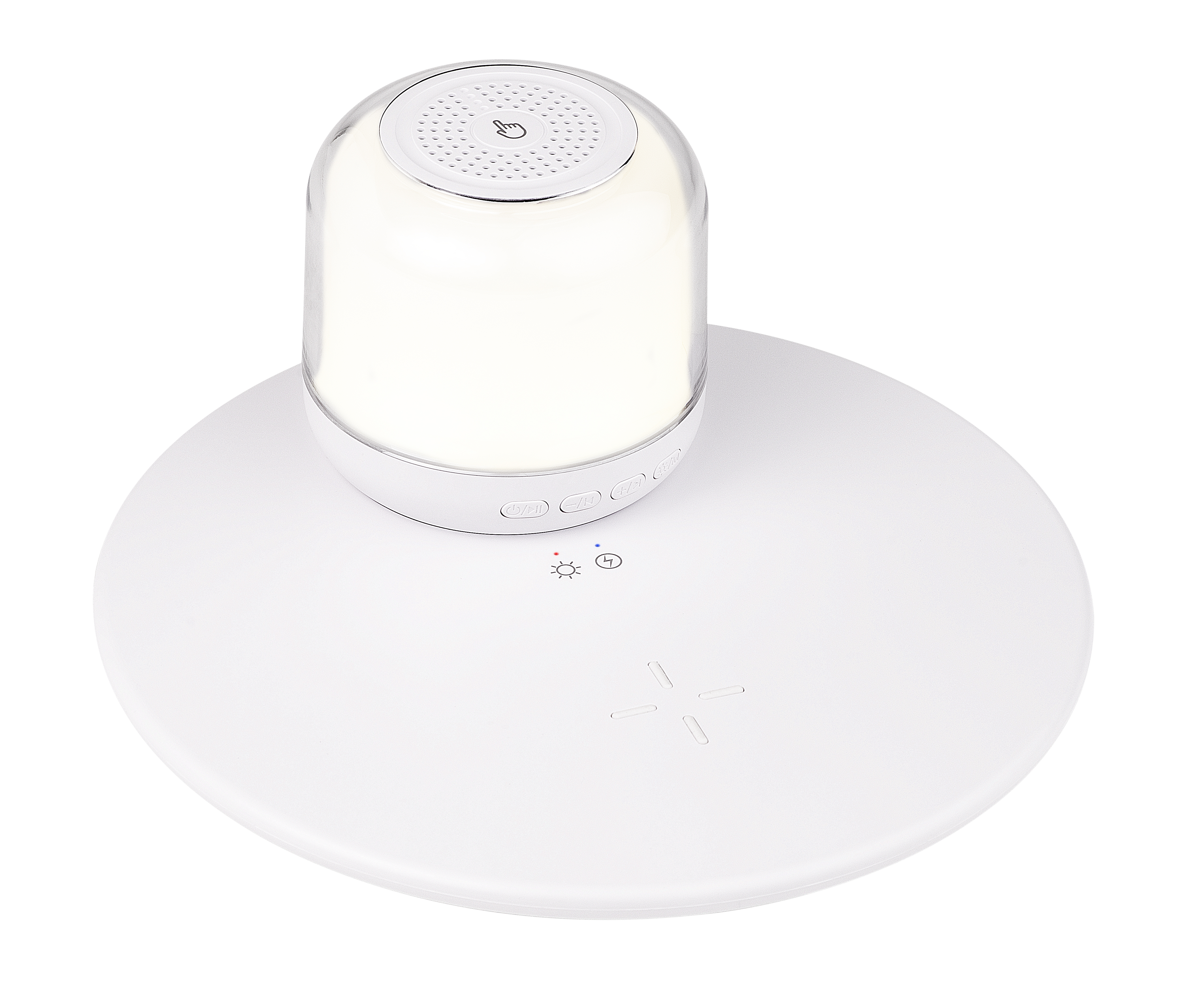 Entspannung pur: freut die Augen, streichelt die Ohren und versorgt Ihr Mobiltelefon diskret mit Energie. Nennspannung: DC 5V-2A / 9V-2A / 12V-1.5A Wireless Charger Output: DC 5V-1A / 9V-1.66A / 12V-1.25A Ladespannung des Lausprechers: DC 5V-1A/2A Nennleistung des Nachtlichts: 1.2W (6 x 0.2W LED- Module plus 6 x 0.2W RGB-Module) Batteriekapazität: 600 mAh, 3.7V (2.22Wh) Frequenzgang: 70Hz - 18KHz Material: ABS, PC, weiß Plastikfreie Einzelverpackung Maße: 80 x Ø 180 mm Gewicht ohne Verpackung: 379 g Werbeanbringung: Auf dem Körper 40 x 15 mm (D2, UV2) Dieses Produkt unterstützt aktiv den Ausgleich der entstehenden CO2-Emissionen durch zertifizierte Klimaschutzprojekte.
