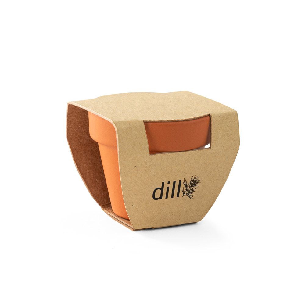 Terracotta Töpfchen mit Dillsamen und einer Substrattablette. Wird ungefalten geliefert. Geliefert in einer Kraftpapierverpackung. 56 x 50 mm 56 x 50 mm