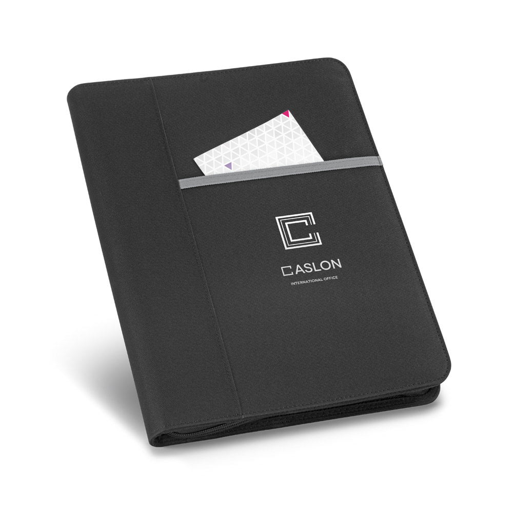 Schreibmappe A4 aus 600D mit Ringbuchablage und Reißverschluss. Diese Mappe hat eine Vordertasche und ein Dokumenten- und Kartenfach. Enthält ein Notizblock mit 40 linierten Seiten. Kugelschreiber und USB-Stick nicht enthalten. 260 x 340 x 35 mm