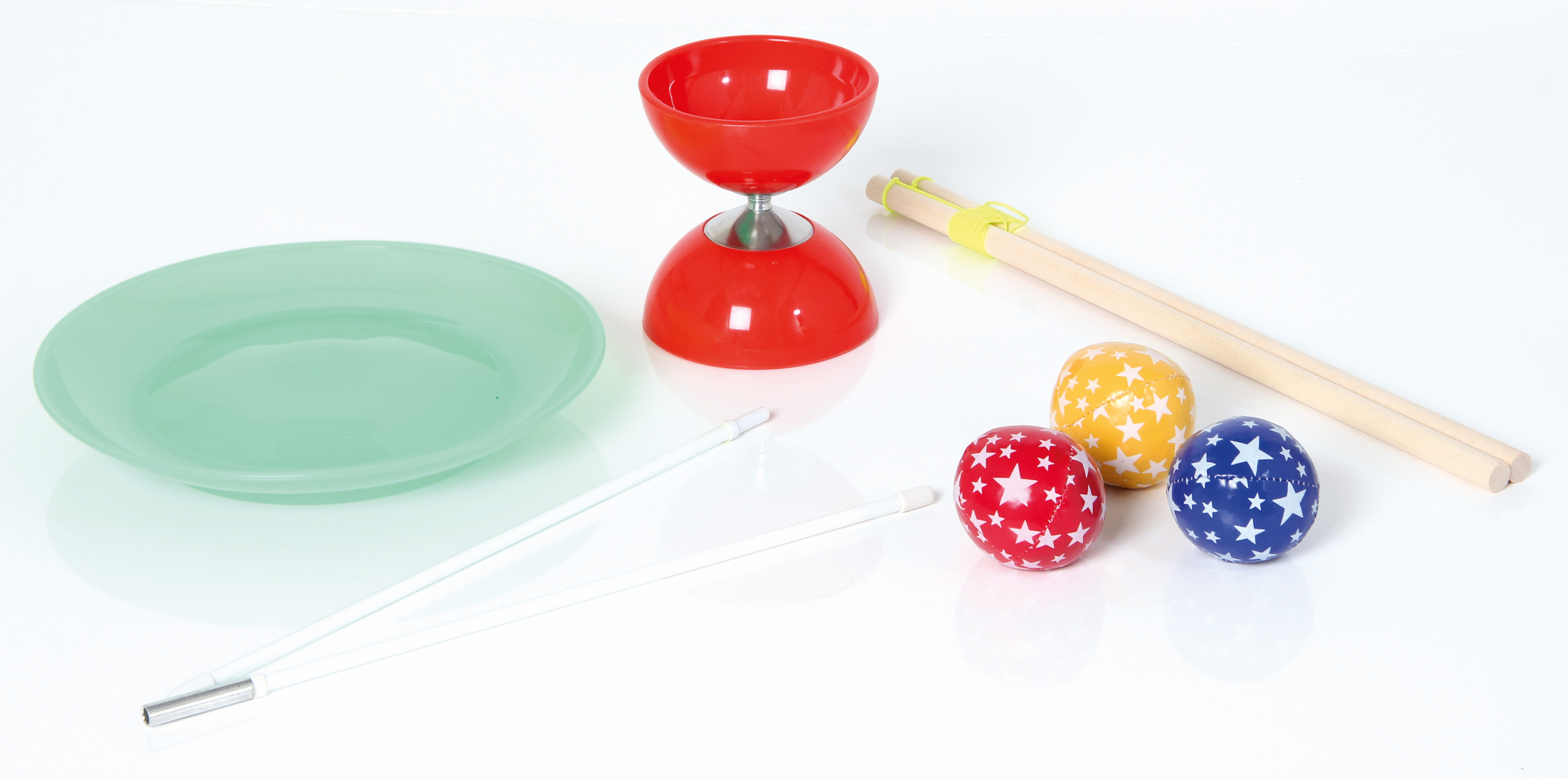 - Balancierteller (D 23 cm) mit Stab (L 60 cm) - beides aus Kunststoff - Diabolo aus Kunststoff (D 10 cm) mit 2 Holzstäben (je L 37,5 cm) - 3 Jonglierbälle (je D 6 cm) Verschiedene Farben im Set.