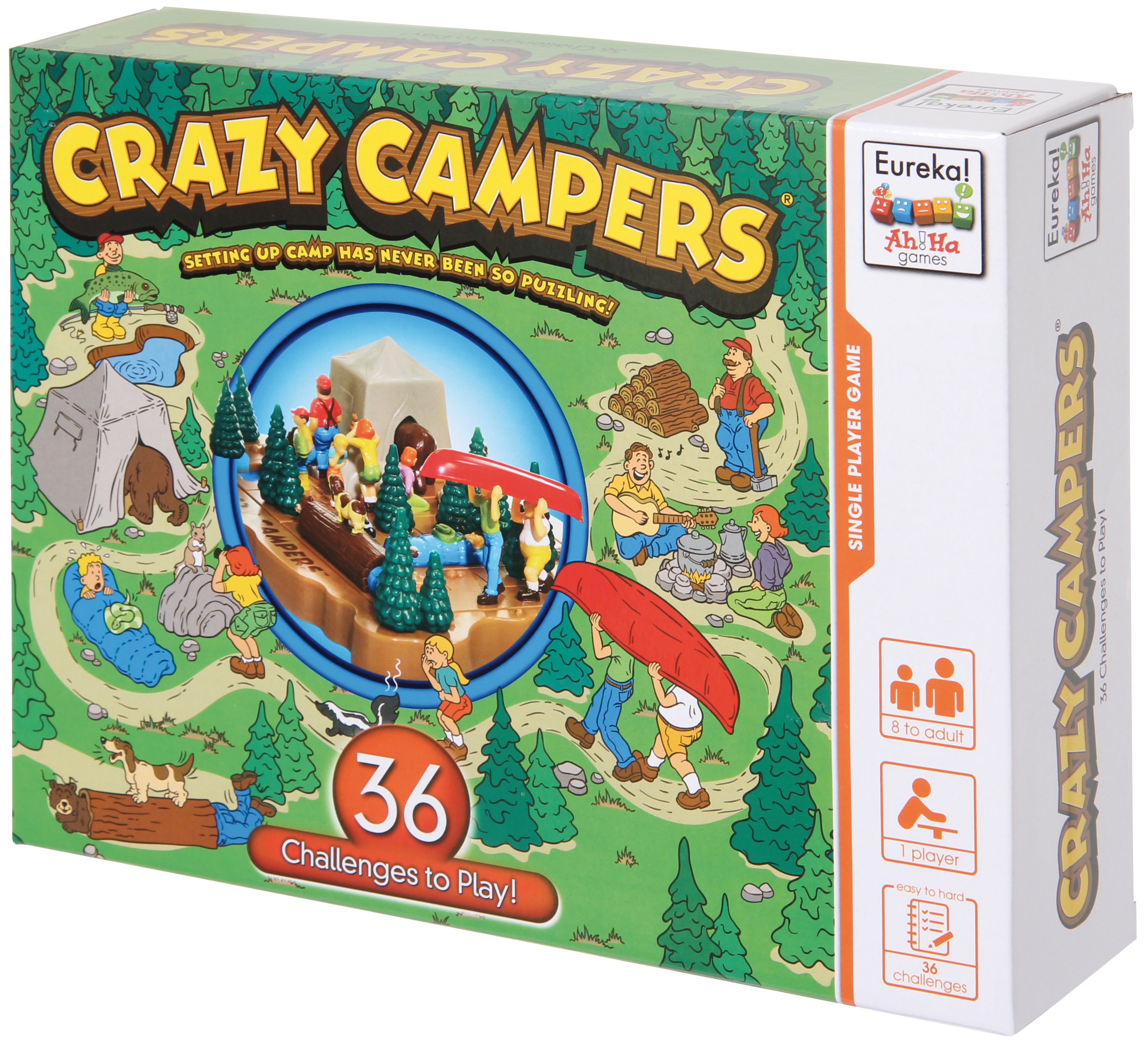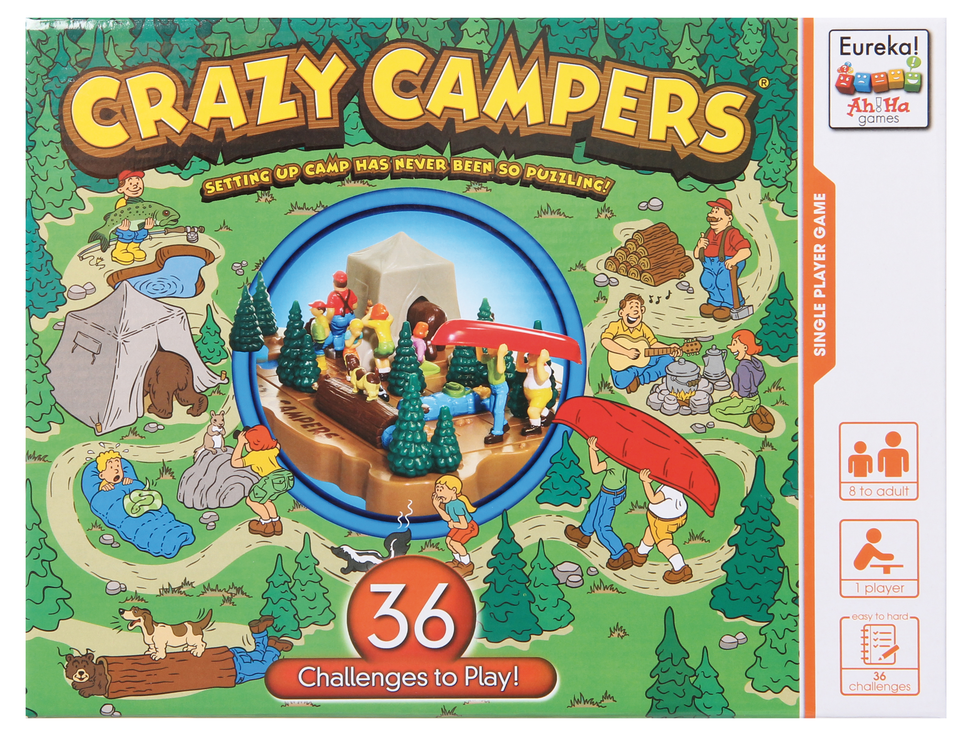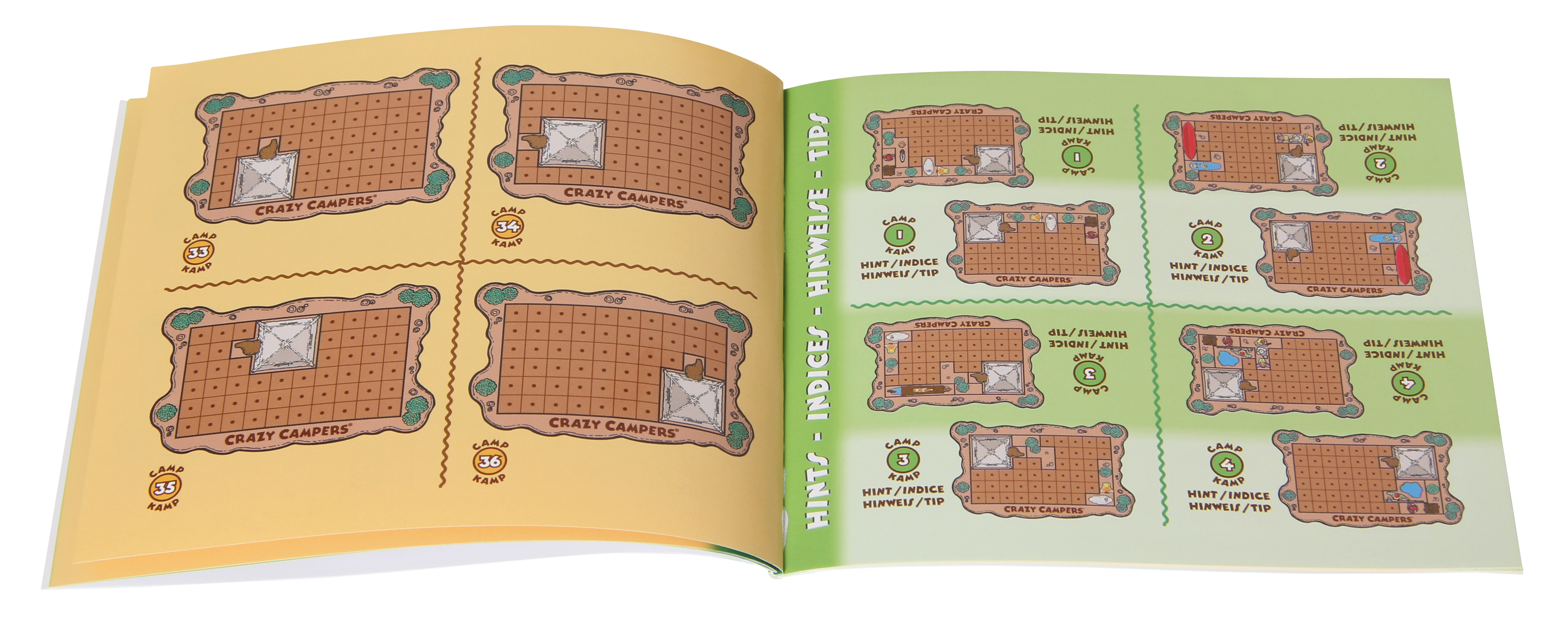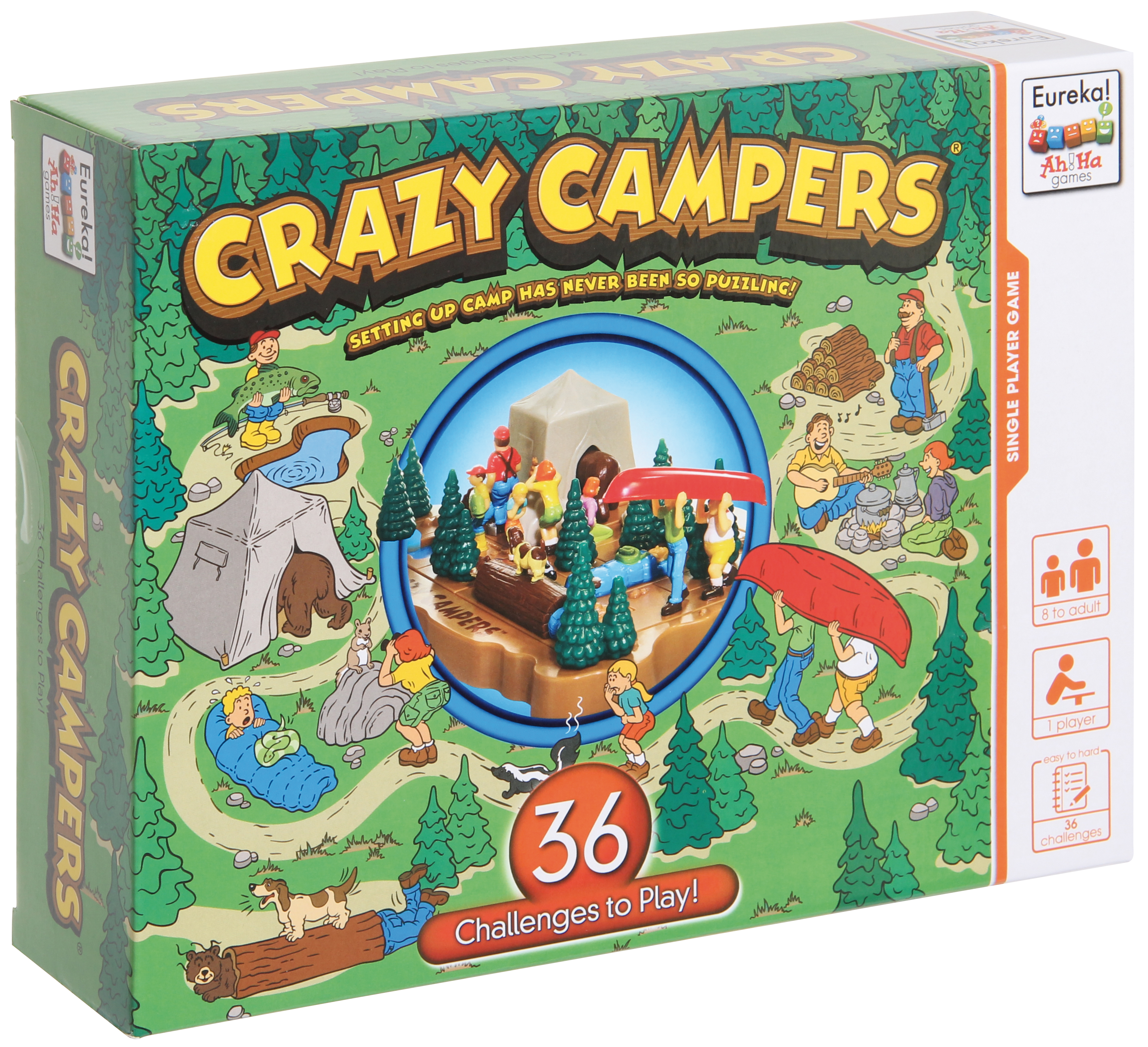 Willkommen bei den Crazy Campern! Noch nie war es so verwirrend, ein Camp aufzuschlagen. Das Ziel: Jede Camp-Aufgabe zeigt, welche Spielsteine zu Beginn auf der Spielfläche wo plaziert werden müssen. Dann füllen Sie einfach die verbleibenden Spielsteine auf. Die Aufgabe ist dann gelöst, wenn der Grundplan des Camps ohne leere Plätze aufgefüllt ist. Worauf warten Sie? Schnappen Sie sich Ihr Zelt, zünden Sie das Lagerfeuer an und beginnen Sie! Für einen Spieler ab 8 Jahren. Inklusive 36 Aufgabenkarten in verschiedenen Schwierigkeitsgraden.
