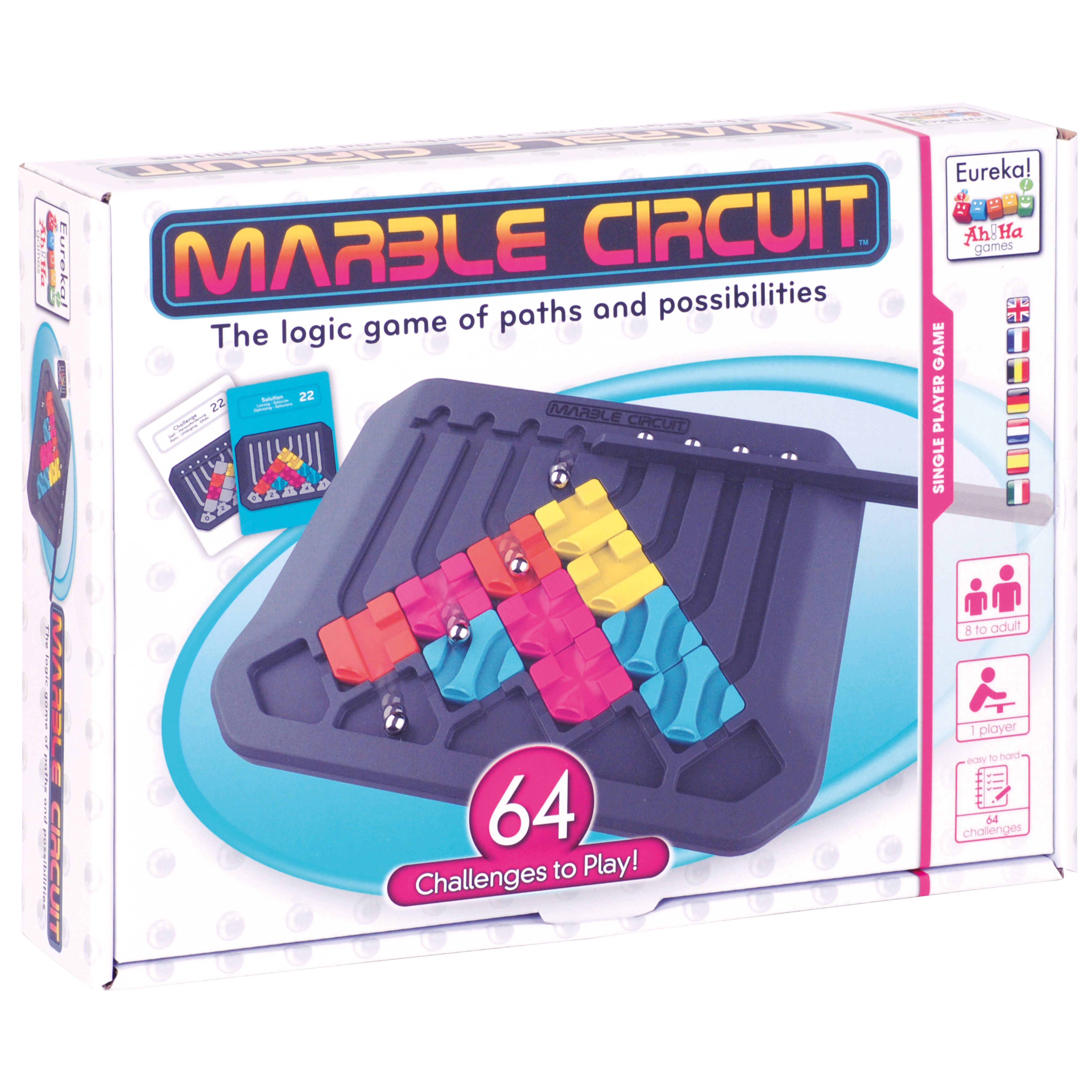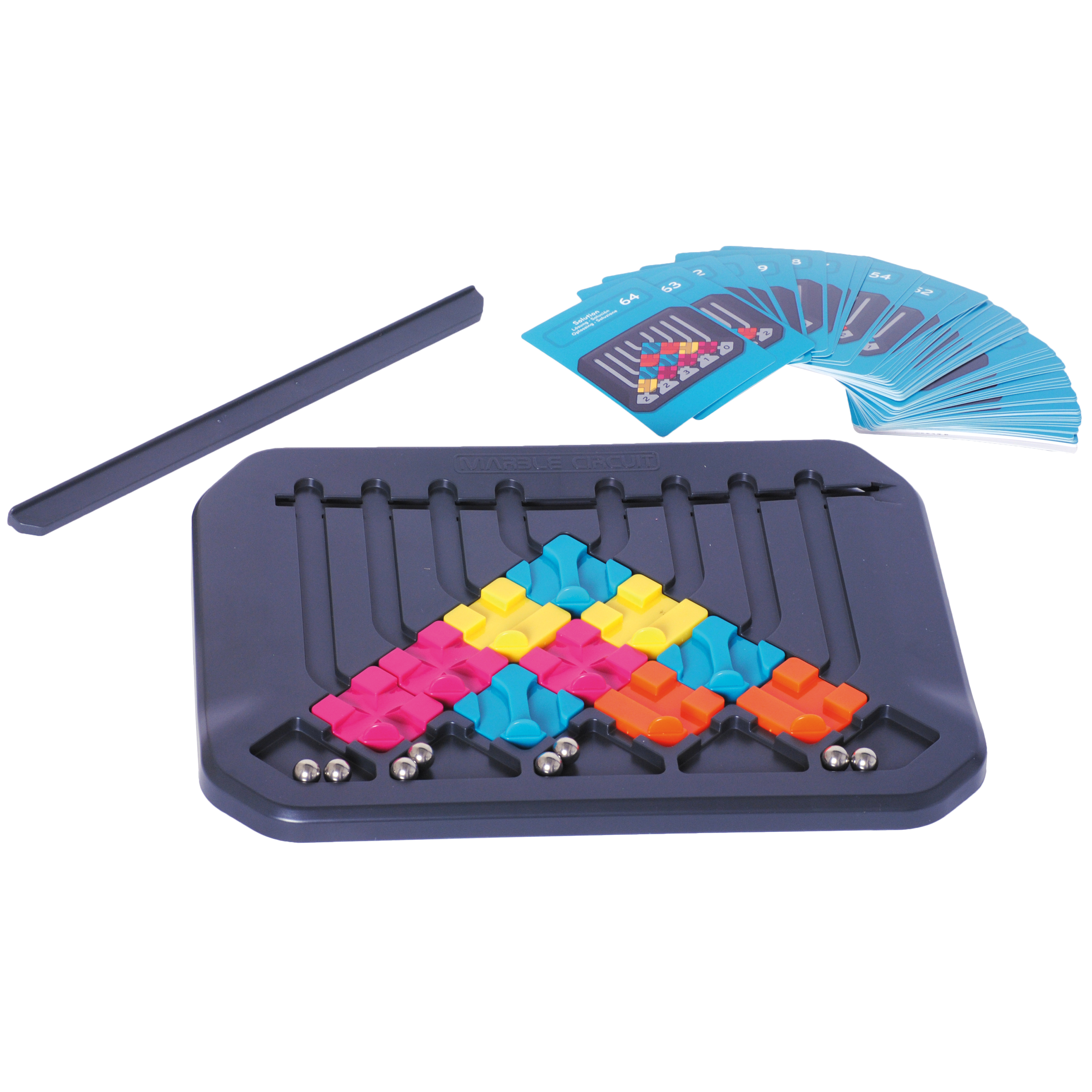 Das Logicspiel der Wege und Möglichkeiten! Wählen Sie eine Herausforderungskarte und legen Sie die Startfelder wie auf der Karte angegeben auf das Spielbrett. Beachten Sie die Zahlen in den Zielfeldern aus der Karte. Diese Zahlen geben die Anzahl der Murmeln an, die in den Zielfeldern enden sollen. Sagen Sie die Wege der Murmeln voraus und legen Sie die verbleibenden geheimnissvollen Felder aus das Spielbrett. Schieben Sie das Tor langsam nach rechts um die Murmeln freizugeben. Lagen Sie richtig? Ab 8 Jahren, für 1 Spieler. 64 Aufgaben.