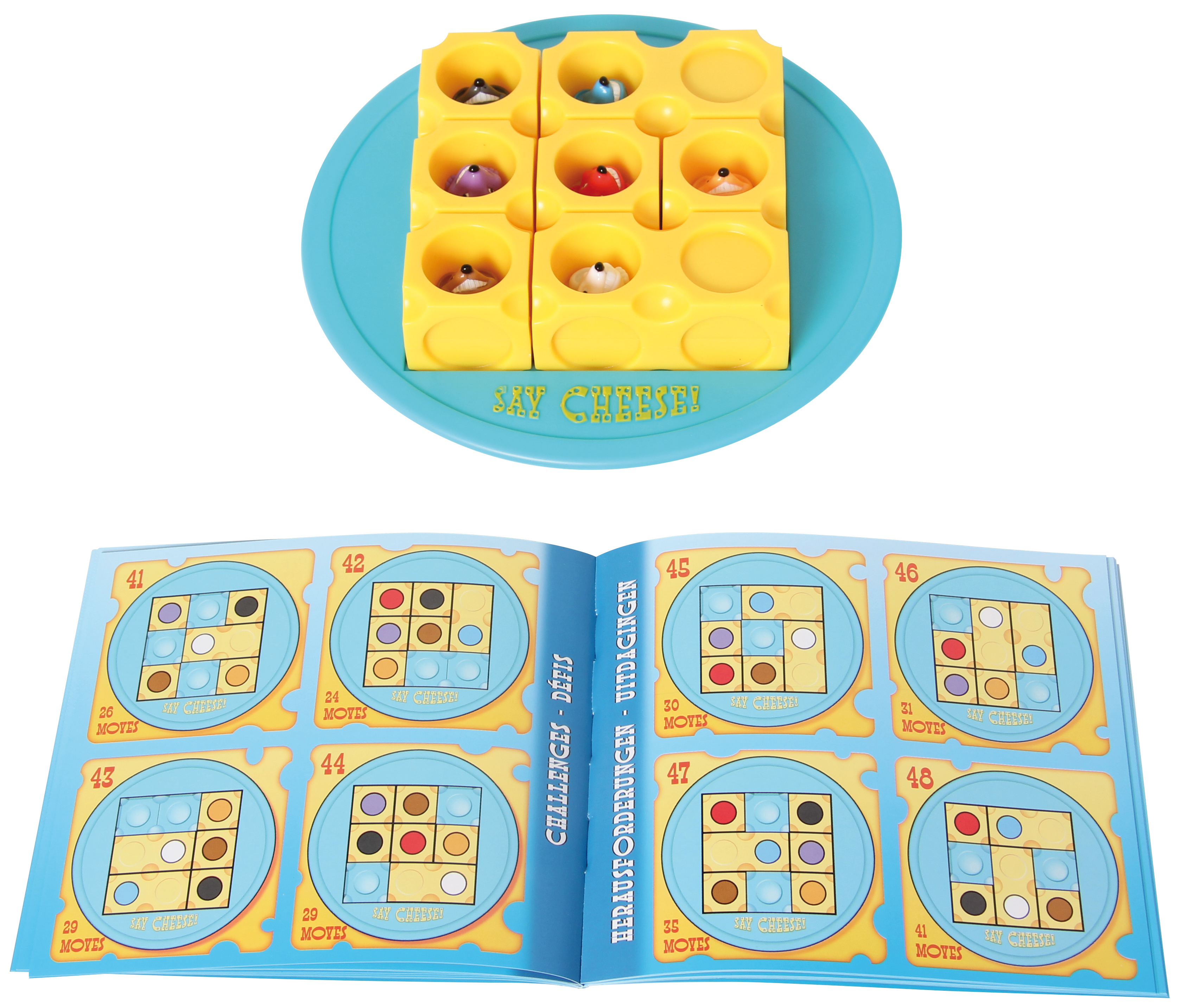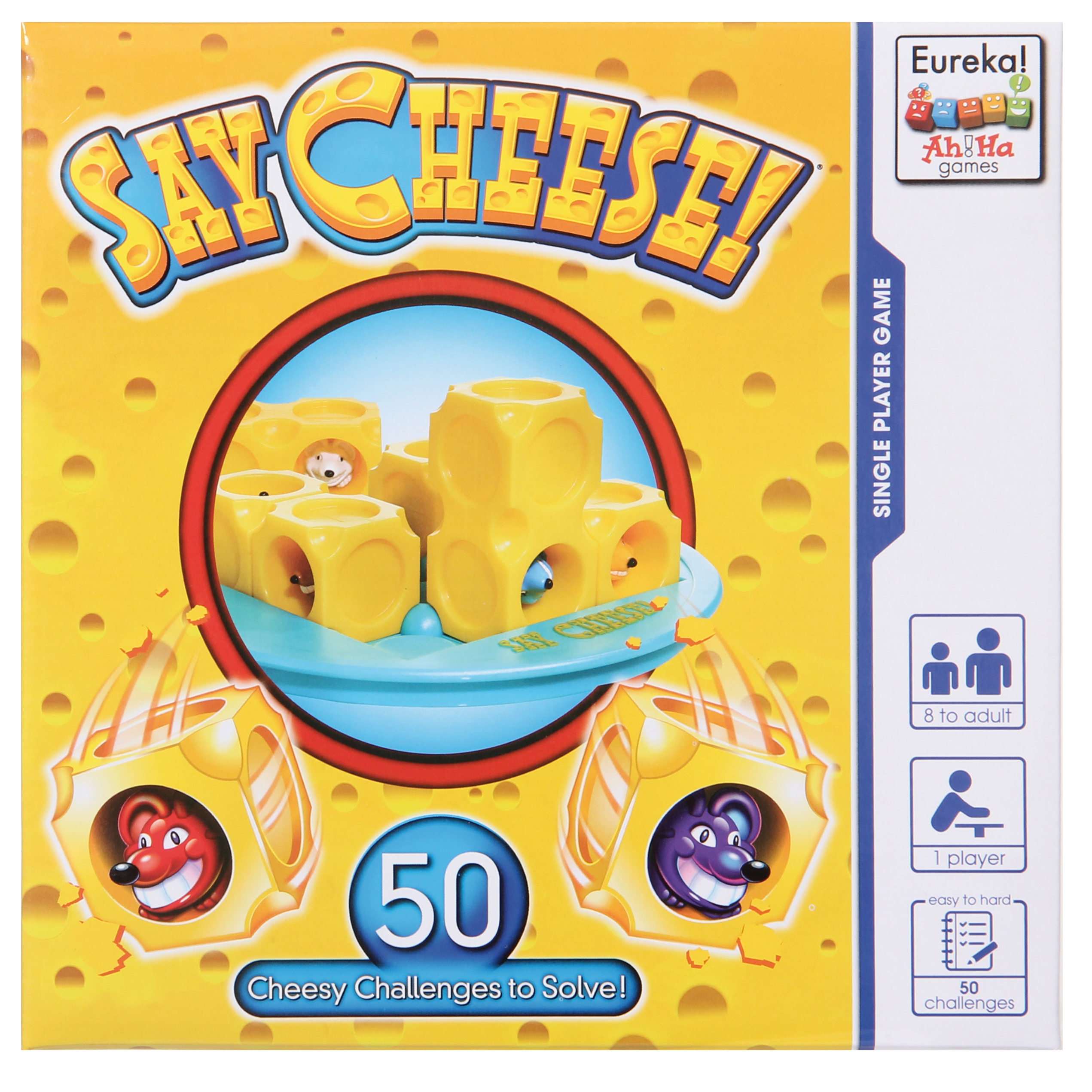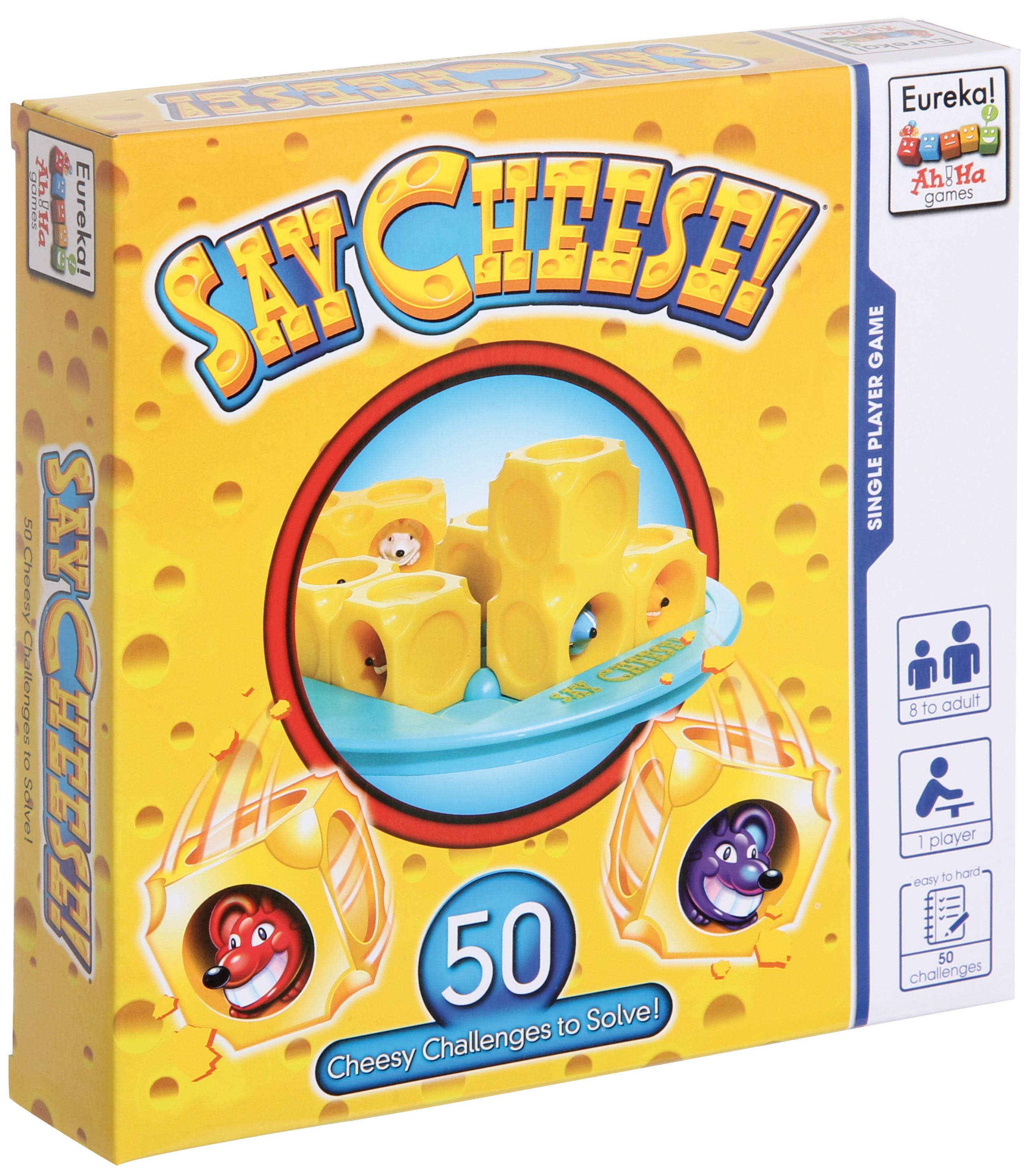 Willkommen bei Say Cheese, dem Käseroll-Denkspiel! Das Ziel: Wählen Sie eine Vorlage und ordnen Sie alle Käsewürfel so an, dass alle Mäuseschwänze nach oben zeigen. Rollen Sie diese Käsewürfel dann im Gitter, bis alle Mäuseköpfe nach oben zeigen. Worauf warten Sie? Say Cheese! Ab 8 Jahren, mit 50 Aufgaben.