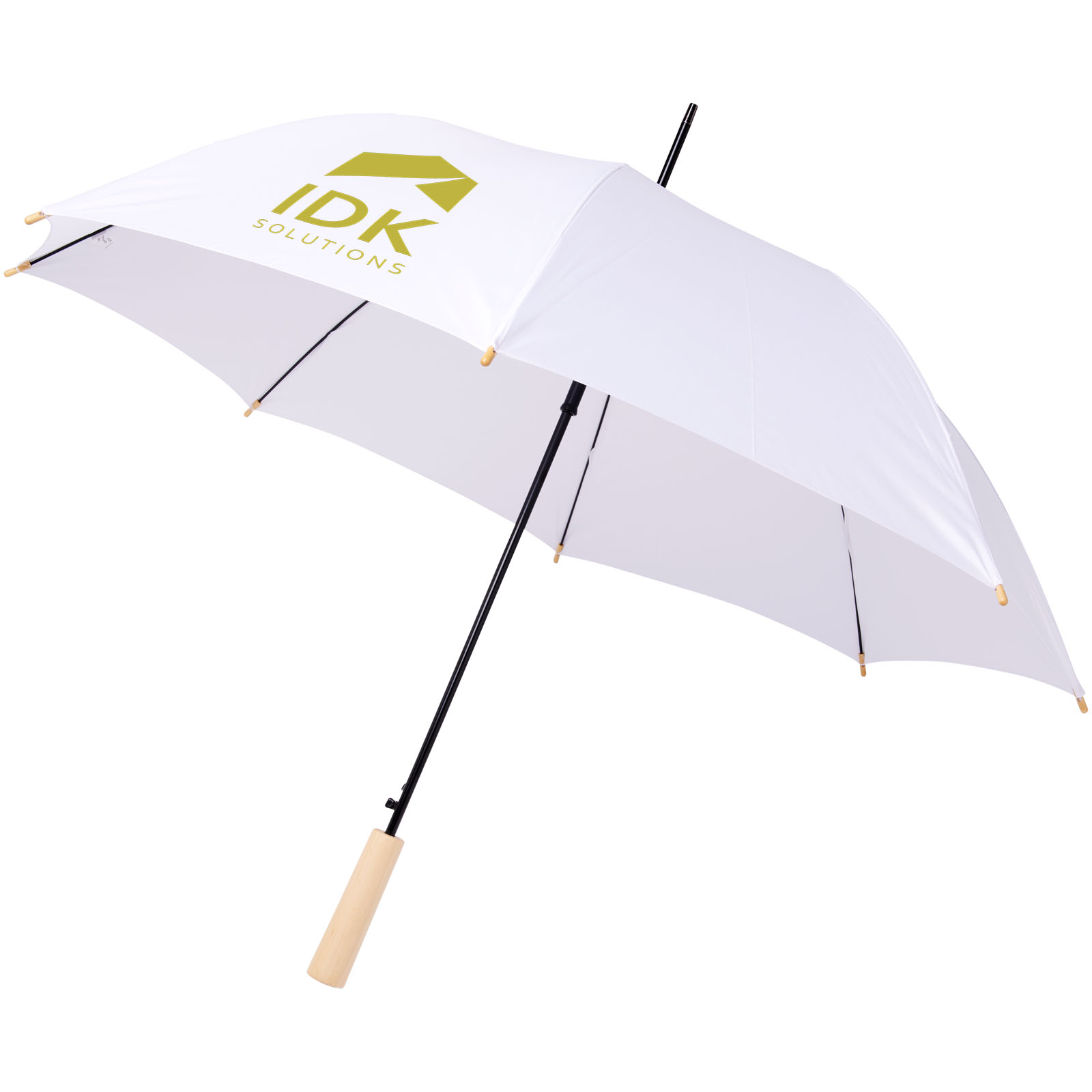 Automatikregenschirm mit Schirm aus recyceltem PET-Pongee-Polyester. Robuster Metallschaft und ein hochwertiger Rahmen mit Glasfaserrippen, der Flexibilität bei Wind bietet. Zusammen mit dem Holzgriff, den Spitzen und dem Schirm aus recyceltem PET-Pongee-Polyester bietet er eine nachhaltigere Wahl. Erhältlich in vielen verschiedenen modernen Farben mit einer großen Werbeanbringungsfläche auf jedem Paneel.