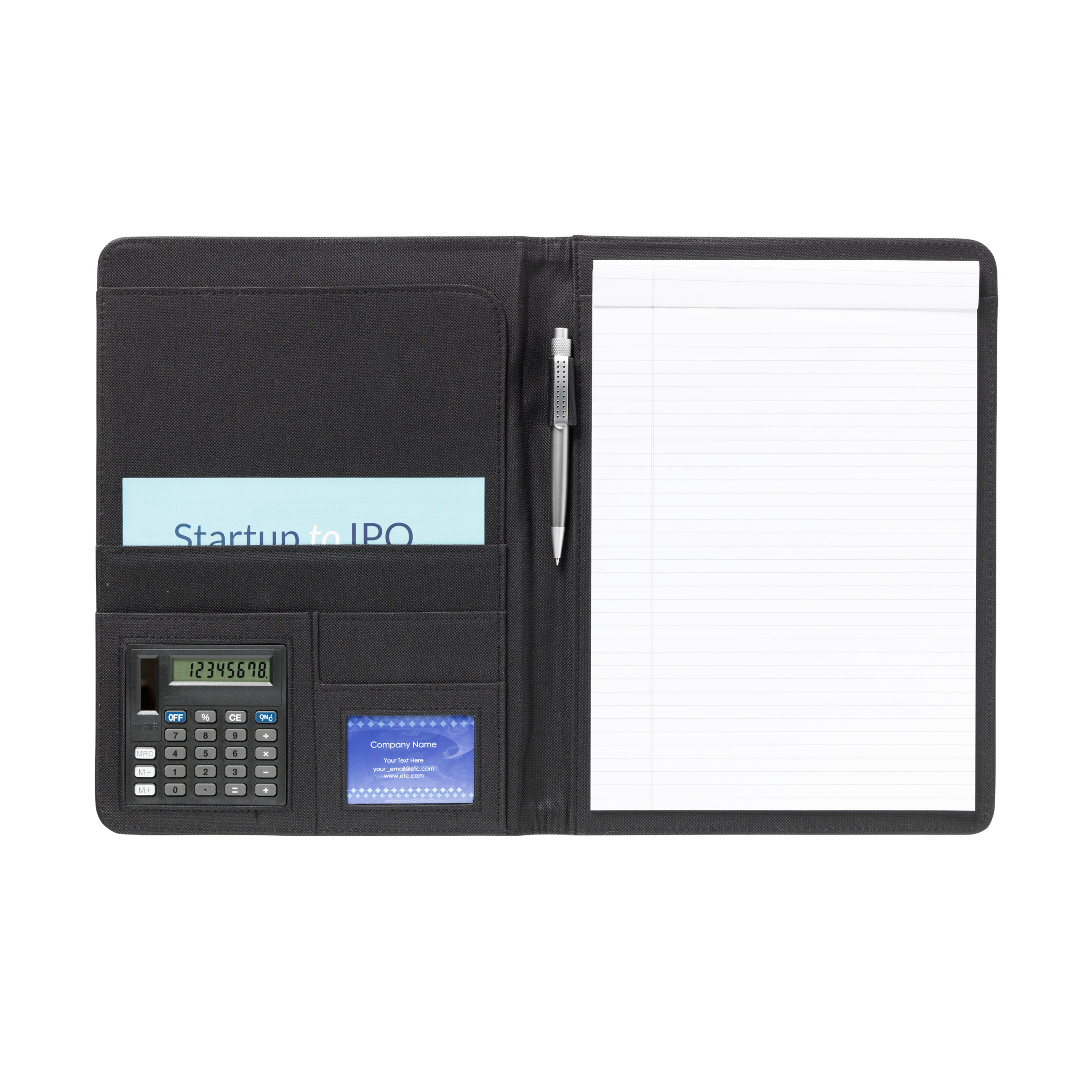Schreibmappe / Dokumentenmappe aus 600 D Polyester / Lederimitat im DIN A4-Format. Inkl. herausnehmbarem Dualpower-Solarrechner (inkl. Zellbatterie), Schreibblock und Kugelschreiber.