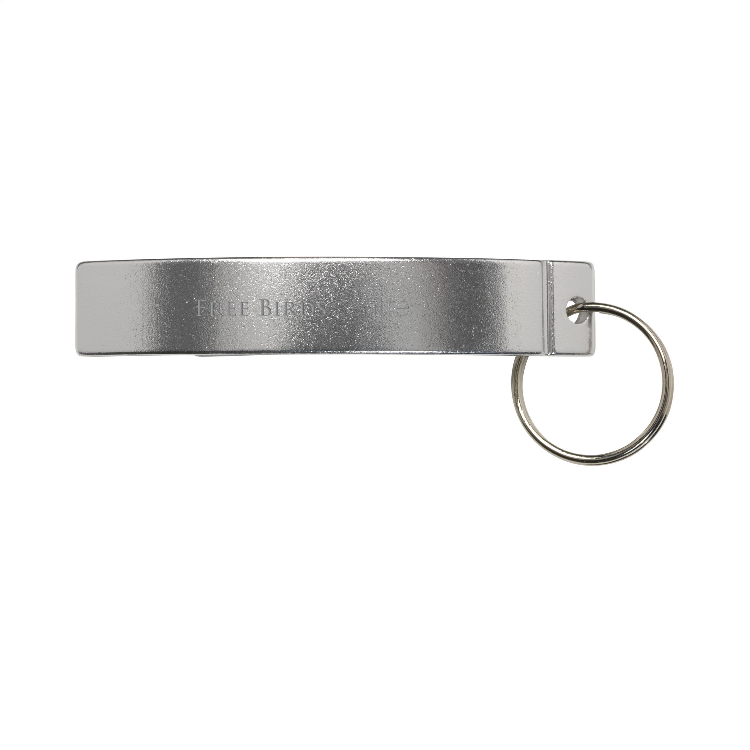 Schlüsselanhänger mit Öffner aus Aluminium.