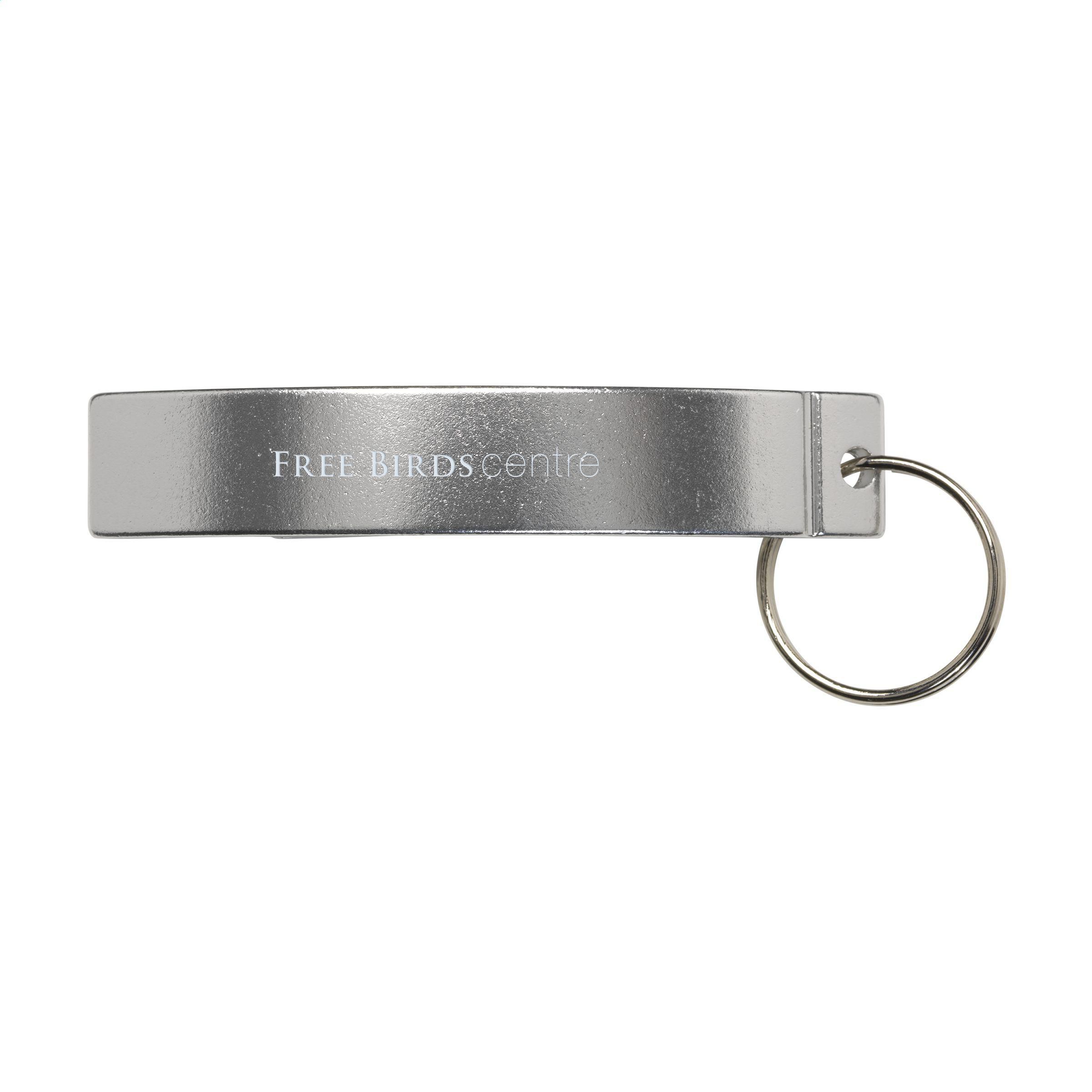Schlüsselanhänger mit Öffner aus Aluminium.