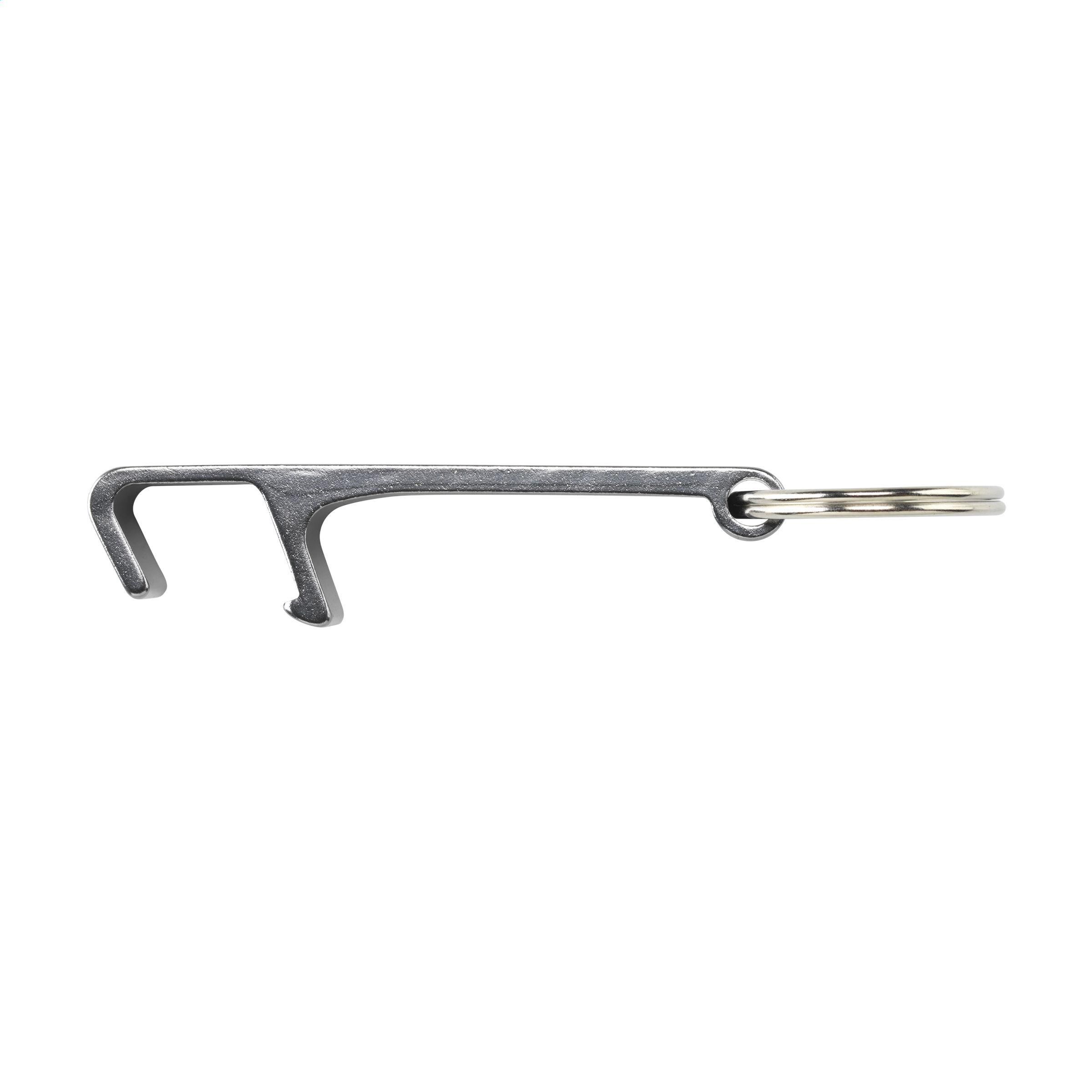 Schlüsselanhänger mit leichtem Flaschenöffner aus 100% GRS-zertifiziertem recyceltem Aluminium. Der Öffner kann auch als Telefonständer verwendet werden.Durch die Verwendung von recyceltem Aluminium kommt eine geringere Menge an neuen Rohstoffen zum Einsatz. Das bedeutet weniger Energieverbrauch und weniger Wasserverbrauch.