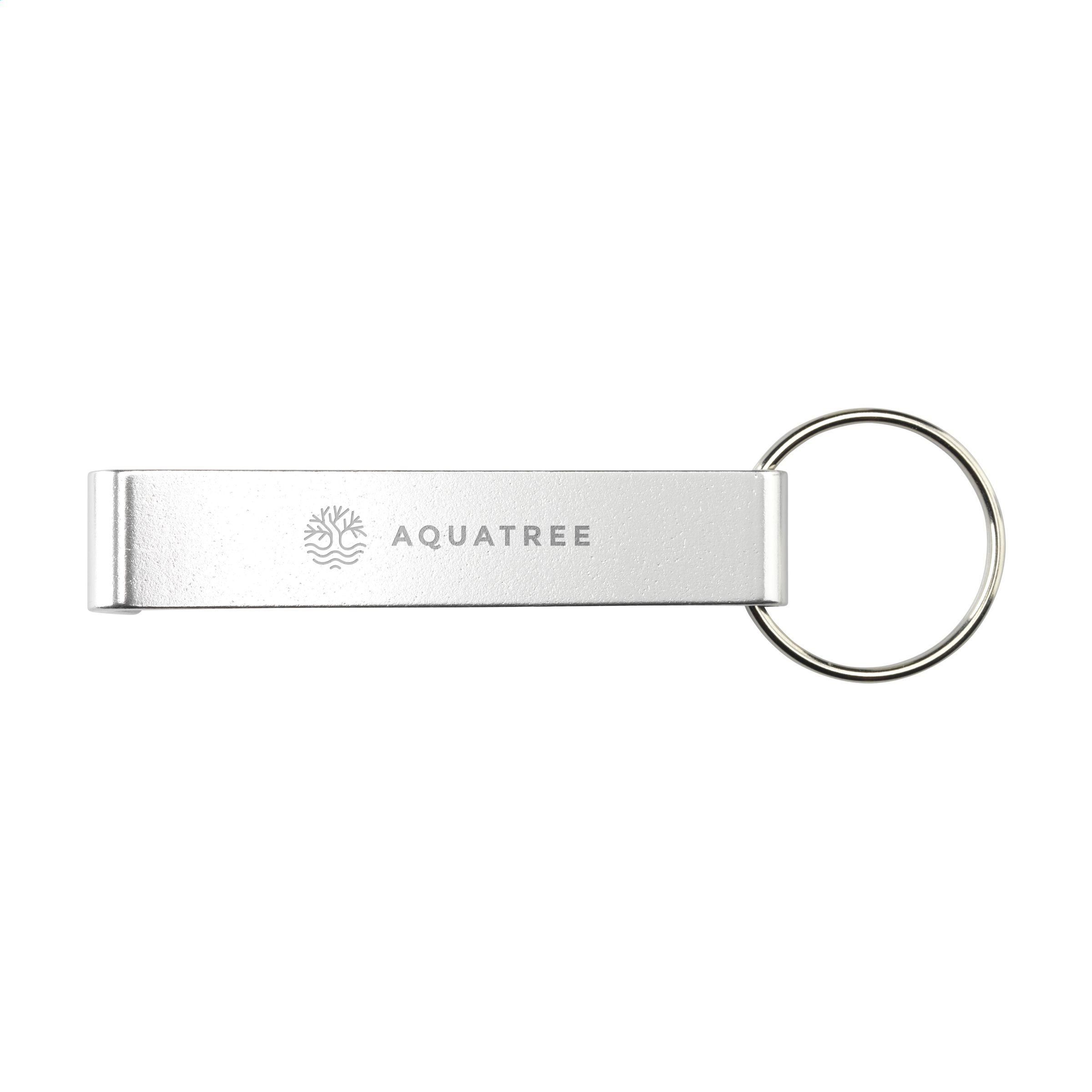 Schlüsselanhänger mit leichtem Flaschenöffner aus 100% GRS-zertifiziertem recyceltem Aluminium. Der Öffner kann auch als Telefonständer verwendet werden.Durch die Verwendung von recyceltem Aluminium kommt eine geringere Menge an neuen Rohstoffen zum Einsatz. Das bedeutet weniger Energieverbrauch und weniger Wasserverbrauch.