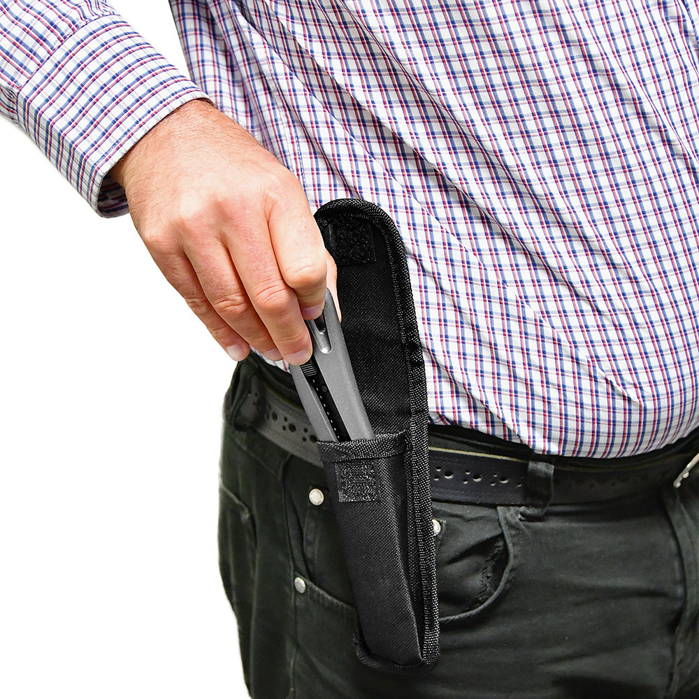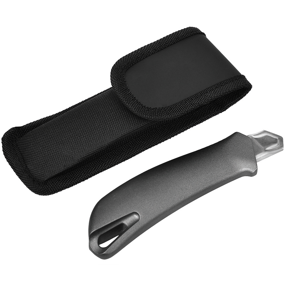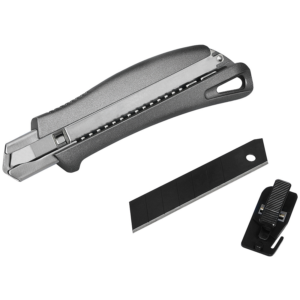 Cuttermesser mit 18 mm Abbrechklinge. Extrem hohe Schnitthaltigkeit durch den hohen Kohlenstoffgehalt der SK2 Stahlklinge. In der Metallführungsschiene mit Schieberaster kann die Klinge in der gewünschten Länge arretiert werden. Rücklaufsperre in der Führungsschiene, die verhindert, dass die Klinge beim Zurückfahren einfach aus dem Gehäuse springt. Die Klinge wurde brüniert, was die Klinge durch eine chemische Reaktion schwarz werden lässt. Dieses Verfahren dient zum Korrosionsschutz. Material: robustes Gehäuse aus eloxiertem Aluminium, Klingenführungsschiene aus Metall. Klinge: 18 mm Abbrechklinge aus SK2 Carbonstahl, Stärke 0,6 mm, Rockwell 62~65 HRC (gehobene Premium-Qualitätsstufe), Korrosionsschutz durch Brünieren, max. Klingenausschub 79 mm, 2-seitiger Klingenschliff, 7 Abbrechsegmente für 8-fache Nutzung. Funktionen: Klingenwechsel ohne Hilfsmittel, Rücklaufsperre in der Klingenführungsschiene, Öse zum Anbringen eines Lanyards oder Fangriemen. Zubehör: Nylon-Gürteltasche. Verpackung: schwarze Geschenkverpackung.
