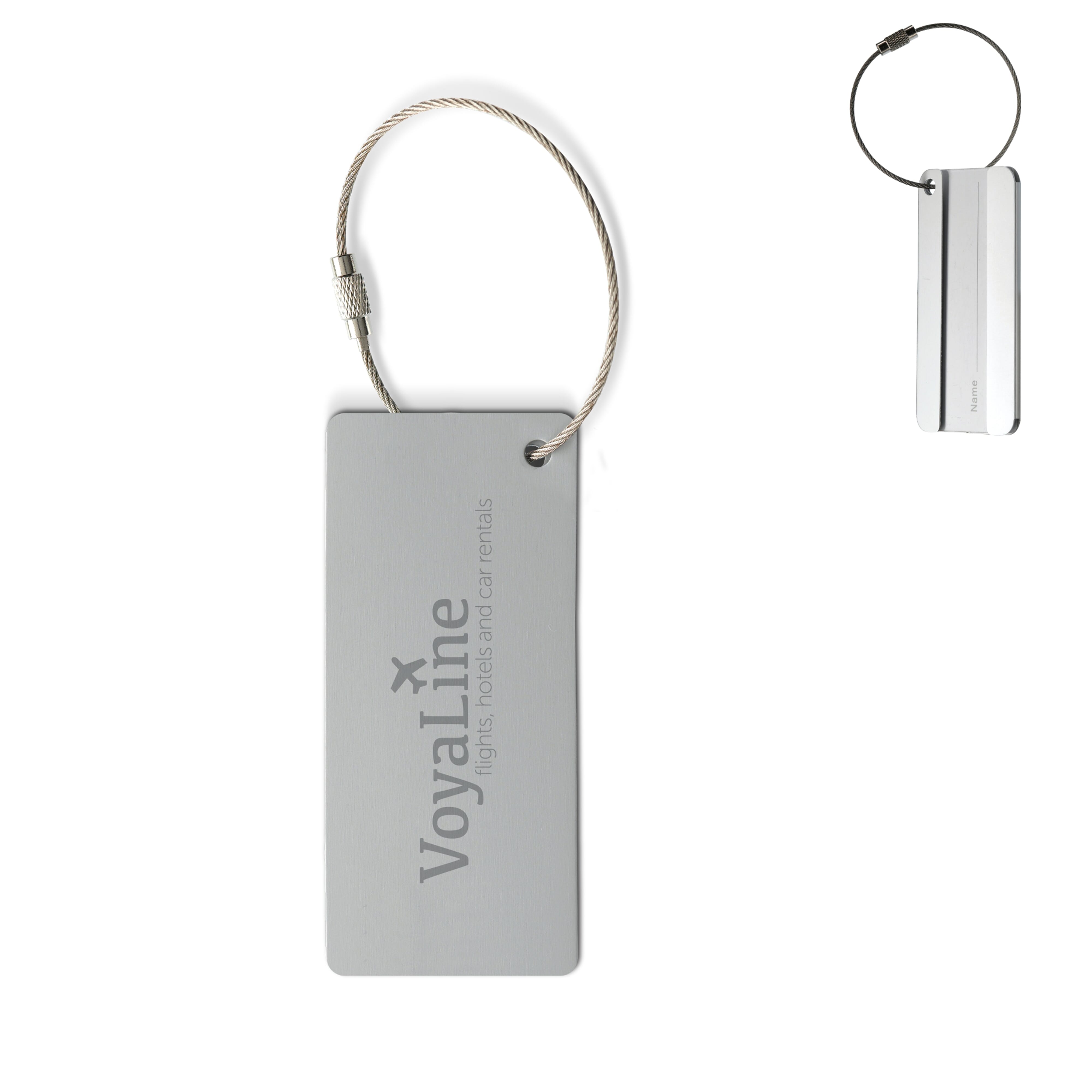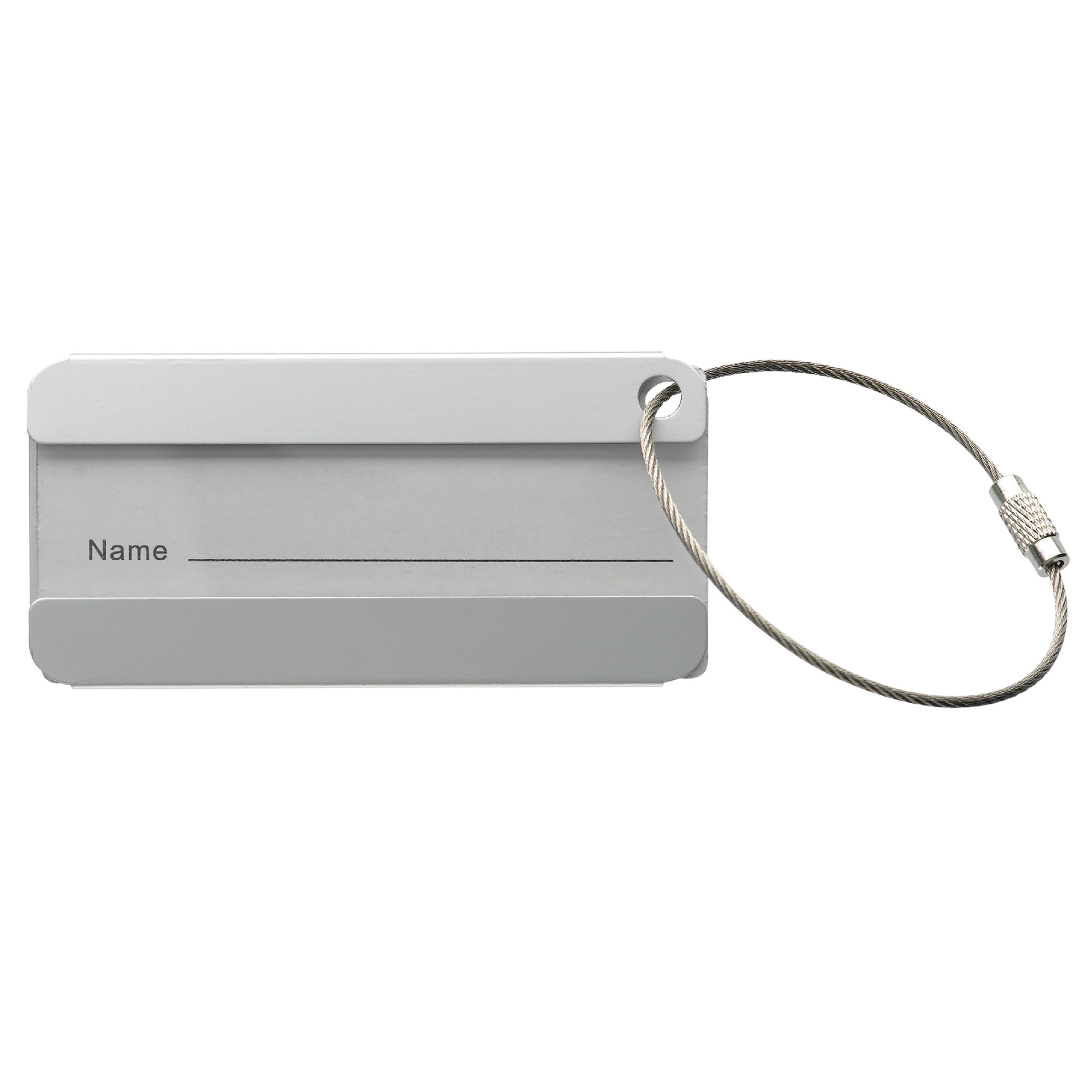 Rechteckiger Alumimium Kofferanhänger mit Draht und Verschluss.