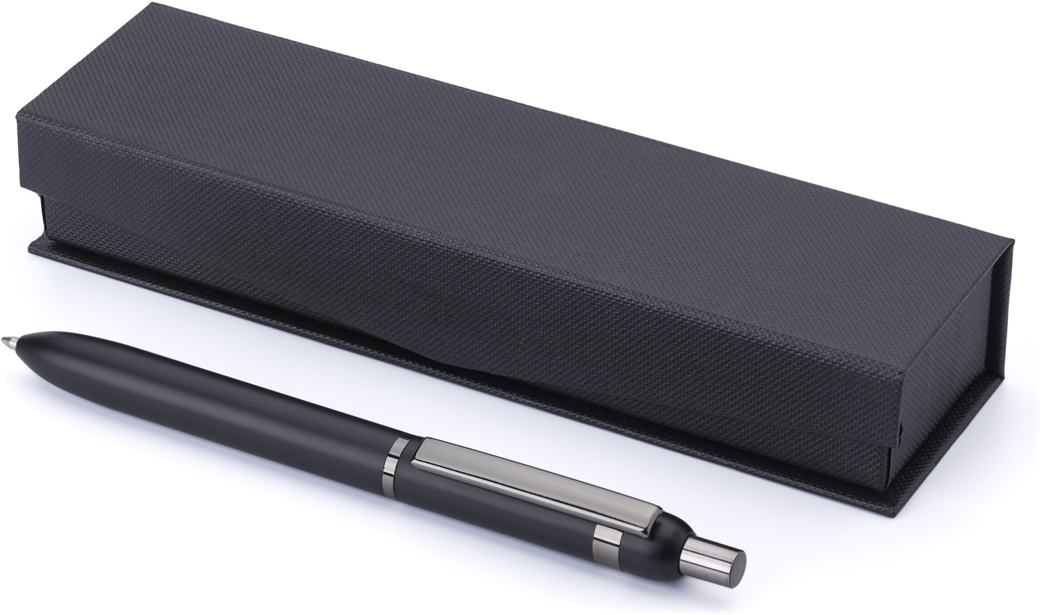 Kugelschreiber aus Aluminium und Messing. Mit glänzenden Details an Clip, Ring und Druckknopf. Blaue Tinte. Einzeln verpackt in magnetischer Geschenkbox mit Papierhülle.