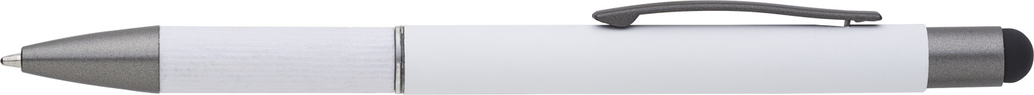 Aluminiumkugelschreiber mit Details aus gerolltem Papier am Griff. Gummispitze für kapazitive Bildschirme. Blaue Tinte.