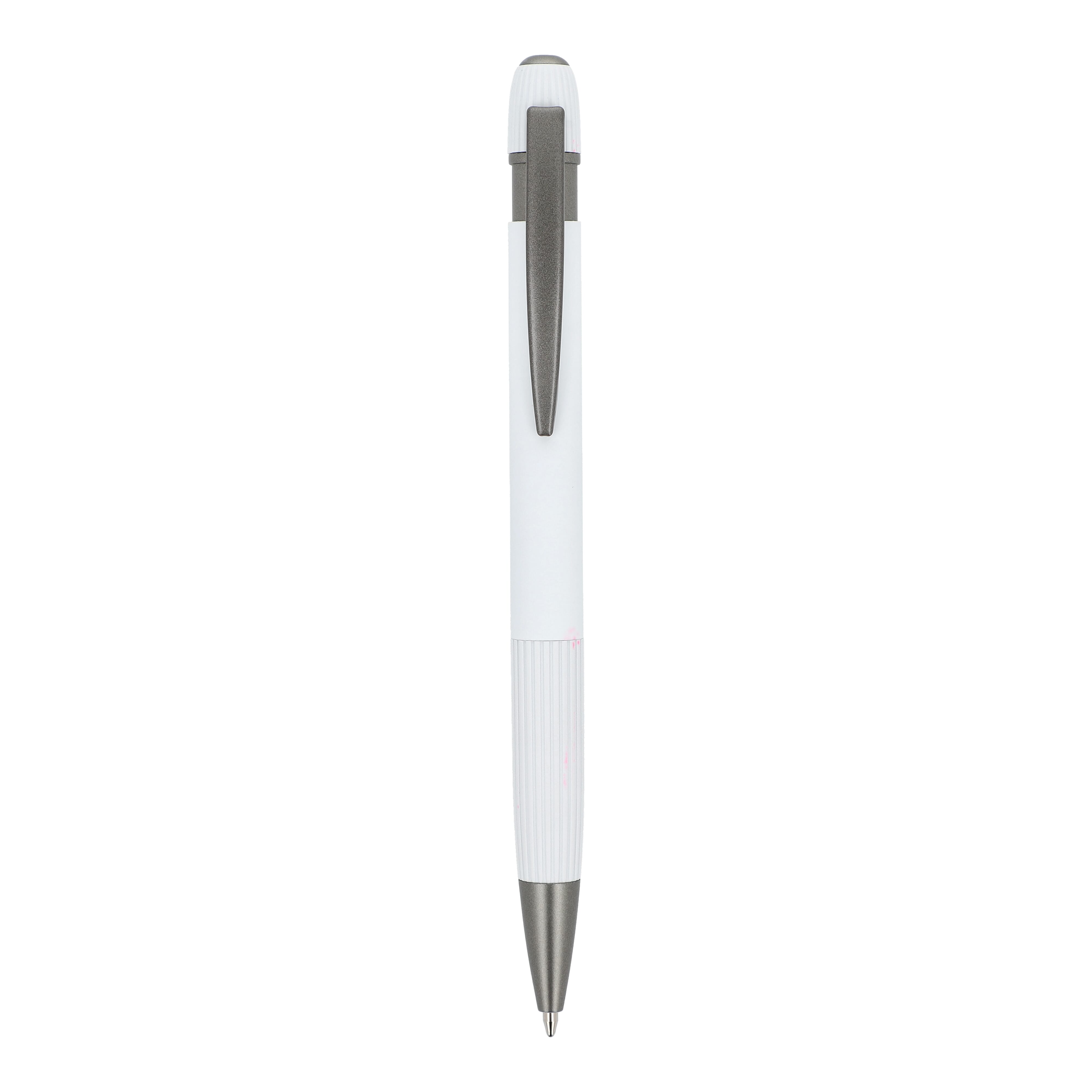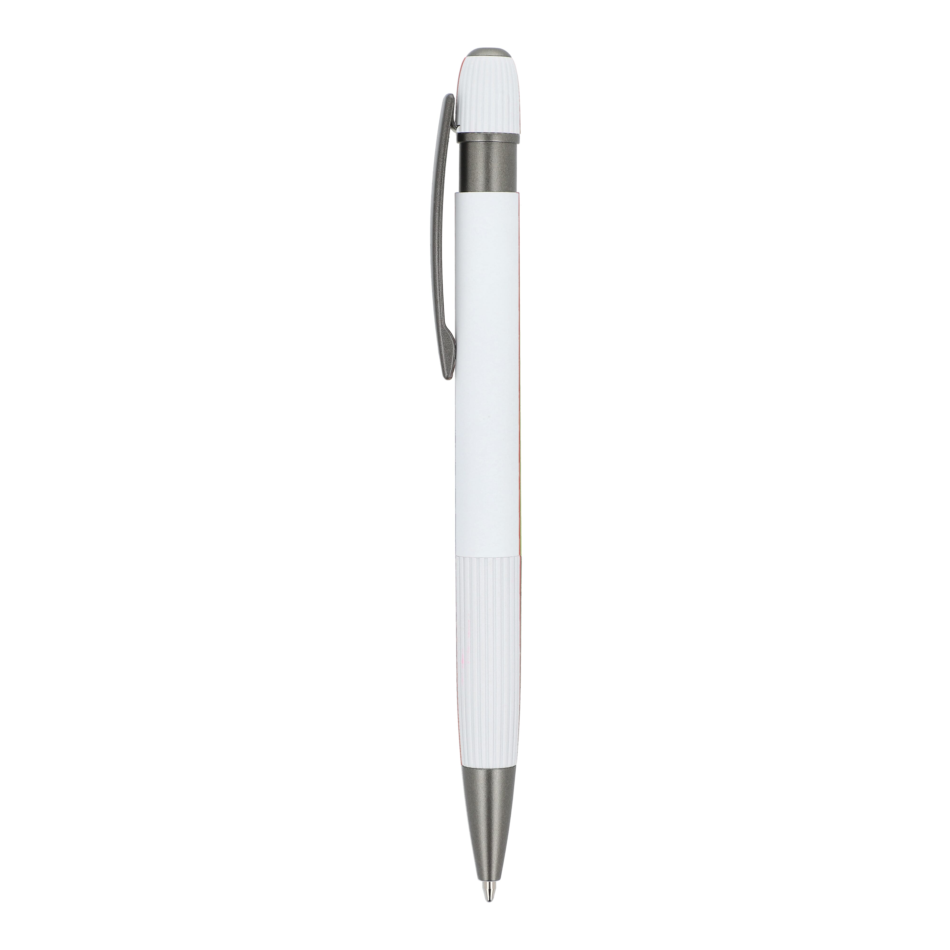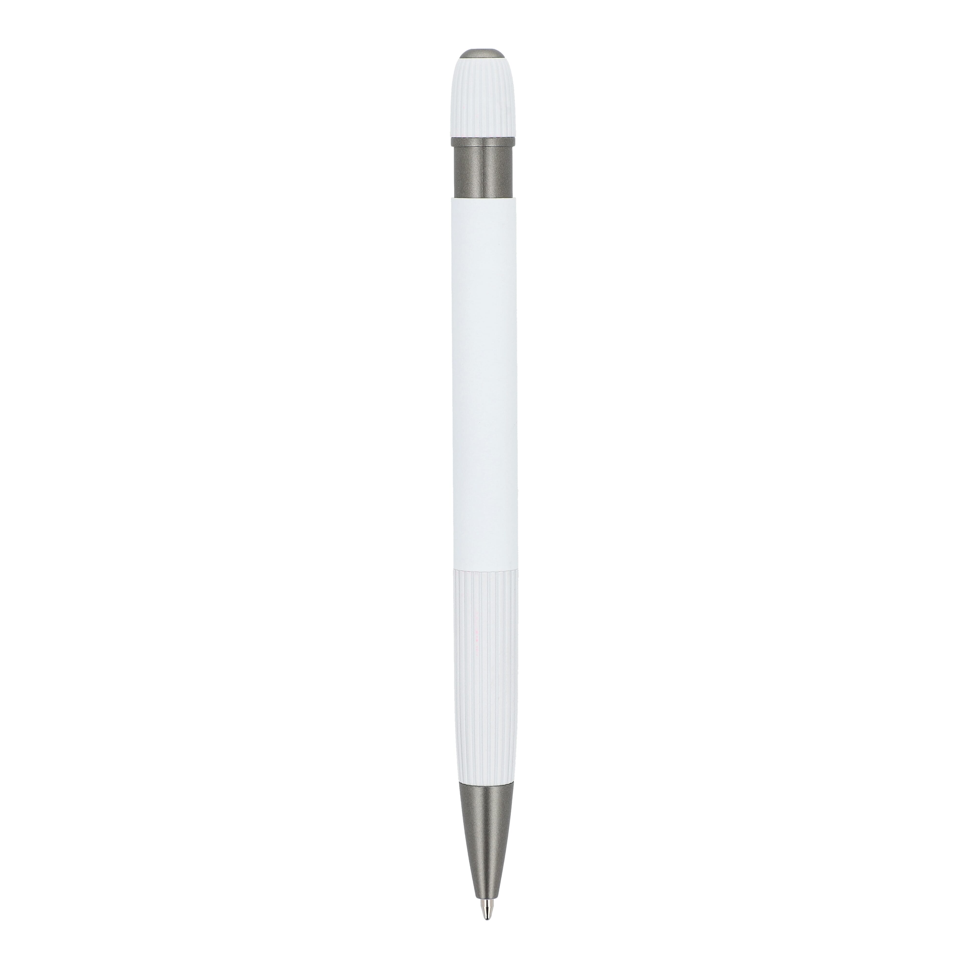 Eleganter Aluminium-Kugelschreiber mit Metallclip. Mit beliebten vertikalen Streifen auf dem Schaft und dem Druckknopf. Der Stift wird mit blauer Tinte geliefert.