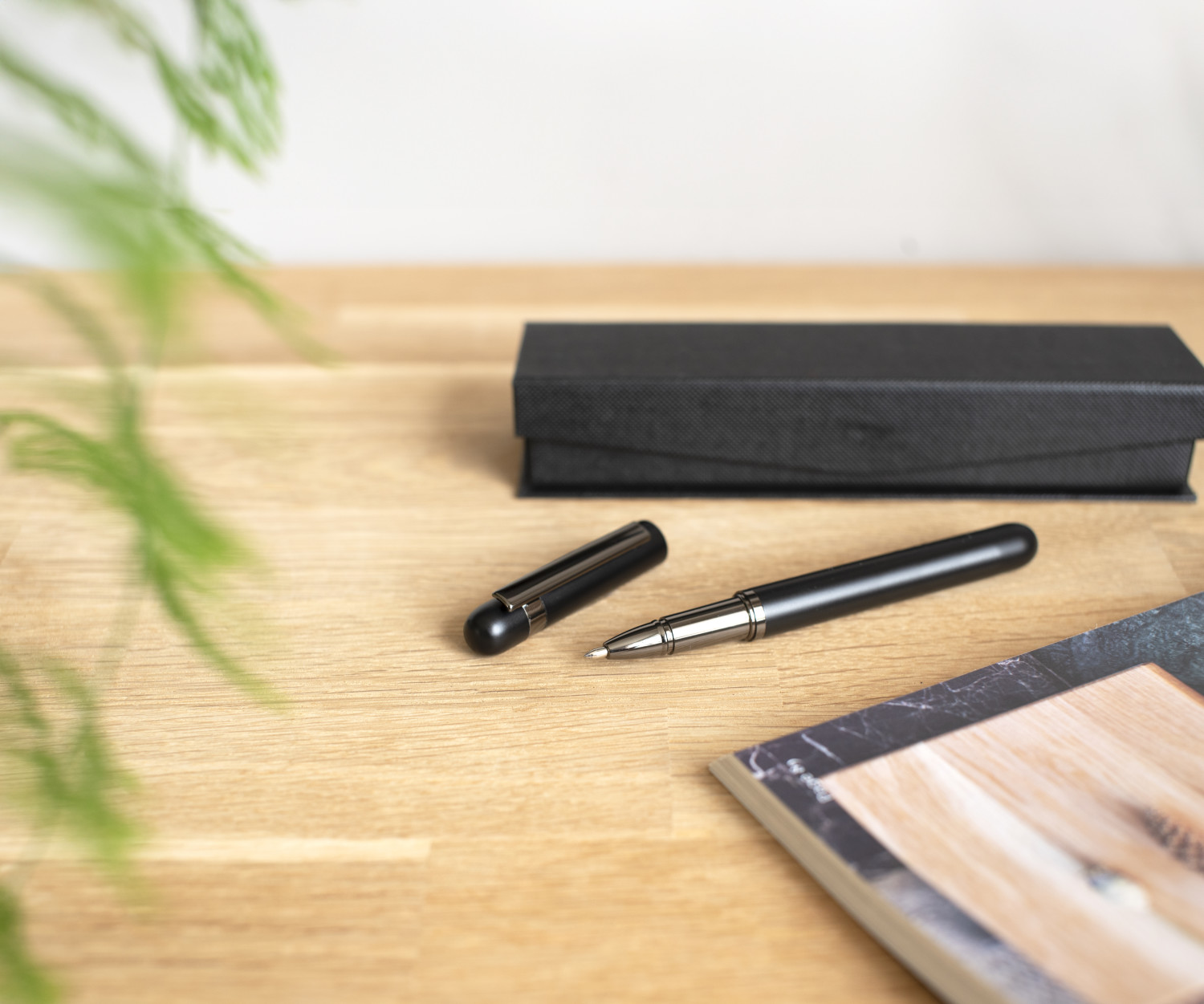 Rollerball-Kugelschreiber aus Aluminium und Messing. Mit glänzenden Details an Clip, Ring und Druckknopf. Blaue Tinte. Einzeln verpackt in magnetischer Geschenkbox mit Papierhülle.
