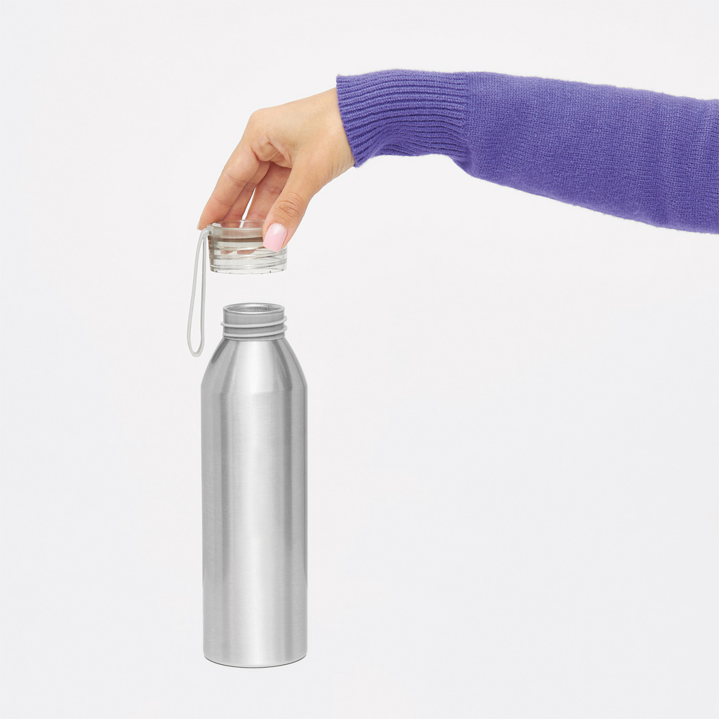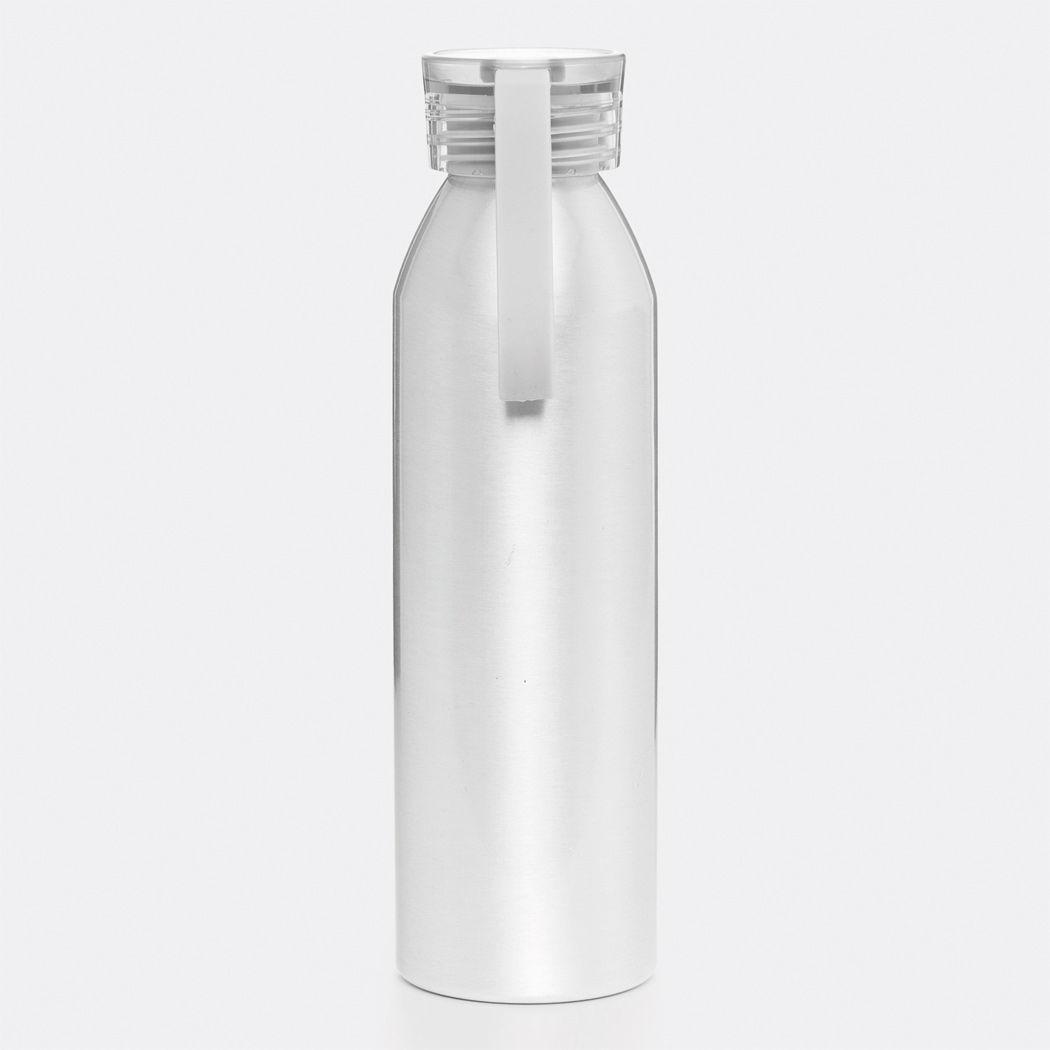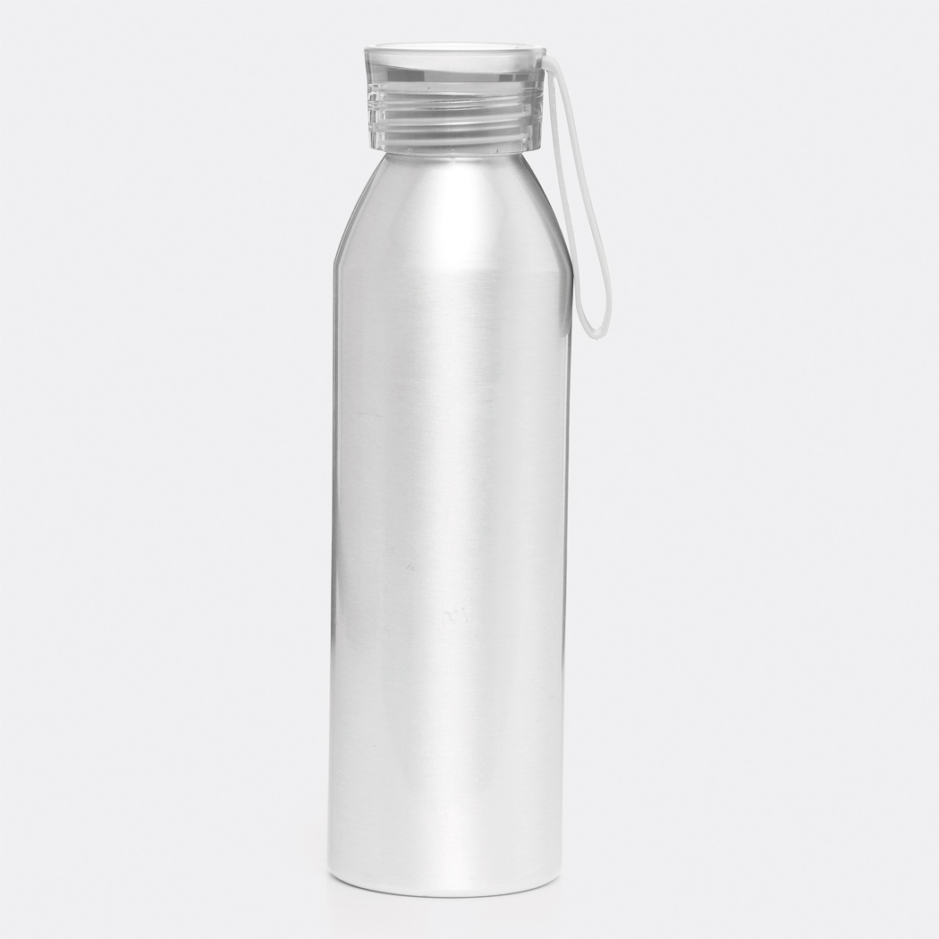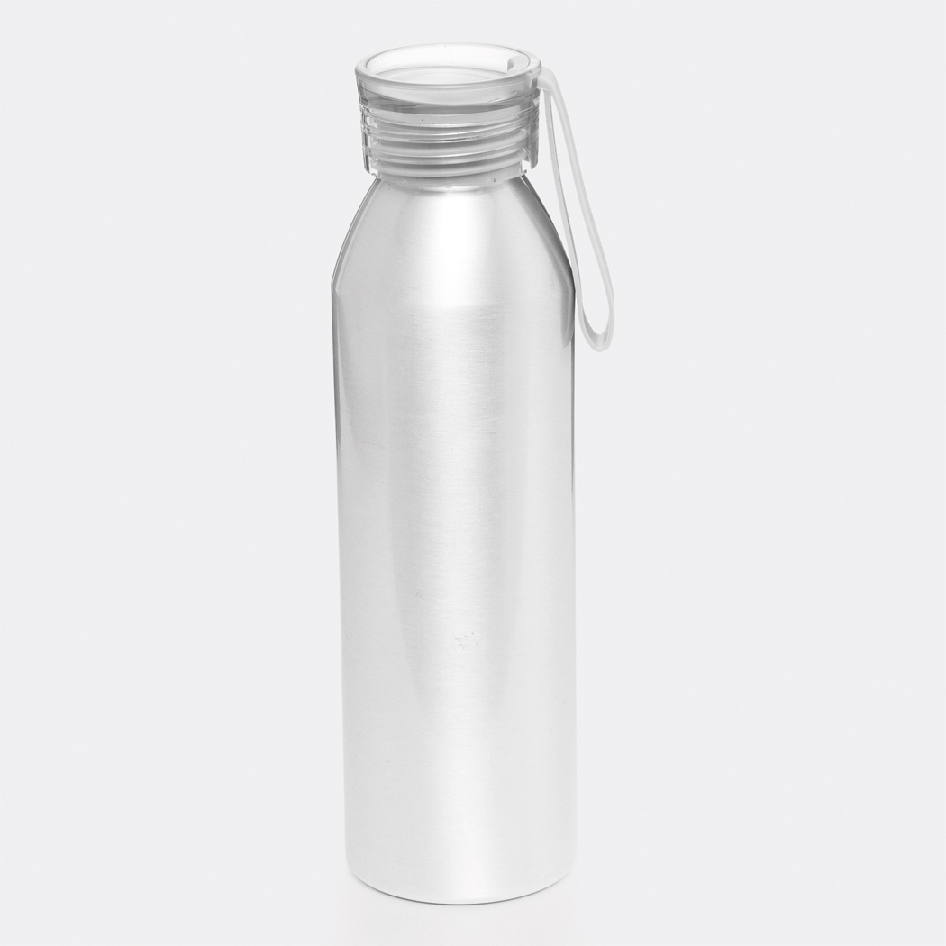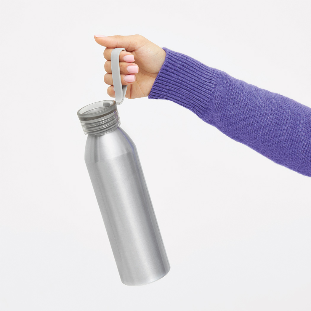Aluminium Trinkflasche COLOURED, einwandig: farbiger Kunststoffdeckel mit Schraubverschluss, Silikonschlaufe, Füllmenge ca. 650 ml.