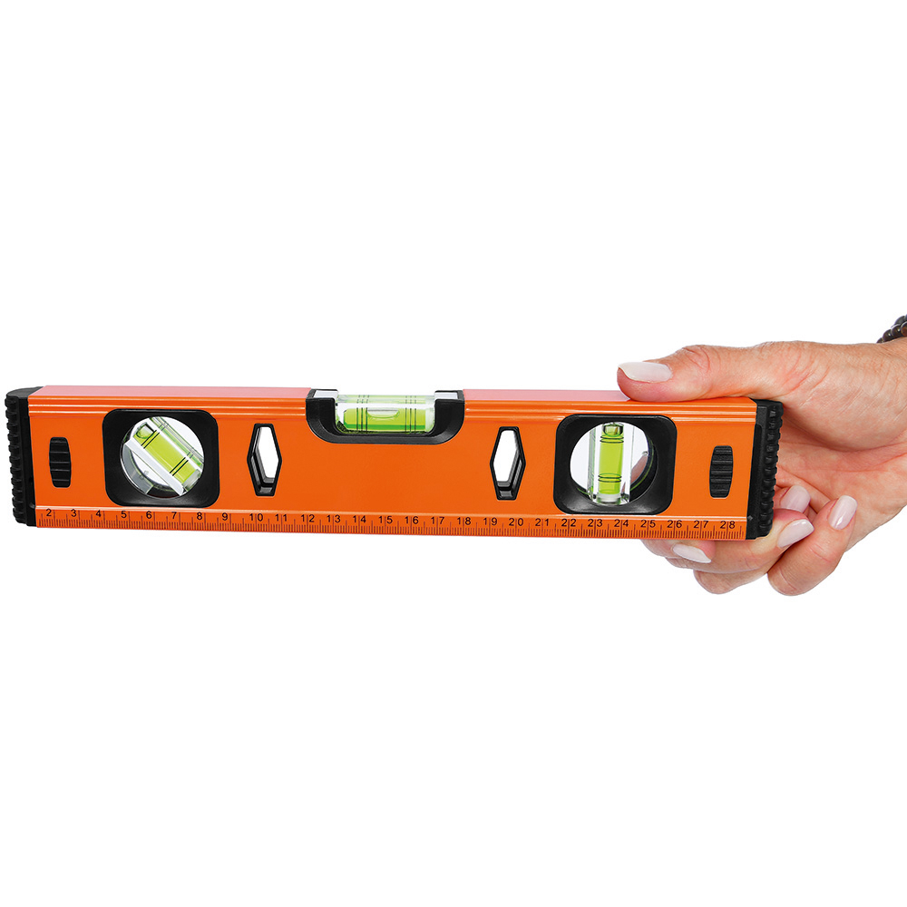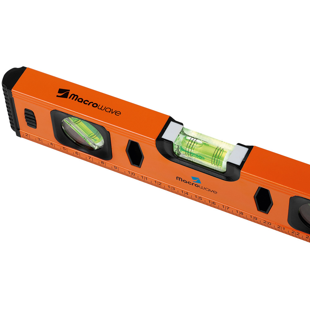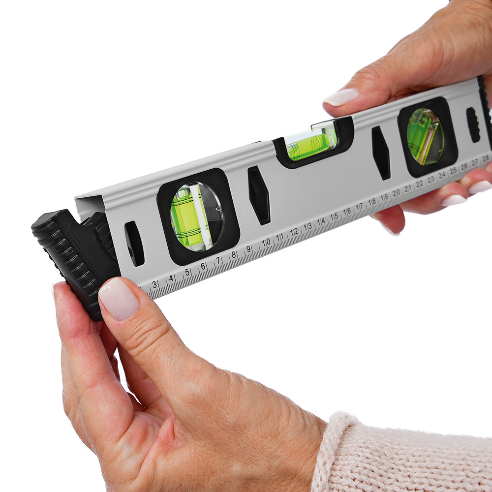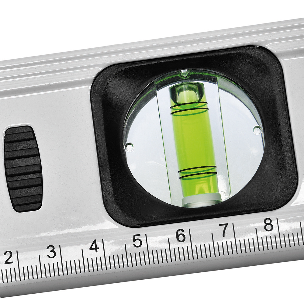 Die schlagfesten Blocklibellen in widerstandsfähigem Acrylglas garantieren eine genaue Messung von 1,0 mm / m und Ausrichtung des Objektes (waagrecht, senkrecht und diagonal). Alle Libellen verfügen zusätzlich über einen zweiten Ablesering zum Ausrichten für 1%-Neigungen. Die gefräste, breite Messfläche mit integrierten starken Magneten verhindert das Wegrutschen der Wasserwaage auf glatten Oberflächen und garantiert eine hohe Standfestigkeit. Die abnehmbaren und stoßsicheren Endkappen schützen das Profil bei Schlägen. Die Wasserwaage verfügt beidseitig über zwei Zentimeterskalen und ermöglicht so ein präzises Messen in allen Positionen. Gehäuse: robustes Aluminiumprofil, pulverbeschichtet, mit Verstärkungsrippen. Libellen: Blocklibellen horizontal, vertikal, diagonal, mit 2 Ableseringen für 1%-Neigung. Messgenauigkeit: ± 1,0 mm / m / 0,029°. Ausstattung: abnehmbare Endkappen stoßdämpfend, breite rillengefräste Messfläche mit integrierten starken Magneten, beidseitige abriebfeste Messskala (30 cm), Ösen. Verpackung: schwarze Geschenkverpackung.