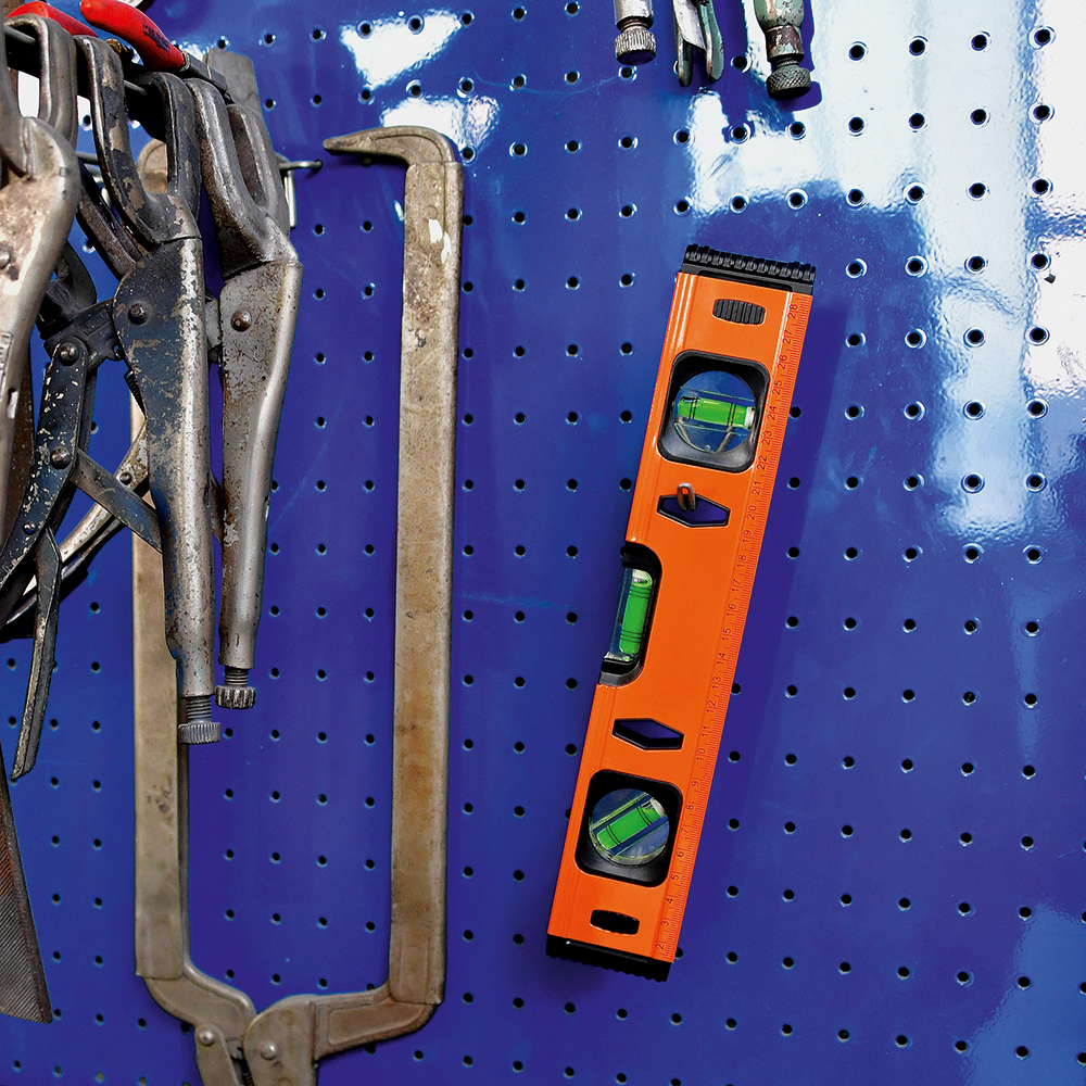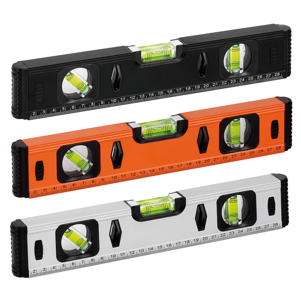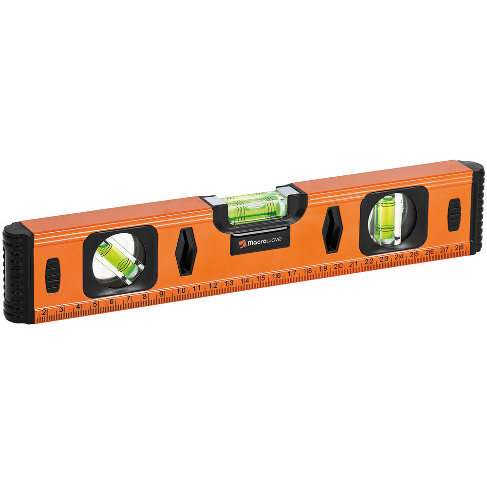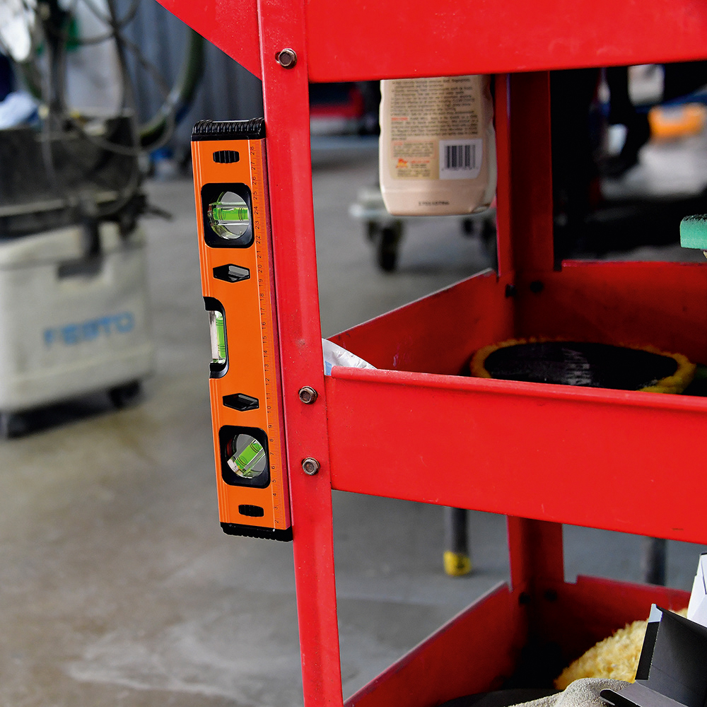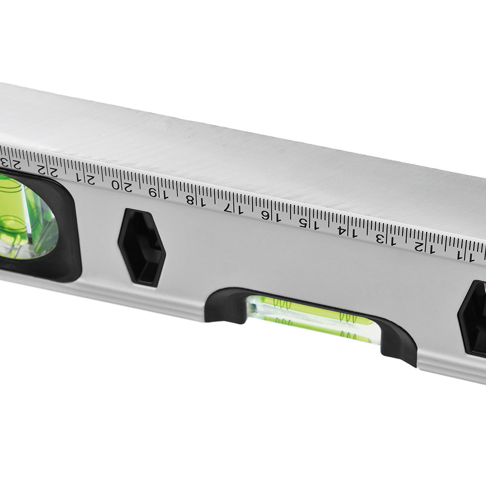 Die schlagfesten Blocklibellen in widerstandsfähigem Acrylglas garantieren eine genaue Messung von 1,0 mm / m und Ausrichtung des Objektes (waagrecht, senkrecht und diagonal). Alle Libellen verfügen zusätzlich über einen zweiten Ablesering zum Ausrichten für 1%-Neigungen. Die gefräste, breite Messfläche mit integrierten starken Magneten verhindert das Wegrutschen der Wasserwaage auf glatten Oberflächen und garantiert eine hohe Standfestigkeit. Die abnehmbaren und stoßsicheren Endkappen schützen das Profil bei Schlägen. Die Wasserwaage verfügt beidseitig über zwei Zentimeterskalen und ermöglicht so ein präzises Messen in allen Positionen. Gehäuse: robustes Aluminiumprofil, pulverbeschichtet, mit Verstärkungsrippen. Libellen: Blocklibellen horizontal, vertikal, diagonal, mit 2 Ableseringen für 1%-Neigung. Messgenauigkeit: ± 1,0 mm / m / 0,029°. Ausstattung: abnehmbare Endkappen stoßdämpfend, breite rillengefräste Messfläche mit integrierten starken Magneten, beidseitige abriebfeste Messskala (30 cm), Ösen. Verpackung: schwarze Geschenkverpackung.
