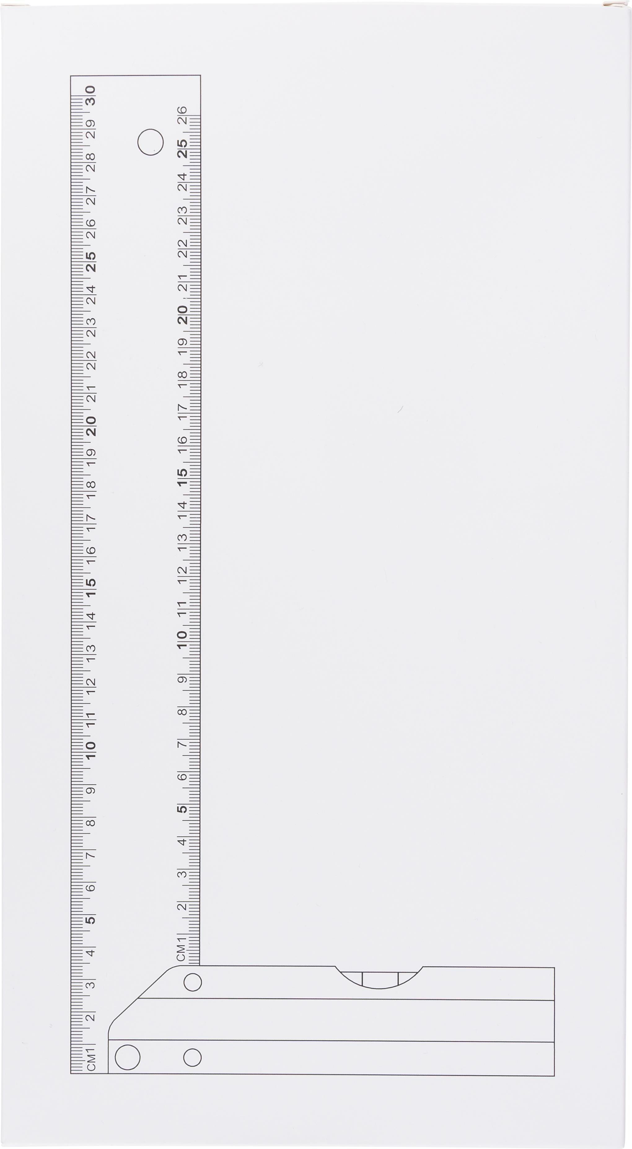 Aluminium-Dreieck mit integrierter Wasserwaage. Es ist 30 cm lang und verfügt über eine deutliche Zentimeteranzeige. Dank des praktischen Designs eignet es sich perfekt für präzises Messen und Nivellieren. Es ist einzeln verpackt in einem braunen Karton mit Abbildung.