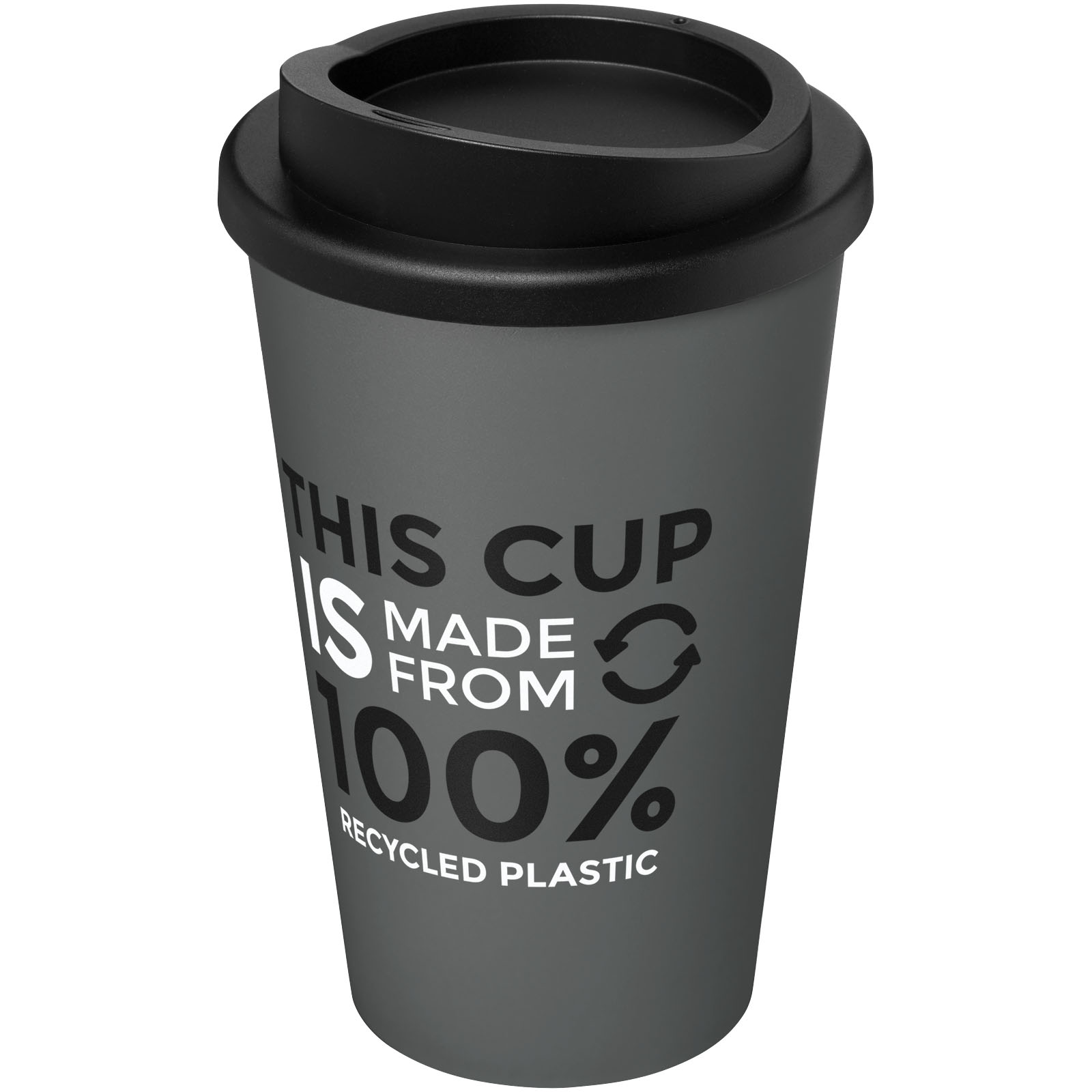 Eine großartige Lösung auf der Suche nach nachhaltigem Trinkgeschirr! Dieser doppelwandige Isolierbecher besteht aus 100 % recyceltem Material, das vollständig recycelbar ist. Er wird mit einem drehbaren Deckel geliefert und ist von innen schwarz. Aufgrund der Beschaffenheit von recyceltem Kunststoff kann es zu kleinen farblichen Nuancen und Farbabweichungen kommen. Das Fassungsvermögen beträgt 350 ml. Hergestellt in UK. Verpackt in einem recycelten PE-Kunststoffbeutel. BPA-frei.