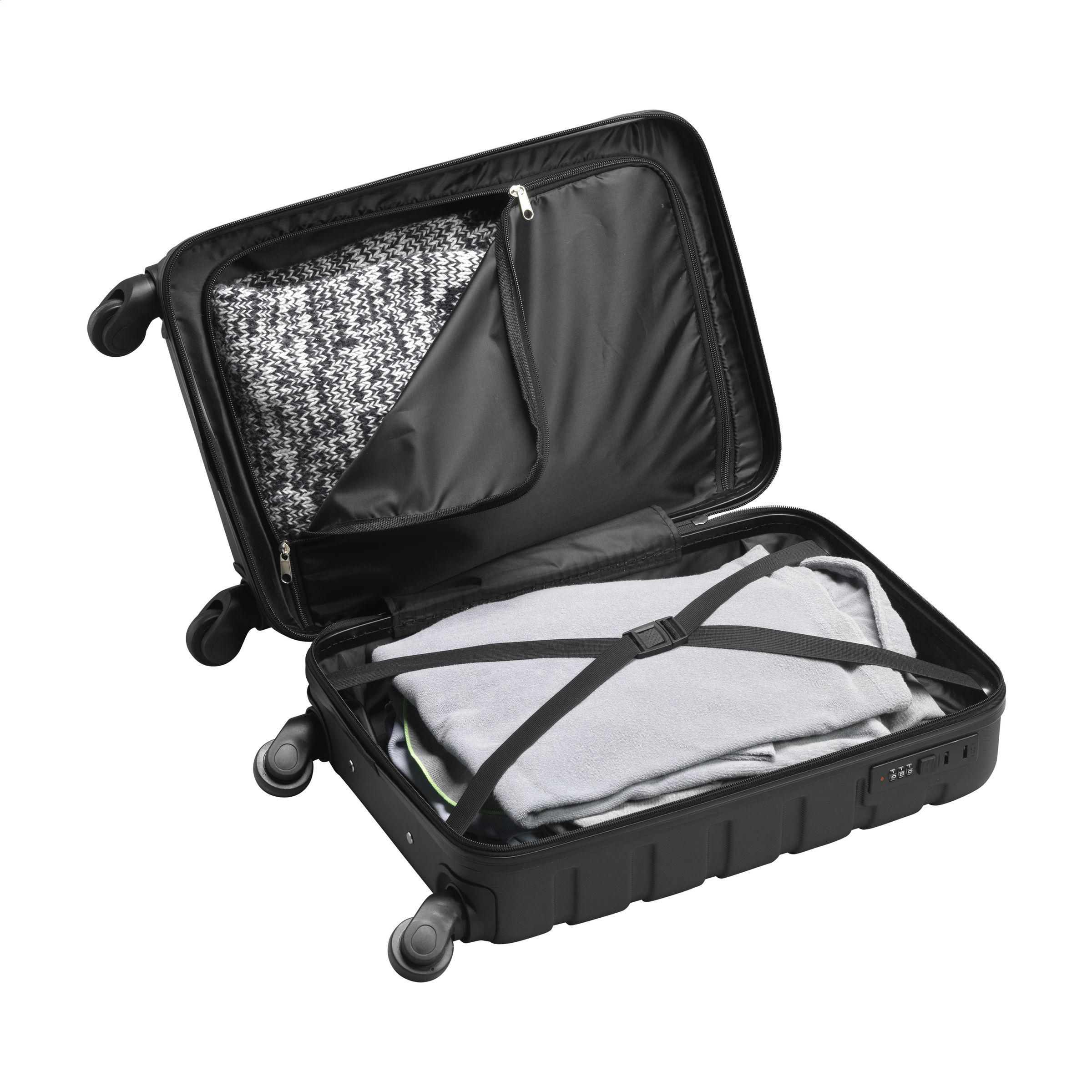 Trendiger, leichter Trolley aus 100% GRS-zertifiziert recyceltem ABS. Die Innenseite ist mit recyceltem 210D-Polyester ausgekleidet. Mit geräumigem Hauptfach, 4 Rädern, erweitertem Metalgriff und Zahlenschloss. GRS-sertifisert. Totalt resirkulert materiale: 52%. Fassungsvermögen ca. 30 Liter.