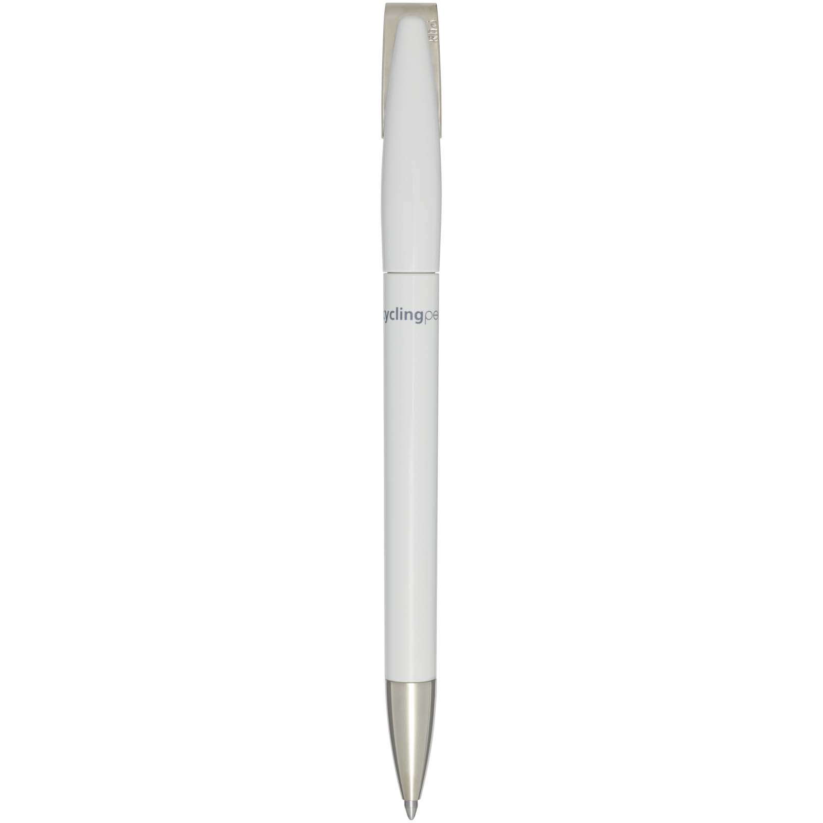 Kugelschreiber mit Schaft aus recyceltem Kunststoff, Edelstahlspitze und -clip. Tintenfarbe: Blau. Schreiblänge: 3000 Meter. Strichstärke: 1,00 mm. Hergestellt in Deutschland.