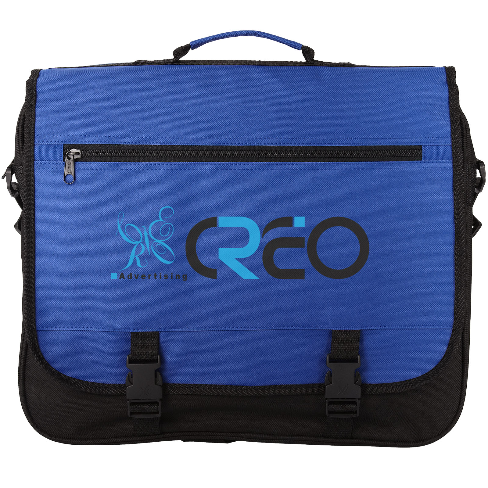 Messetasche mit einstellbarem Schulterriemen, Klappe mit Schnallenverschluss, Reißverschlussfach in der Klappe, Hauptfach mit Reißverschluss und mehreren offenen Fächern unter der Klappe.