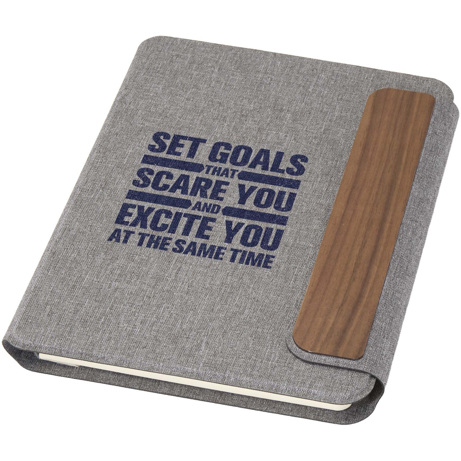 Das Andean A5-Portfolio besteht teilweise aus RCS-zertifiziertem recyceltem Polyester aus Verbraucherabfällen und bietet so eine nachhaltigere Alternative durch die Reduzierung des Bedarfs an Neumaterialien. Das Design überzeugt mit einem eleganten grauen Hardcover mit abgerundeten Ecken und präziser Schweißtechnik. Ein Magnetverschluss mit einem edlen Detail aus Walnussholz verleiht dem Portfolio eine moderne, anspruchsvolle Note. Im Inneren befindet sich ein herausnehmbares Softcover-Notizbuch mit 64 cremefarbenen, liniertem Seiten aus 80 g / m² Papier aus verantwortungsvollerer Herkunft. Verpackt in einer Papierbanderole in Kraftpapieroptik.