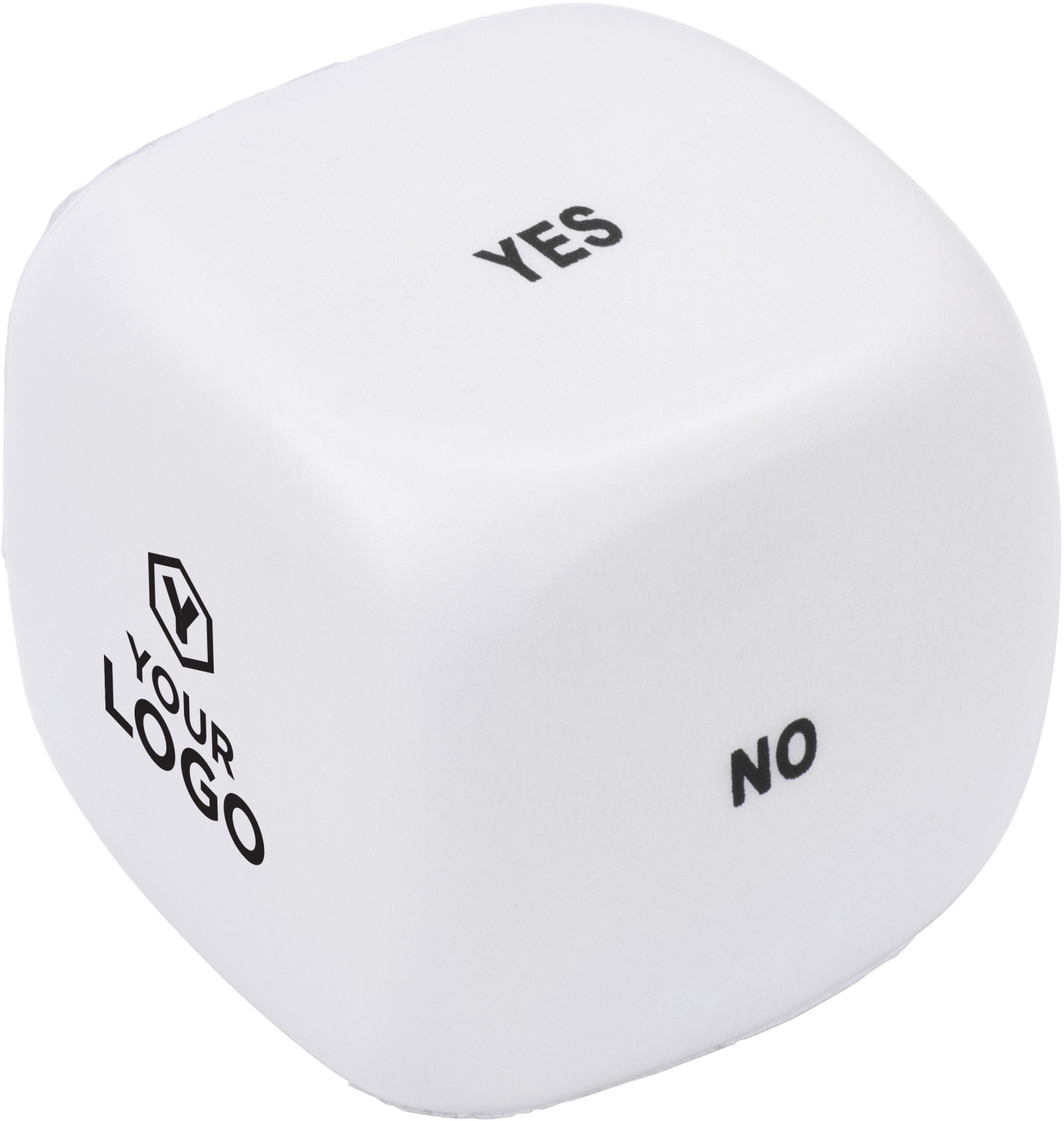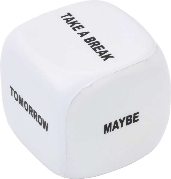 Anti-Stress Würfel zur Entscheidungsfindung aus PU Schaum, mit einer leeren Seite für die Werbeanbringung. Anti-Stress-Artikel können nur in den Farben Schwarz, Weiß, Gold oder Silber bedruckt werden.